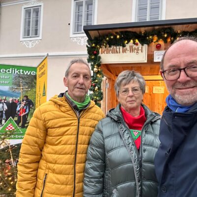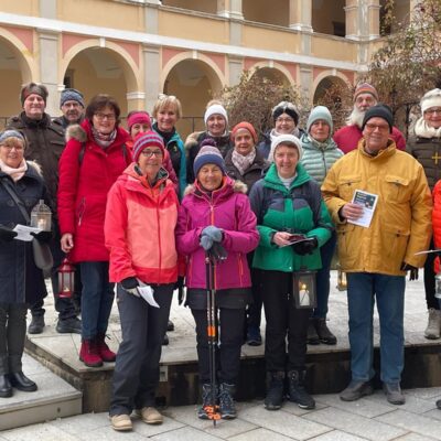 Nur einen Kilometer Luftlinie entfernt von unserem Ziel Melk, welches jedoch am Samstag tatsächlich erst nach einer 6 km Pilgerwanderung erreicht wurde. Diesmal jedoch bei leichtem Nieselregen, was jedoch für die Gruppe keinerlei Probleme bereitete. Melk – Weltkulturerbe – ist immer einen Besuch wert und so nahmen sich die Pilger*innen auch viel Zeit um das Stift, die Kirche und die Gärten zu besichtigen. Nach einer letzten gemeinsamen Kaffeerast hieß es Abschiednehmen –sowohl von den oberösterreichischen Pilgerinnen als auch von Bernhard und die übrigen Pilgerinnen wurden sicher wieder von „Chauffeur“ Christian nach Kärnten gebracht.
