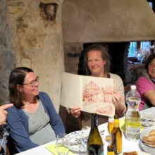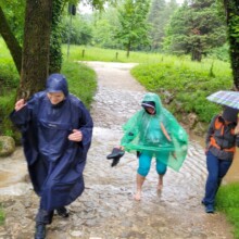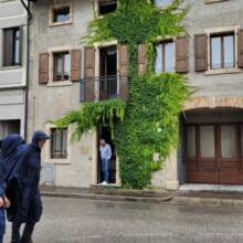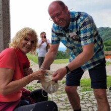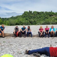 Auch am Dienstagmorgen begann nach einem köstlichen Frühstück die Pilgerwanderung bei leichtem Regen und führte zuerst durch die Wein- und Obstfelder und den Wald nach Ragogna. Nach dem obligaten Kaffeestopp und der Besichtigung der Kirche führte der Weg über eine Brücke nach Pinzano und dann zur Mittagsrast direkt am Tagliamento, mit der Möglichkeit für ein Fußbad, welche einige bei bereits warmem Sonnenschein auch nutzten.