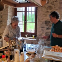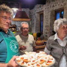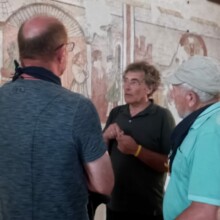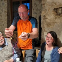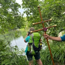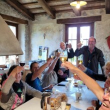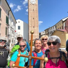 Der Montag begann mit einer kurzen Andacht und die Pilger setzten sich bei leichten Regen in Bewegung. Die erste Etappe führte nach Osoppo, wo eine kurze Rast gehalten wurde; Nach der Besichtigung der Kirche ging es entlang des Flusses Tagliamento durch den Orchideenpark nach San Tomaso. Dort wurden sie bereits von den Mitarbeitern Marino und Luciano willkommen geheißen. Während sich die Pilger in der modernst neu renovierten Pilgerherberge „Hospitale di San Gionanni“ erfrischten, bereitete Kitty mit ihrem Team das Abendessen vor, welches allen vorzüglich mundete.