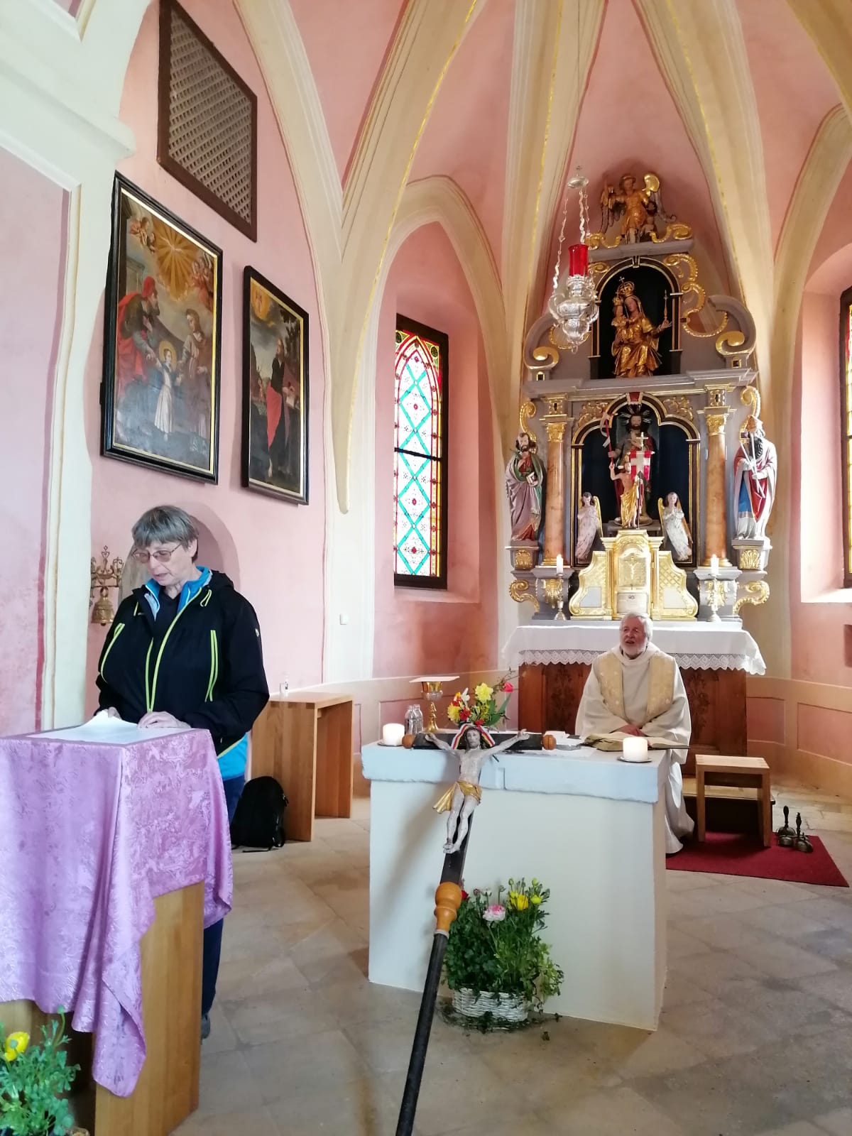 Heuer versammelten sich ca. 120 Menschen aus nah und fern um gemeinsam diesen Pilgertag zu begehen. Begonnen wird mit einem Morgenlob, danach erfolgt unter Glockengeläute der gemeinsame Auszug. Betend geht es bergabwärts, immer das Kreuz voran. Nach der Überquerung der Lavant führt der Pilgerweg auf der anderen Talseite bergauf durch einen Laubwald, wo das frische Grün von den Pilger:innen als sehr wohltuend empfunden wird. Nach einer kurzen Rast am Fuß des Josefsberg beginnt der nächste Aufstieg zur Kirche, welche dem hl. Josef geweiht ist.