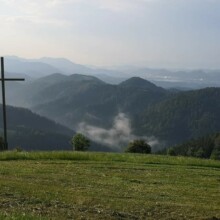 Nach einer Morgenandacht bei einem Kreuz über der Gostilna Pečolar mit wunderbarer Sicht nach Süden, wurden der Segen aus allen Himmelsrichtungen empfangen, und die Pilgerinnen spendeten sich wieder gegenseitig den Segen für den vor ihnen liegenden Weg.