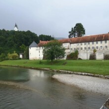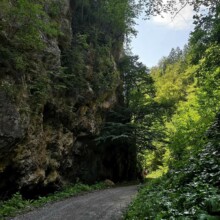 Ausgerastet machten sich die Pilgerinnen an den steilen Abstieg in eine Schlucht, in deren hinteren Ende die Steinzeithöhle Mornova zijalka es wert ist kurz vom Benediktweg abzuweichen. Weiter trugen die Füße durch Siedlungsgebiete, bevor nach den letzten Anstiegen des Tages plötzlich Mozirje zu Füßen lag. Mit der Aussicht, dass dort der Kleinbus der Diözese geparkt ist, mobilisierten die erschöpften Pilgerinnen noch einmal alle Kräfte. Die Hälfte der Gruppe nutzte das Angebot, die letzten Kilometer bis Nazarje mit dem Bus zu fahren, währen die andere Hälfte sich eilig aufmachte, um dem dräuenden Gewitter davon zu pilgern. Der wunderbare Weg entlang der Savinja konnte ob des schnell einsetzenden Regens leider nicht voll genossen werden, bot aber trotzdem spektakuläre Ausblicke.