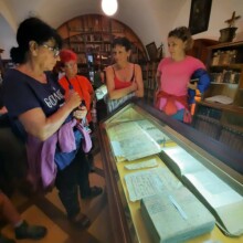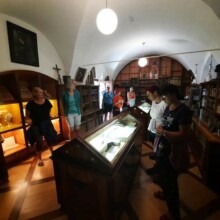 Im Kloster in Nazarje fand gerade ein Kinderlager statt, und so konnte die Schlussbetrachtung der beiden Tage nicht in der Kirche stattfinden, aber der Klosterinnenhof bot einen passenden Ersatz. Frau Sara Bastl vom Verein „Benedikt-be-wegt“ begrüßte die Gruppe, und übersetzte die kurze Führung durch die sehenswerte Bibliothek im Kloster, und den spontanen Pilgersegen, den Pater Tomaš spendete.