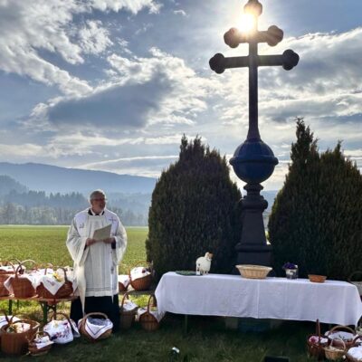 Nach einer Morgenandacht bei einem Kreuz über der Gostilna Pečolar mit wunderbarer Sicht nach Süden, wurden der Segen aus allen Himmelsrichtungen empfangen, und die Pilgerinnen spendeten sich wieder gegenseitig den Segen für den vor ihnen liegenden Weg.