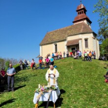 Bei der Familie Ebner vlg. Hudl wurde eine kurze Rast gehalten, bevor es dann zur Josefsbergkirche ging, wo P. Cyprian die Teilnehmer erwartete. Dort fanden sich auch Schüler:innen des Stiftsgymnasiums ein und feierten mit den Pilger:innen eine gemeinsame Wortgottesfeier. Diese endete mit einer Segnung von Broten, welche beim Ausgang verteilt wurden. Bei der darauffolgenden Rast gab es viel Gelegenheit für Gespräche und einen regen Austausch. Viele langjährige Pilger- und Wanderfreunde hatten sich gefunden und gut erholt ging es dann wiederum betend zur dritten Station, der Kirche am Johannesberg. Auf Grund der großen Anzahl endete in diesem Jahr die Wallfahrt mit einer „Feldmesse“, welche von P. Marian Kollmann zelebriert wurde. Musikalisch sorgte auch hier Hans Kopp für die passenden Lieder.