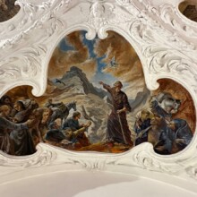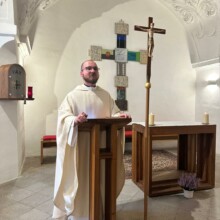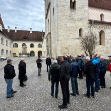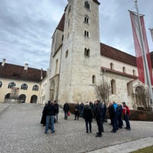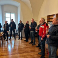 In der Benediktus-Kapelle wurde dann eine Messfeier von Pfarrer Ivan Hrastnik gefeiert, die mit viel Gesang der Gruppe selbst gestaltet wurde. Nach einem Rundgang in die Sakristei, die Rabensteiner-Kapelle und das Winterrefektorium lud P. Siegfried zu einer Agape ein. Es gab Stiftswein aus den stiftseigenen Weingärten nahe Maribor in Slowenien und herrliche Brötchen und Reindling. P. Siegfried verwies auf die Fresken im Sommerrefektorium mit der Darstellung, wie gut der Wein in Slowenien wächst und ein Geschenk des Himmels ist.