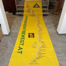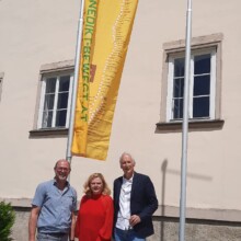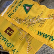 In einem bescheidenen Festakt hissten Vorstandsmitglieder des Vereins Benedikt be-WEG-t in Anwesenheit von Stiftspfarrer P. Thomas Petutschnig OSB und spirituellem Begleiter P. Siegfried Stattmann OSB zwei neue Benedikt-Pilgerwegfahnen nach der Sonntagsmesse. Auch Stiftskapellmeister Stjepan Molnar legte nach einem Gebet Hand an und zog die Fahne vor der Stiftspfarre auf. Weitere Mitglieder und Messebesucher weilten der Zeremonie bei und unterhielten sich bei einem Gläschen Stiftswein. Die leuchtend gelben Fahnen, eine weitere hängt auch beim Hofrichtertor, schmücken nun das mächtige Stiftsgebäude.