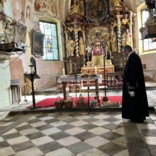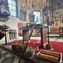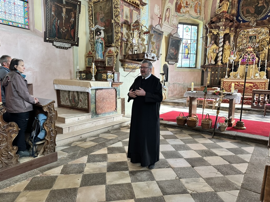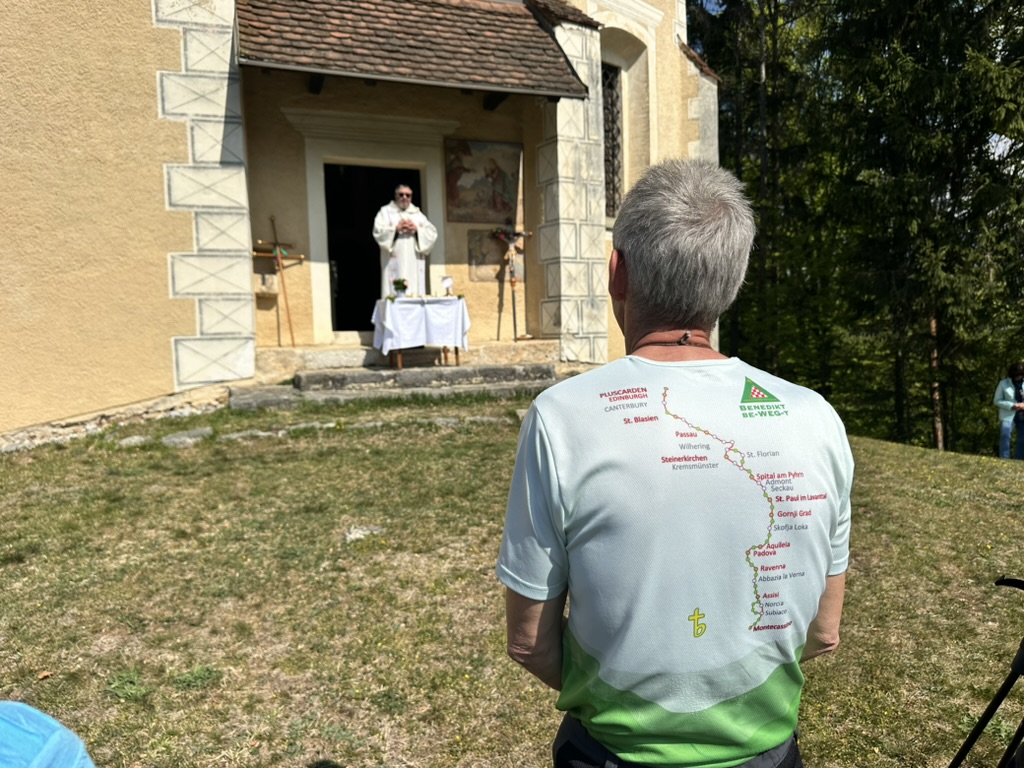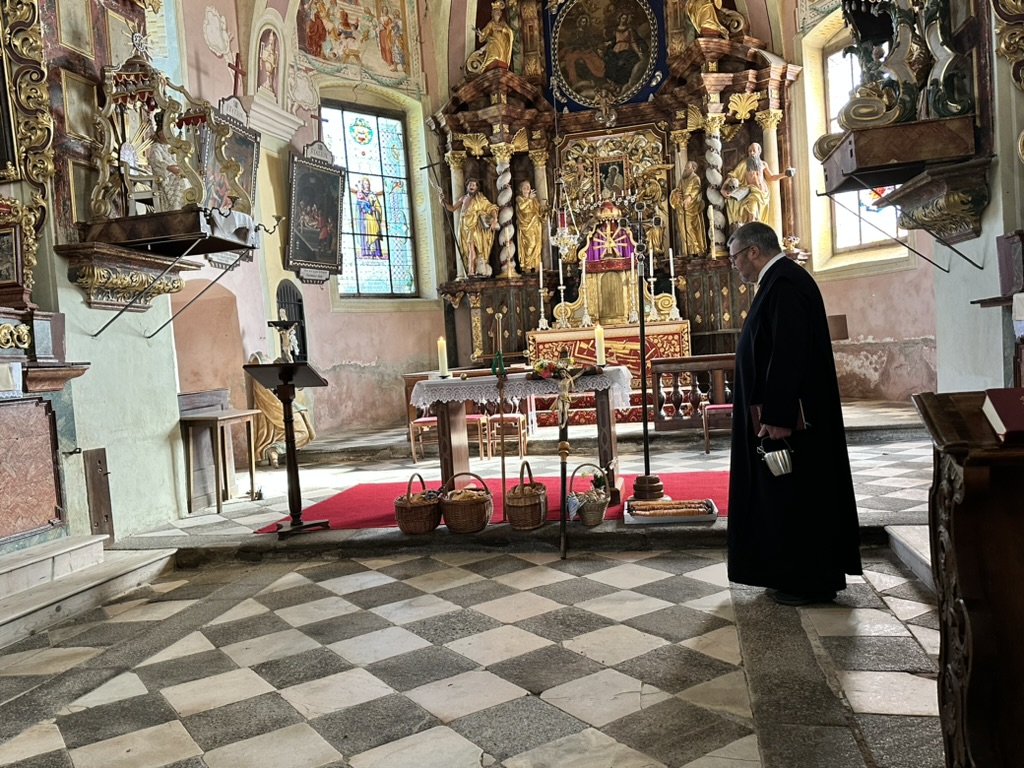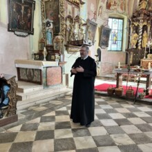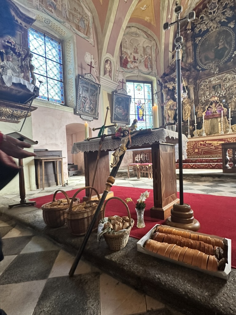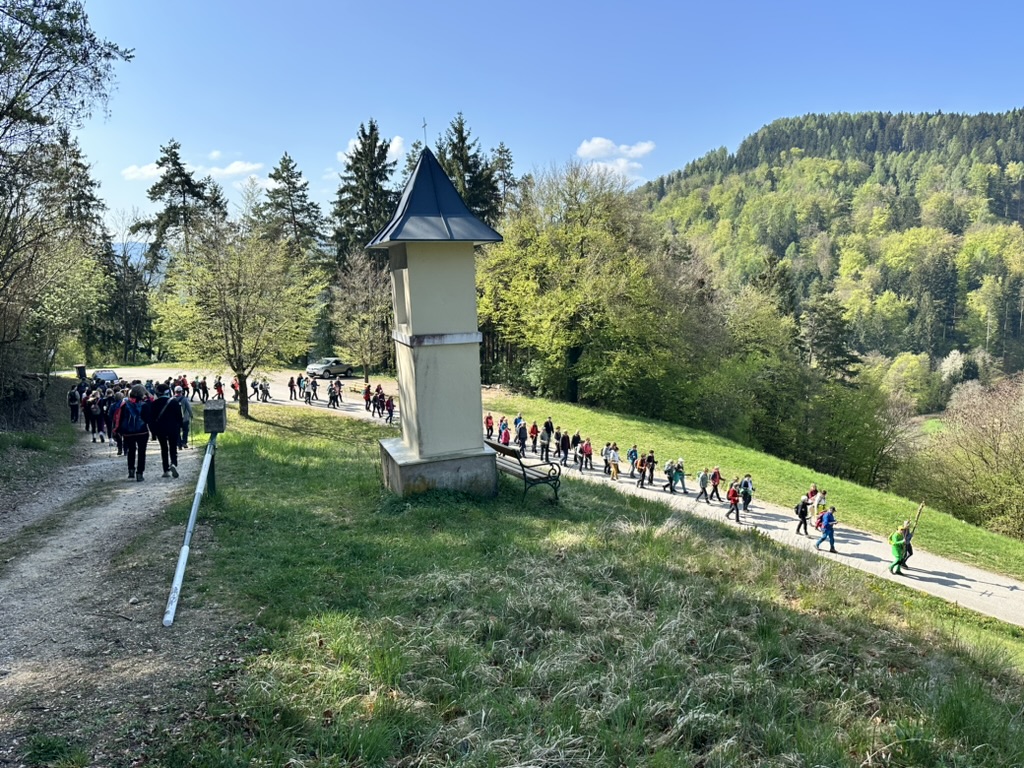 Es ging zunächst den Waldweg hinunter, der Talboden war noch in Nebel gehüllt, mystisch daher die Wanderung hindurch und dann beim Mayr am Hof vorbei hinauf zur 2. Station, der Kirche am Josefsberg. Dort feierte P. Thomas Petuschnig OSB mit uns eine Andacht und erläuterte das berühmte Hl. Wort von der Brotvermehrung. Es blieben 12 Körbe übrig, jeder Apostel erhielt demnach den Auftrag, einen Korb zu nehmen und hinauszugehen und den Menschen leibliche – und natürlich auch spirituelle – Speisen zu geben. Zumindest vier Körbe mit frischen Stangerln standen hinter P. Thomas beim Altar, er segnete diese und nach der Andacht und bei einer längeren Pause verzehrte die bereits um die SchülerInnen des Stiftsgymnasiums und weitere WallfahrerInnen angewachsene Gemeinschaft diese mit Genuss. Auch der Josefi-Kellner war geöffnet und viele kehrten dort zur Stärkung ein.
