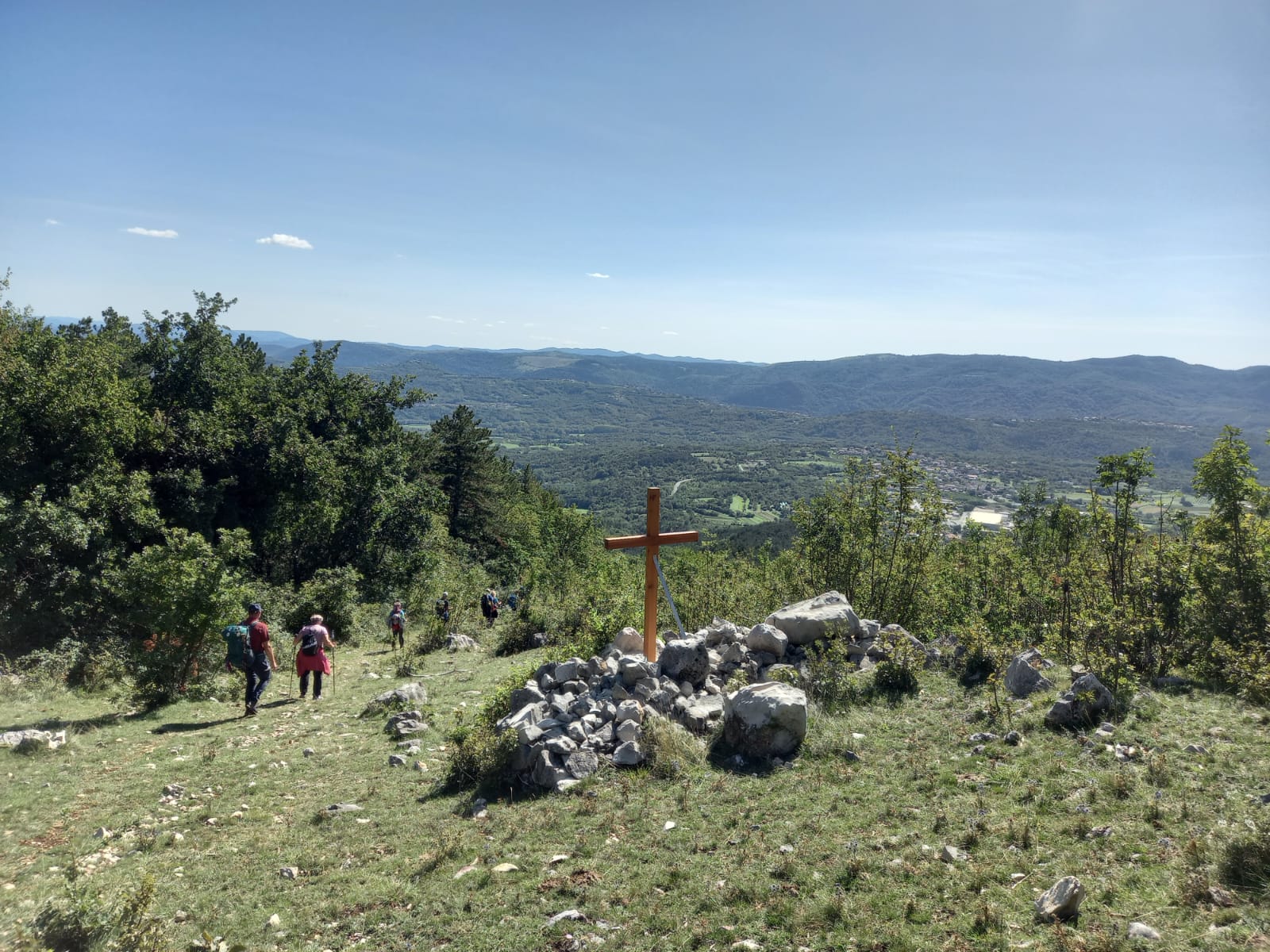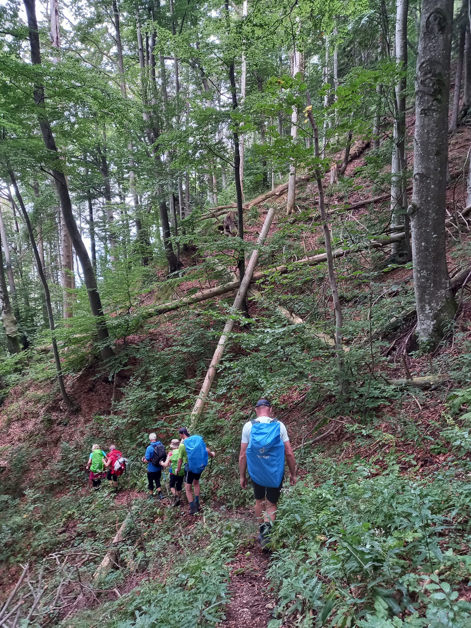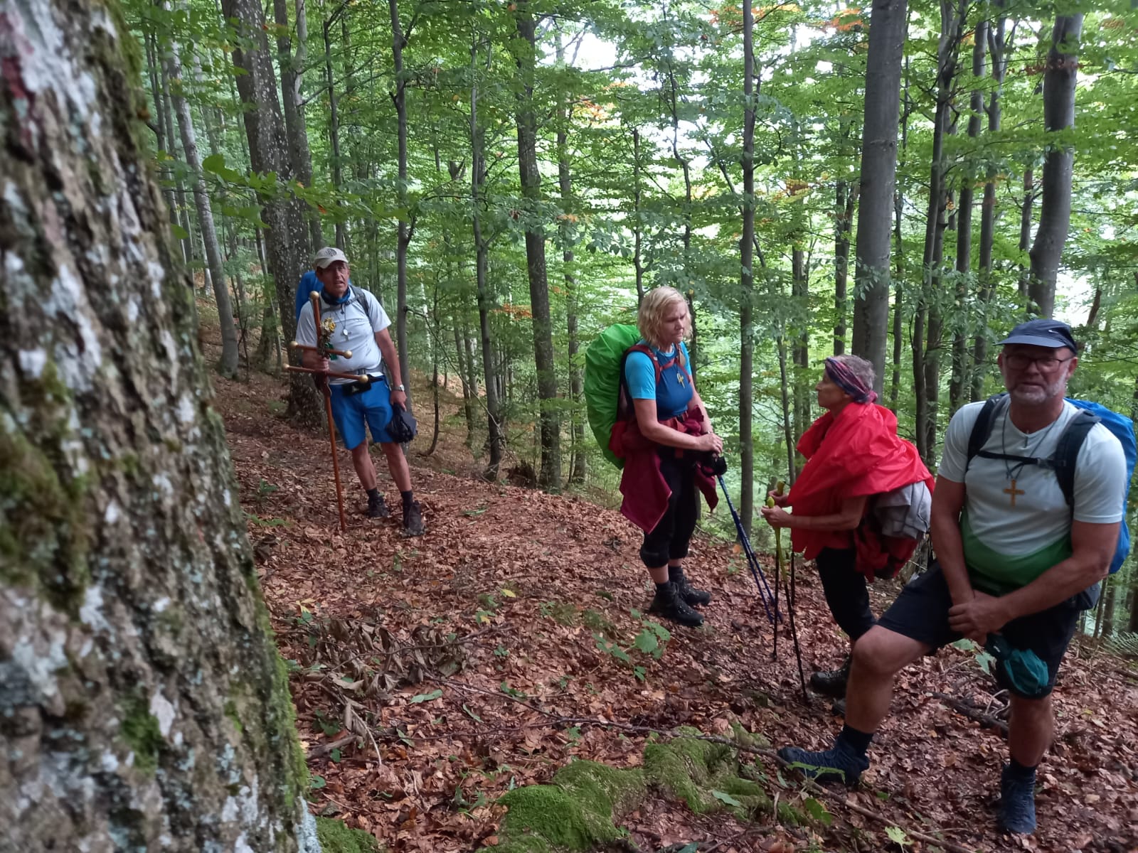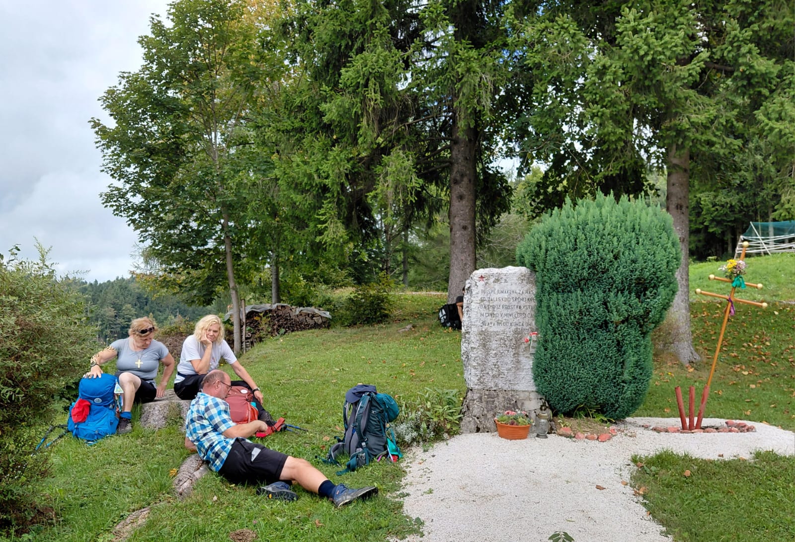 Auch die folgende fünfte Etappe hatte es in sich. Zunächst war ein Anstieg von 500 Höhenmetern von Sveta Ana hinauf auf den Mrzli vrh, wo einst die Grenze zwischen Italien und Slowenien zwischen den beiden Weltkriegen verlief, zu bewältigen. Das schaffte die Gruppe sehr bravourös. Nun ging es wieder sehr hügelig in einer herrlichen Landschaft auf Wald- und Wiesenwegen dahin. In Ledine fanden die Pilger :innen einem kleinen Platz mit einem Denkmal, der allerdings als Kraftplatz äußerst beruhigend wirkte. Bei einem leider wegen Urlaubs geschlossenen Gasthaus wurde Mittagsrast gehalten und die Reste des Abendmahls vom Vortag verzehrt, es blieb nichts übrig. Es ging nochmals hügelig weiter und dann stand eine steiler Abstieg in die Quecksilber-Stadt Idrija am Programm. Der Pfad hinunter war gefährlich, weil er durch Mountainbiker stark beschädigt wurde und keine Trittflächen mehr aufwies. Die Gruppe erreichte dennoch wohlbehalten ihr Tagesziel und bezog die Unterkunft mitten in der Stadt.