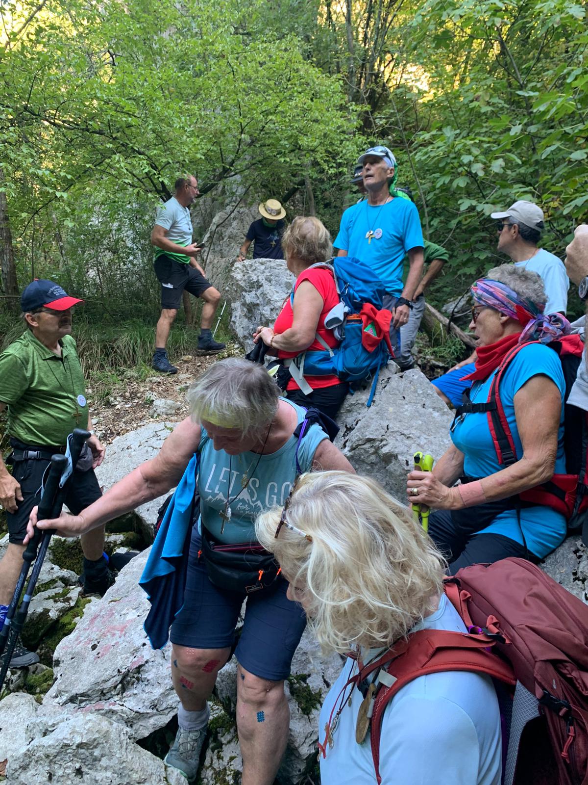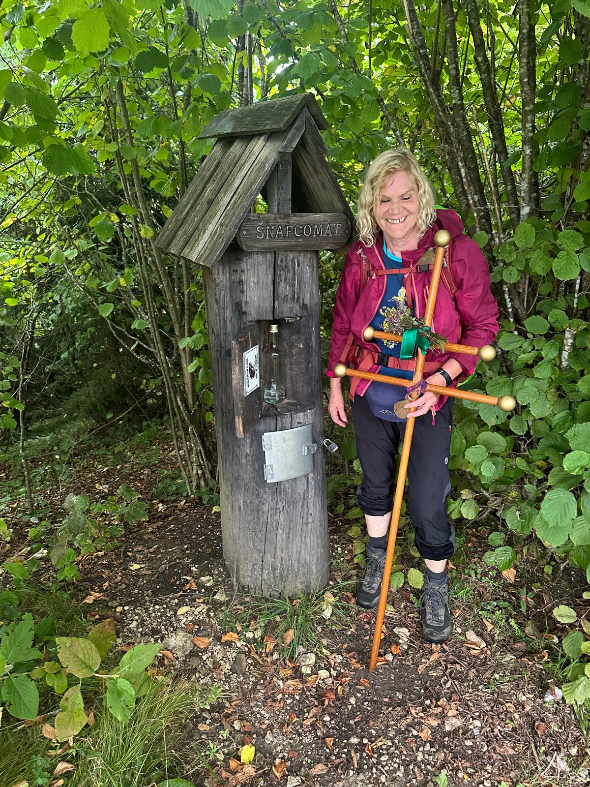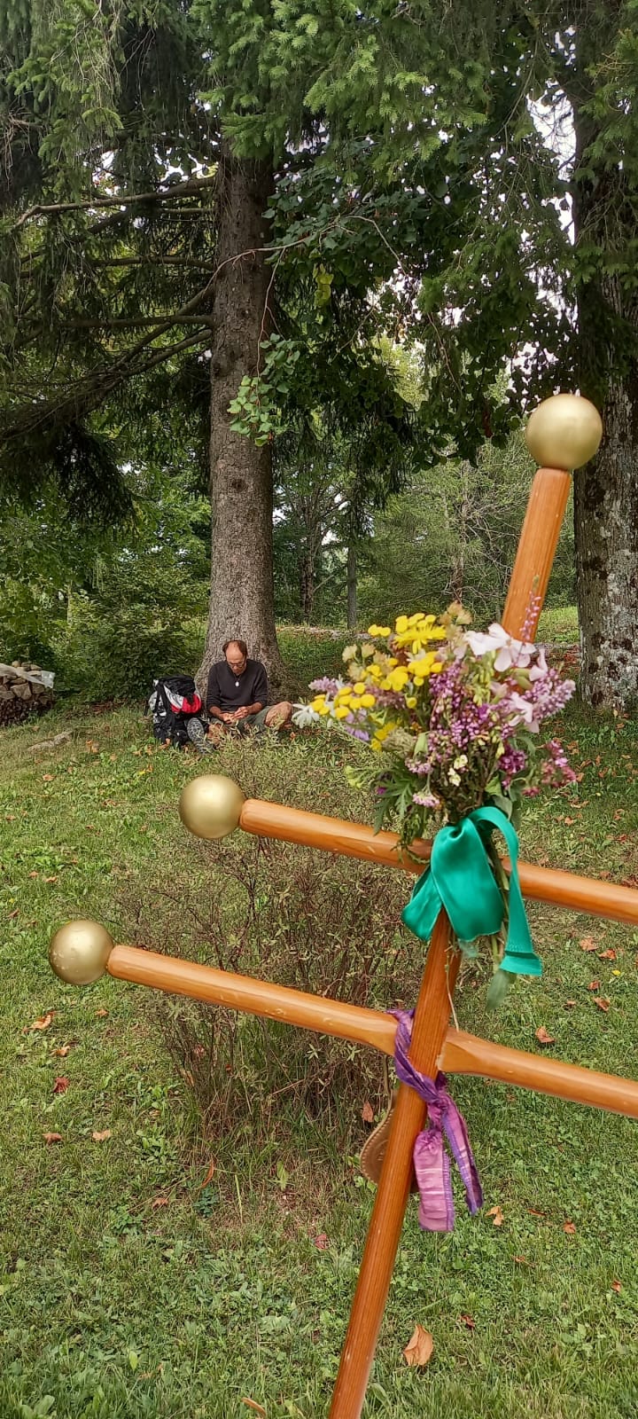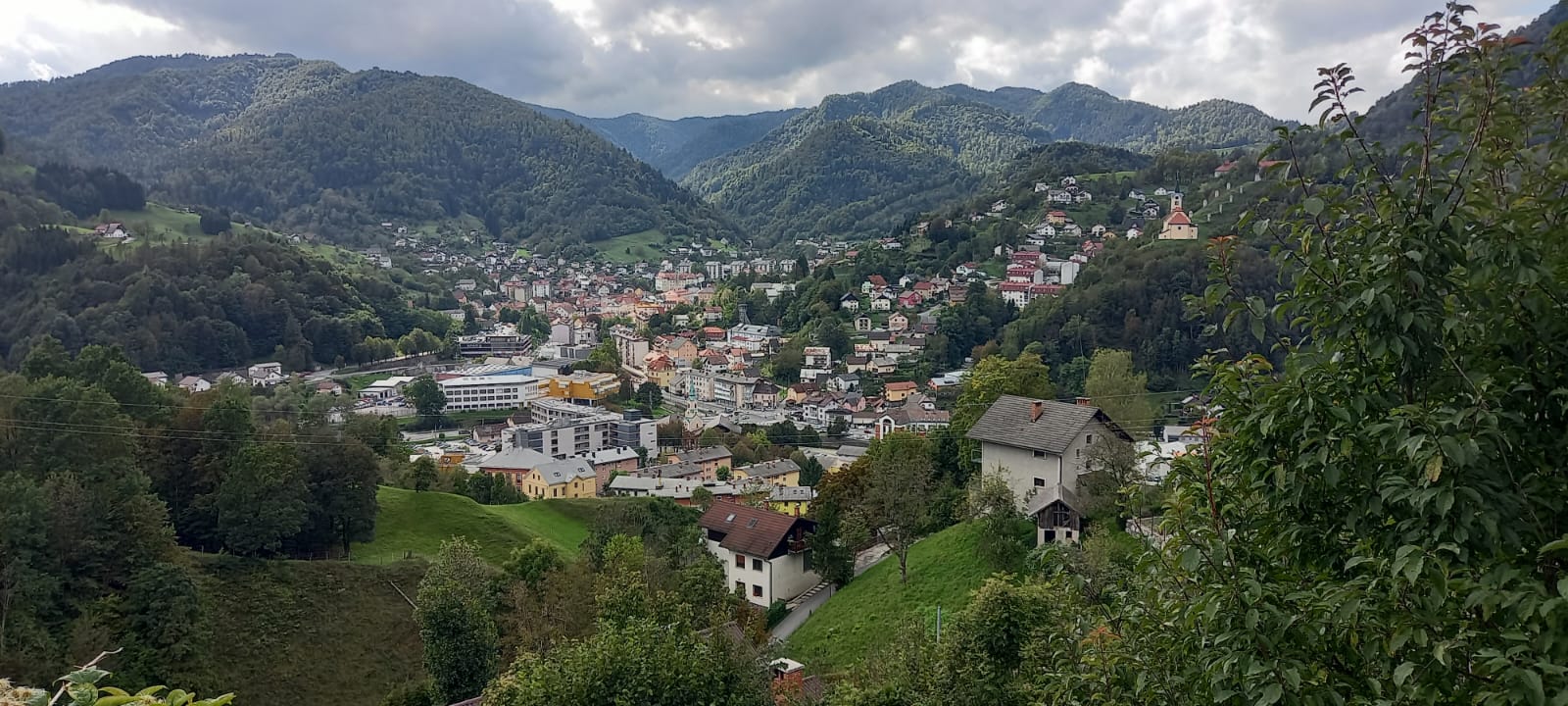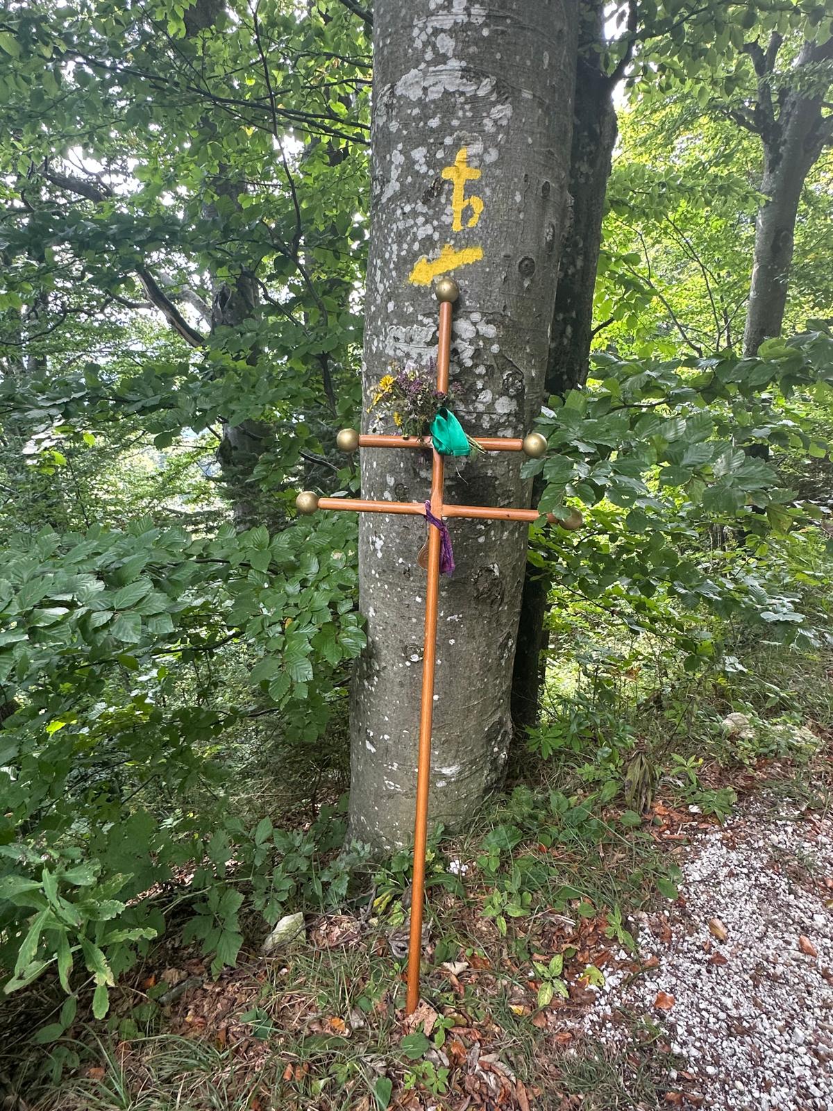 Auch die folgende fünfte Etappe hatte es in sich. Zunächst war ein Anstieg von 500 Höhenmetern von Sveta Ana hinauf auf den Mrzli vrh, wo einst die Grenze zwischen Italien und Slowenien zwischen den beiden Weltkriegen verlief, zu bewältigen. Das schaffte die Gruppe sehr bravourös. Nun ging es wieder sehr hügelig in einer herrlichen Landschaft auf Wald- und Wiesenwegen dahin. In Ledine fanden die Pilger :innen einem kleinen Platz mit einem Denkmal, der allerdings als Kraftplatz äußerst beruhigend wirkte. Bei einem leider wegen Urlaubs geschlossenen Gasthaus wurde Mittagsrast gehalten und die Reste des Abendmahls vom Vortag verzehrt, es blieb nichts übrig. Es ging nochmals hügelig weiter und dann stand eine steiler Abstieg in die Quecksilber-Stadt Idrija am Programm. Der Pfad hinunter war gefährlich, weil er durch Mountainbiker stark beschädigt wurde und keine Trittflächen mehr aufwies. Die Gruppe erreichte dennoch wohlbehalten ihr Tagesziel und bezog die Unterkunft mitten in der Stadt.