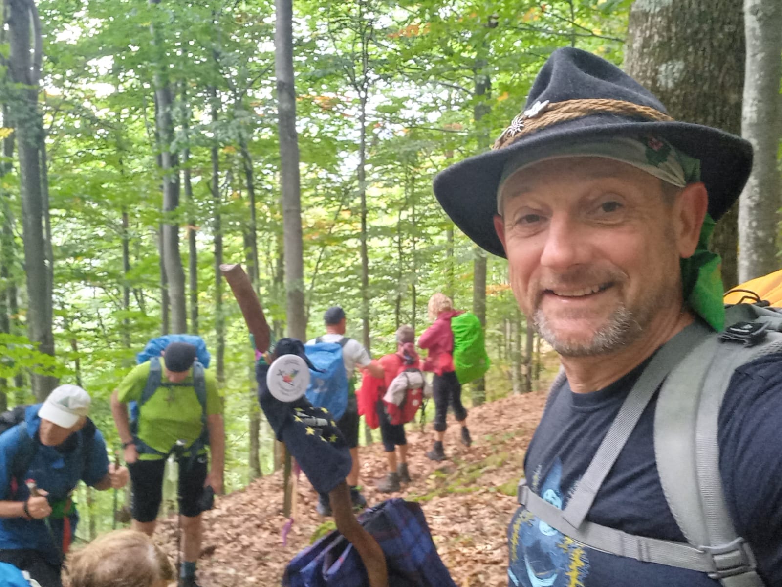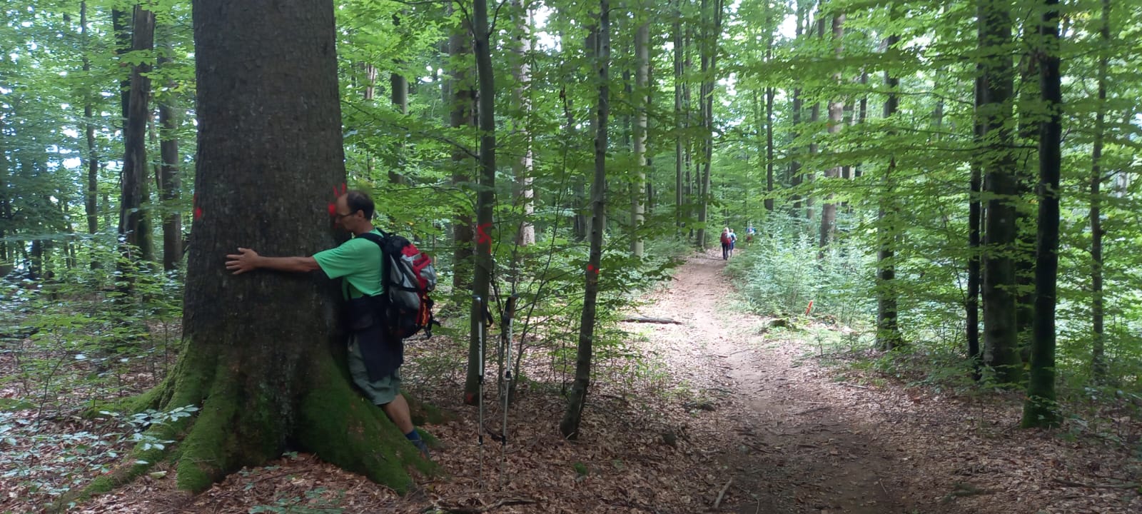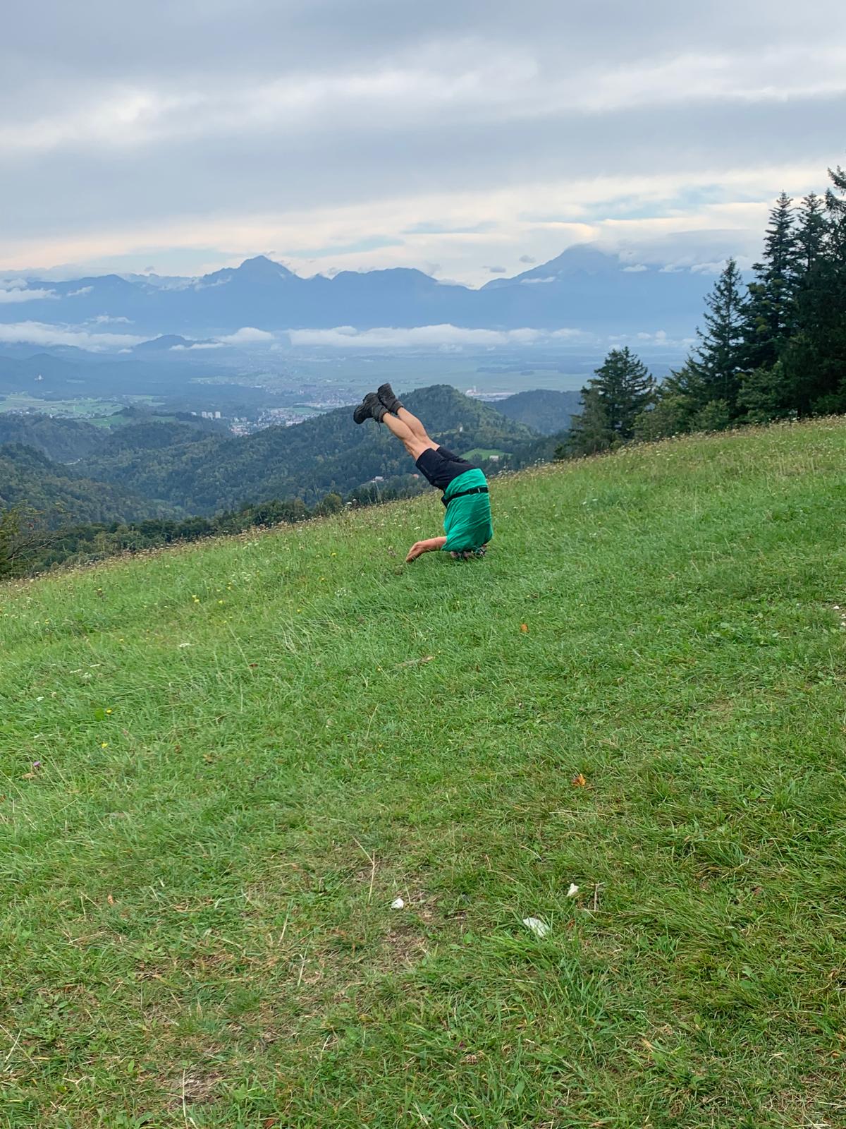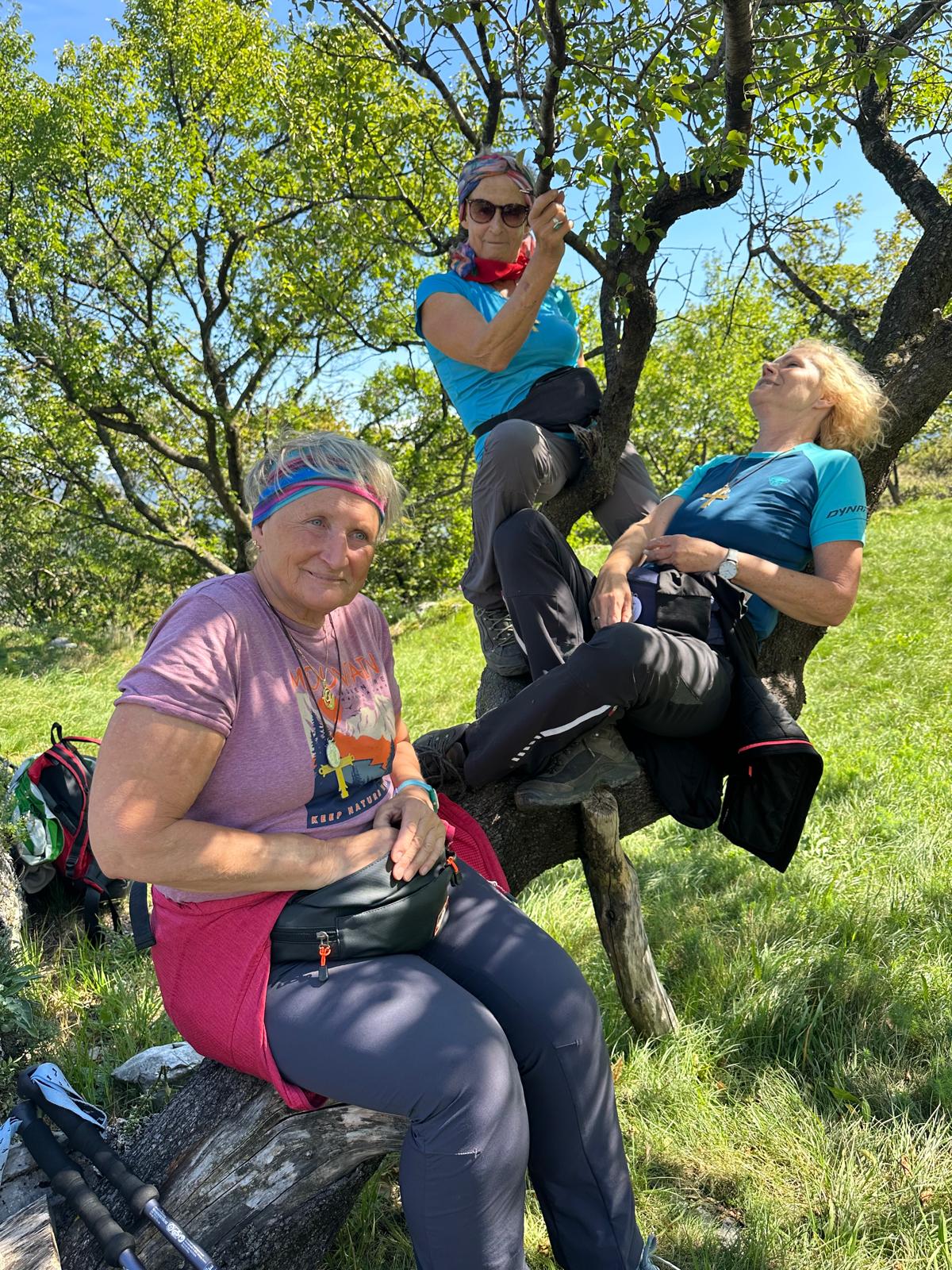 Auch die folgende fünfte Etappe hatte es in sich. Zunächst war ein Anstieg von 500 Höhenmetern von Sveta Ana hinauf auf den Mrzli vrh, wo einst die Grenze zwischen Italien und Slowenien zwischen den beiden Weltkriegen verlief, zu bewältigen. Das schaffte die Gruppe sehr bravourös. Nun ging es wieder sehr hügelig in einer herrlichen Landschaft auf Wald- und Wiesenwegen dahin. In Ledine fanden die Pilger :innen einem kleinen Platz mit einem Denkmal, der allerdings als Kraftplatz äußerst beruhigend wirkte. Bei einem leider wegen Urlaubs geschlossenen Gasthaus wurde Mittagsrast gehalten und die Reste des Abendmahls vom Vortag verzehrt, es blieb nichts übrig. Es ging nochmals hügelig weiter und dann stand eine steiler Abstieg in die Quecksilber-Stadt Idrija am Programm. Der Pfad hinunter war gefährlich, weil er durch Mountainbiker stark beschädigt wurde und keine Trittflächen mehr aufwies. Die Gruppe erreichte dennoch wohlbehalten ihr Tagesziel und bezog die Unterkunft mitten in der Stadt.