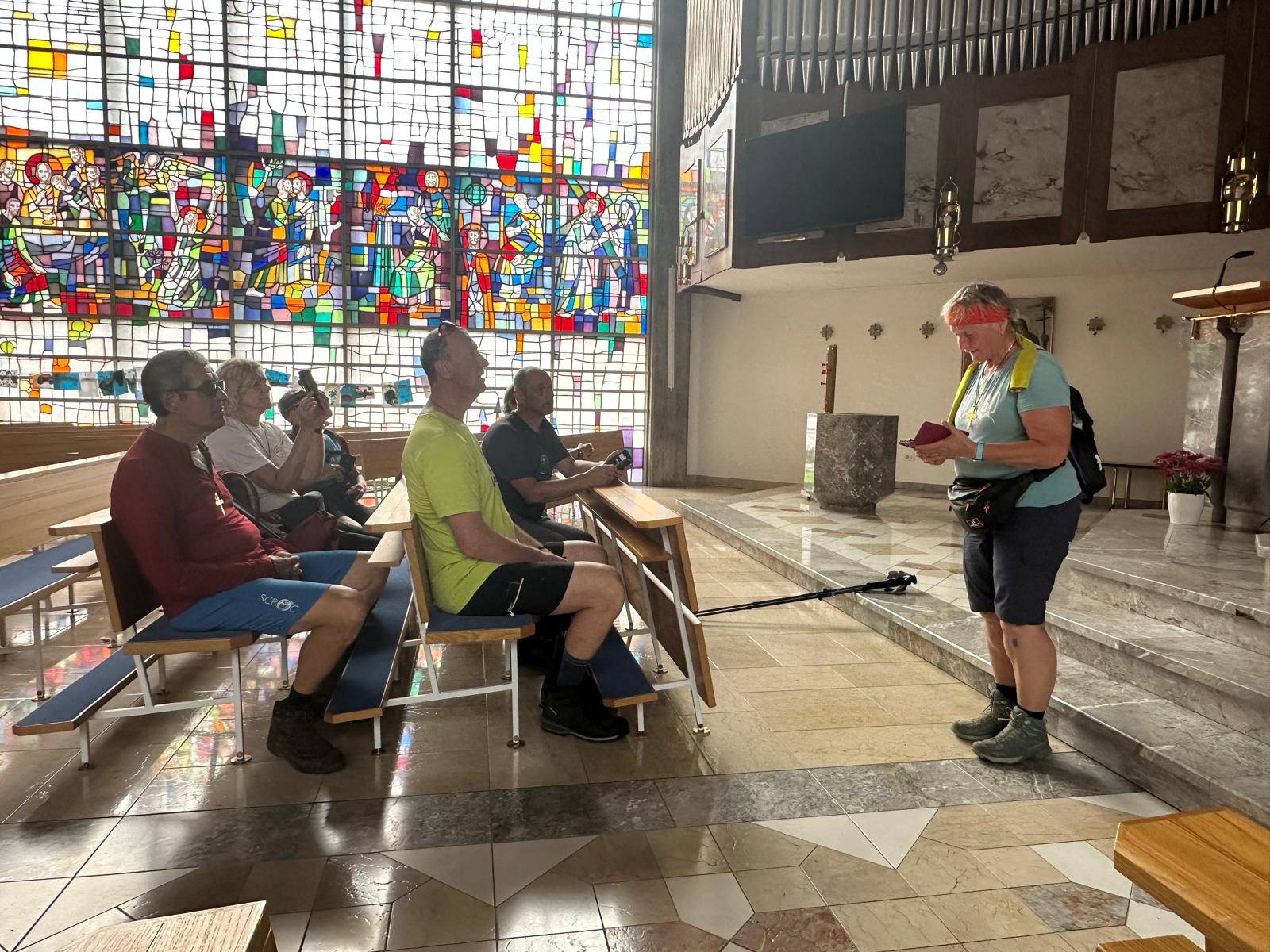 Ein weiteres Highlight war dann die Abschlussmesse in der modernen Kathedrale von Nova Gorica. Pfarrer Milan Pregelj gestaltete diese in Slowenisch, ließ aber Christian, unserem spirituellen Begleiter, viel Raum für die Ausführung. Sowohl Gesang als auch Lesung, Evangelium, Fürbitten und weitere Gebete durften wir in Deutsch machen. Martin begeisterte uns noch mit seinem irischen Segenslied. Wie schon bei dem von ihm organisierten Pilgerwanderung üblich brachte Hannes gravierte Benediktkreuze als persönliches Geschenk mit und Pfarrer Milan segnete diese. Jeder Teilnehmer erhielt dann von Hannes ein Kreuz umgehängt. Ein emotionaler Höhepunkt der Pilgerwanderung, als alle sich anschließend gegenseitig umarmten und auch die eine oder andere Freudenträne vergossen wurde. Pfarrer Milan holte den offiziellen Stempel der Pfarre und stempelte unsere Pilgerpässe.