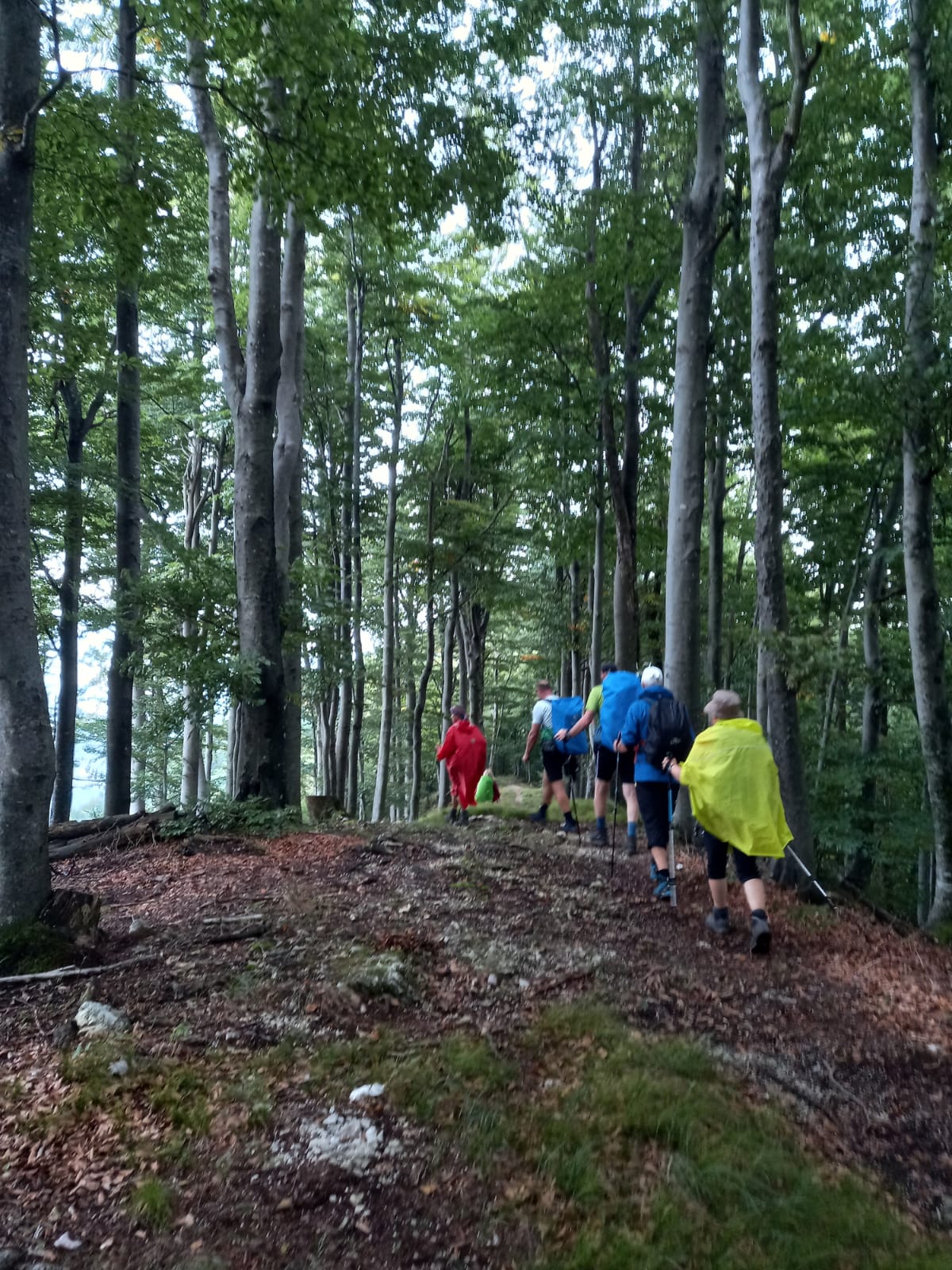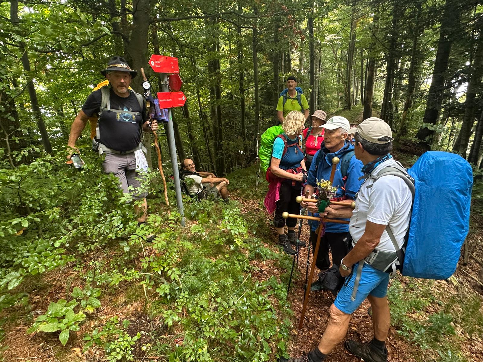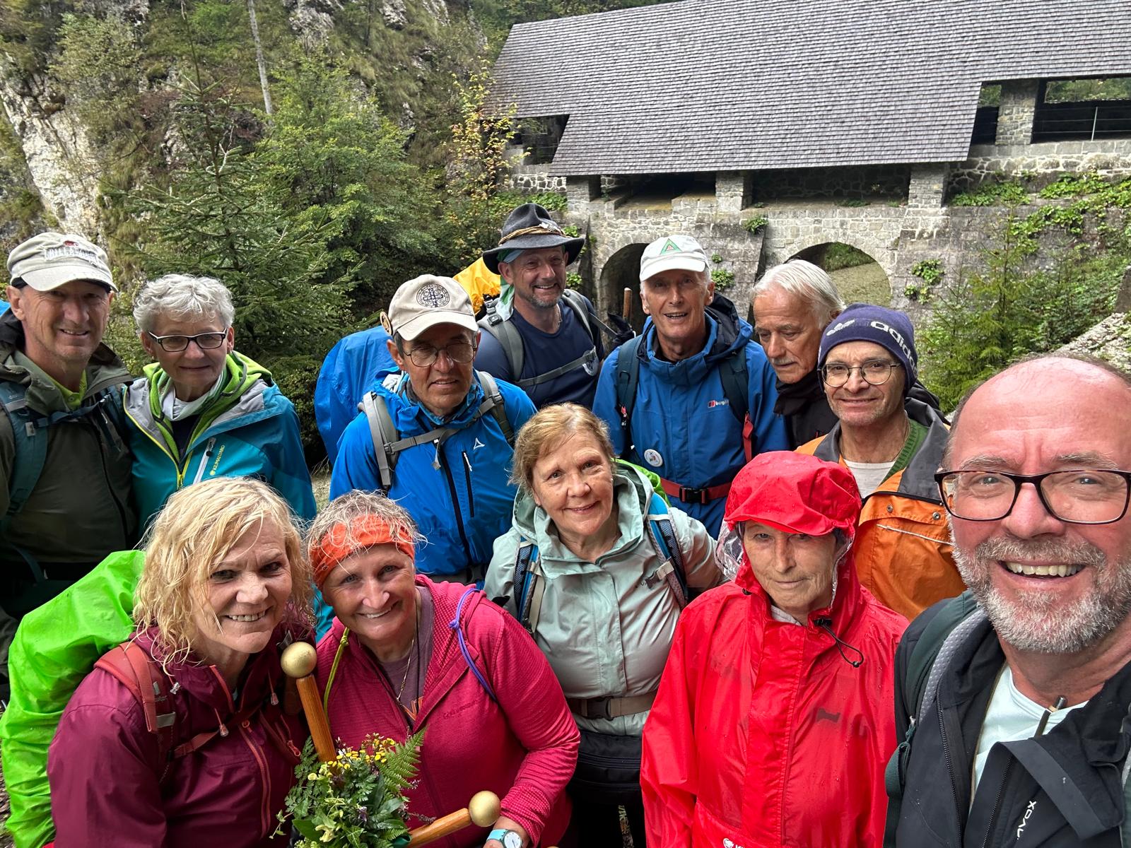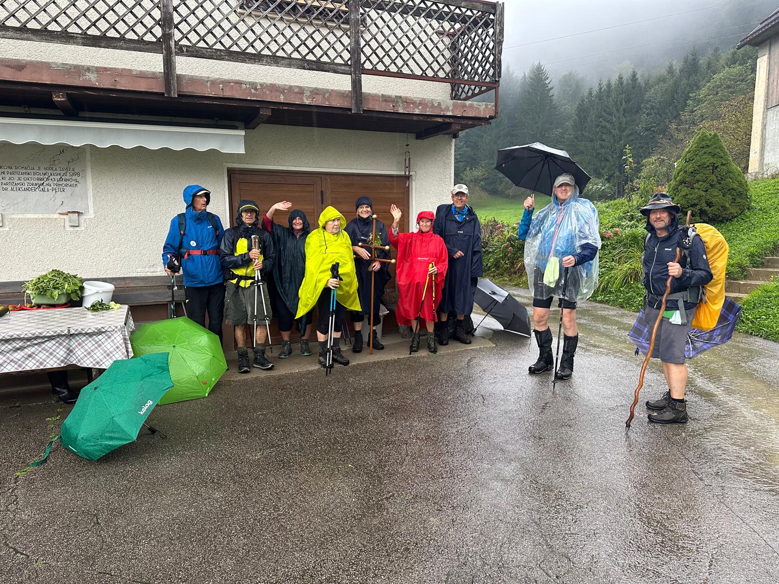 Am Dienstag, den 16. September, stand die Königsetappe am Programm. Auch diesmal versprach die Wetterprognose nichts Gutes. Beim ersten Aufstieg begleitete uns noch kurz die Sonne, beim zweiten mussten wir den Regenschutz auspacken. Auf der ersten Anhöhe mit dem ‚Schnapsomat‘ war der erste Regenguss wieder vorbei und wir konnten die weitere hügelige Wanderung gut fortsetzen. Glücklicherweise hat Silvio unseren alten Bekannten Danilo Mohoric gefragt und Unterstände organisiert, es begann nämlich heftig zu regnen. Es half nichts, wir mussten weiter, aber glücklicherweise hörte der Regen auf dem Weg in den Idrijca-Graben beim vlg. Trattnig auf, dort spendete die Bäuerin frische Birnen. Bis zur Klause Idrijca blieb es trocken. Dort angekommen begann es wieder zu regnen und wir konnten unsere Mittagsrast unter dem Dach der schönen Klause abhalten. Der weitere Pfad, teilweise direkt über kleine Inseln in der Idricija, führte uns über insgesamt 14 querende Bächlein und Furten. Andreas musste wieder einspringen und uns durch den stark wasserführende Idricija helfen. Von da ging es wieder steil bergauf, auch eine lange asphaltierte Straße, wo Ernst beinahe seinen Rucksack vergaß. Dann fiel Nebel ein, es wurde kälter und Hannes traf die Entscheidung, heute nicht auf den Gipfel des Mali Golak zu gehen. Wir hätten auch nichts gesehen und der Weg wäre über den steinigen Pfad sehr beschwerlich gewesen. Stattdessen folgten wir der nahezu ebenen Forststraße und gingen zur Gänze den Mali Golak, die höchste Erhebung nördlich des Vipava-Tales rund herum. Es nahte schon wieder ein Gewitter, die Schritte wurden immer flotter, so dass wir noch rechtzeitig die Almhütte Mali Golak trocken erreichten.