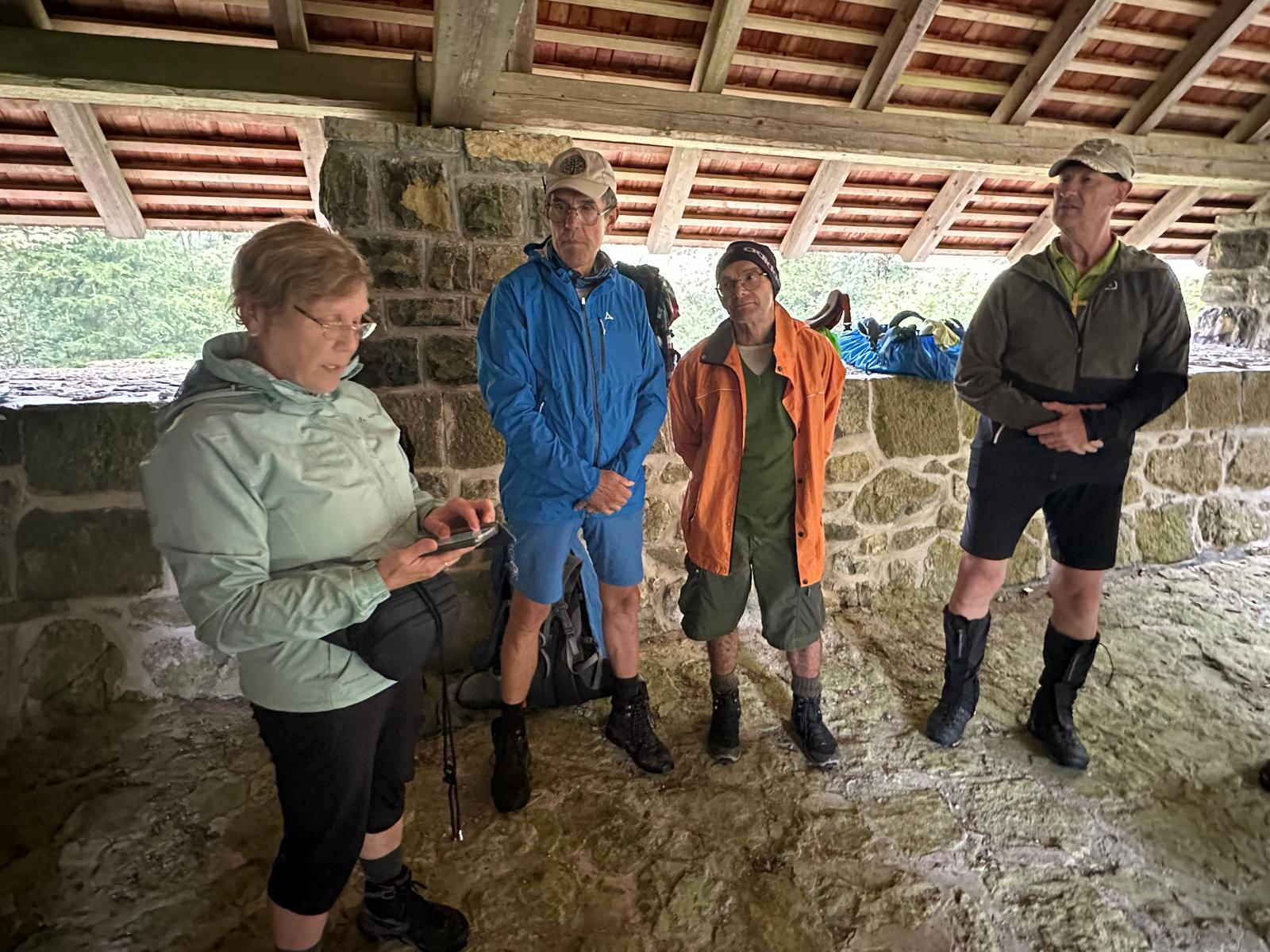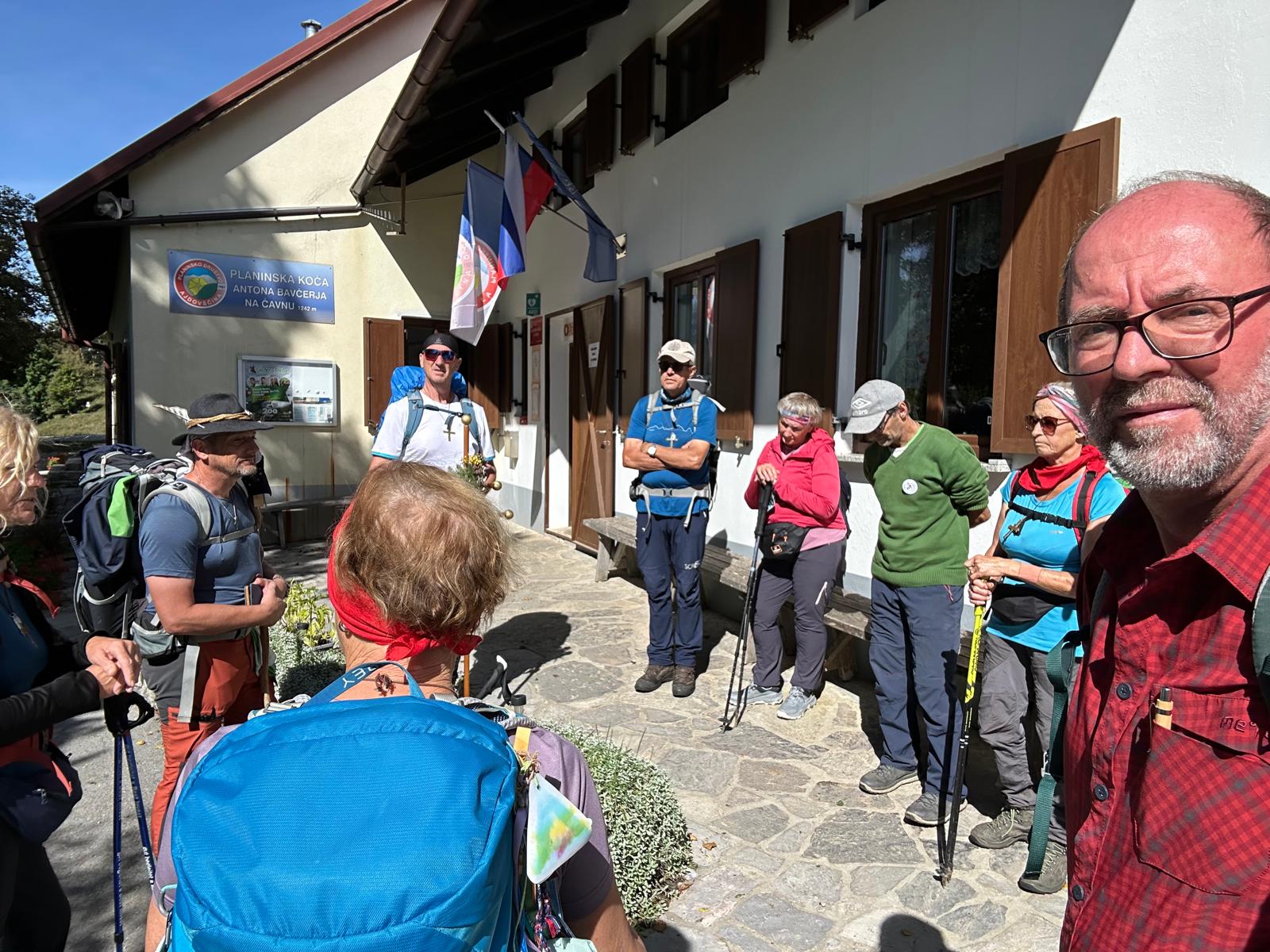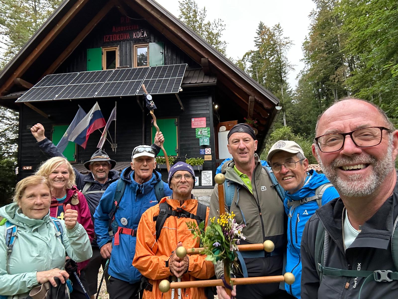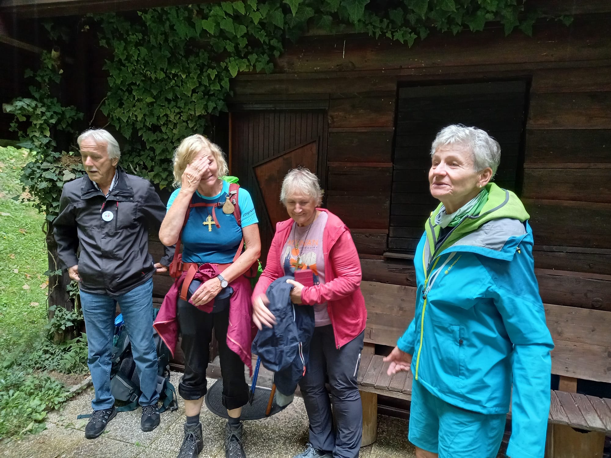Am Dienstag, den 16. September, stand die Königsetappe am Programm. Auch diesmal versprach die Wetterprognose nichts Gutes. Beim ersten Aufstieg begleitete uns noch kurz die Sonne, beim zweiten mussten wir den Regenschutz auspacken. Auf der ersten Anhöhe mit dem ‚Schnapsomat‘ war der erste Regenguss wieder vorbei und wir konnten die weitere hügelige Wanderung gut fortsetzen. Glücklicherweise hat Silvio unseren alten Bekannten Danilo Mohoric gefragt und Unterstände organisiert, es begann nämlich heftig zu regnen. Es half nichts, wir mussten weiter, aber glücklicherweise hörte der Regen auf dem Weg in den Idrijca-Graben beim vlg. Trattnig auf, dort spendete die Bäuerin frische Birnen. Bis zur Klause Idrijca blieb es trocken. Dort angekommen begann es wieder zu regnen und wir konnten unsere Mittagsrast unter dem Dach der schönen Klause abhalten. Der weitere Pfad, teilweise direkt über kleine Inseln in der Idricija, führte uns über insgesamt 14 querende Bächlein und Furten. Andreas musste wieder einspringen und uns durch den stark wasserführende Idricija helfen. Von da ging es wieder steil bergauf, auch eine lange asphaltierte Straße, wo Ernst beinahe seinen Rucksack vergaß. Dann fiel Nebel ein, es wurde kälter und Hannes traf die Entscheidung, heute nicht auf den Gipfel des Mali Golak zu gehen. Wir hätten auch nichts gesehen und der Weg wäre über den steinigen Pfad sehr beschwerlich gewesen. Stattdessen folgten wir der nahezu ebenen Forststraße und gingen zur Gänze den Mali Golak, die höchste Erhebung nördlich des Vipava-Tales rund herum. Es nahte schon wieder ein Gewitter, die Schritte wurden immer flotter, so dass wir noch rechtzeitig die Almhütte Mali Golak trocken erreichten.
