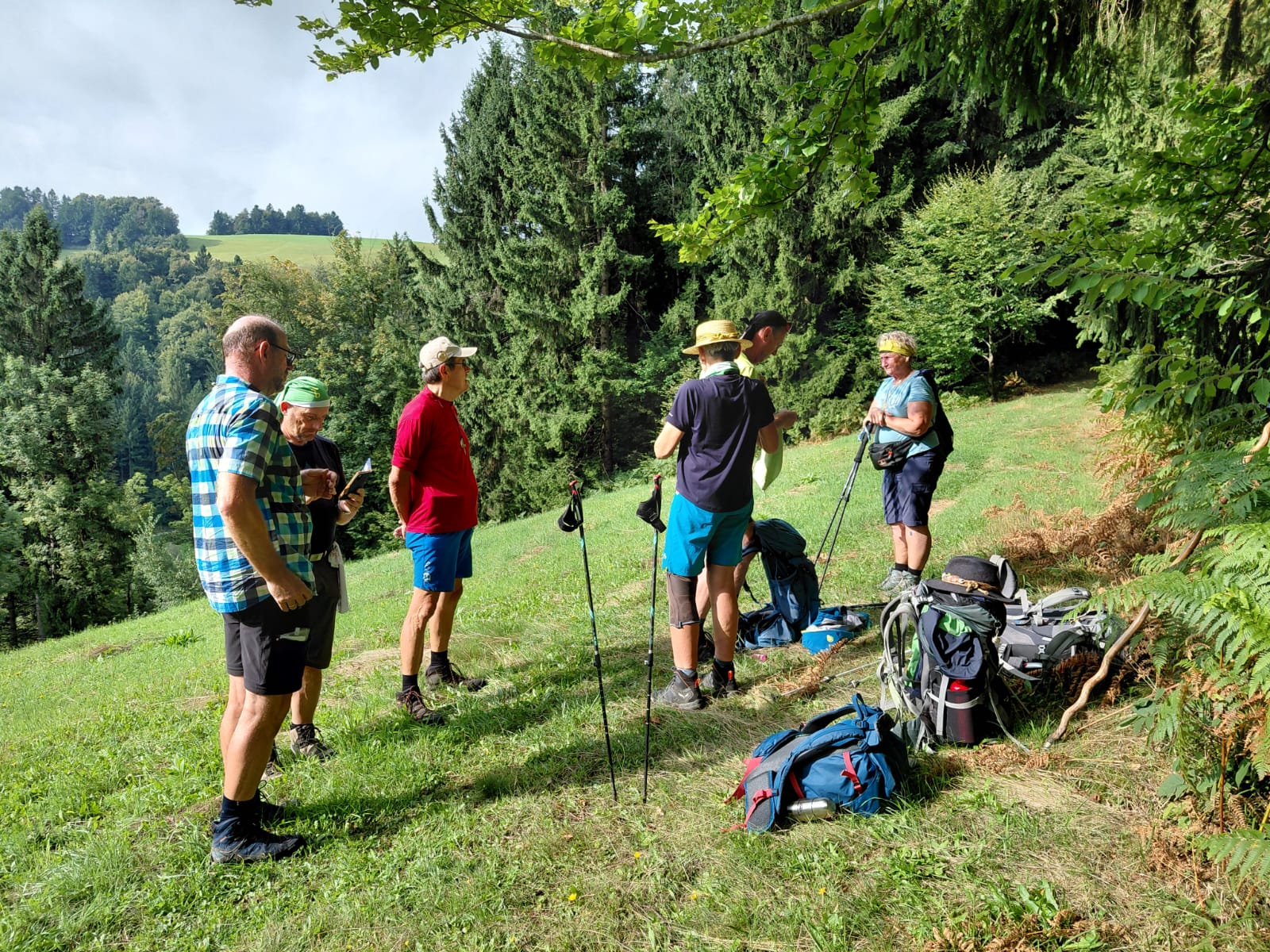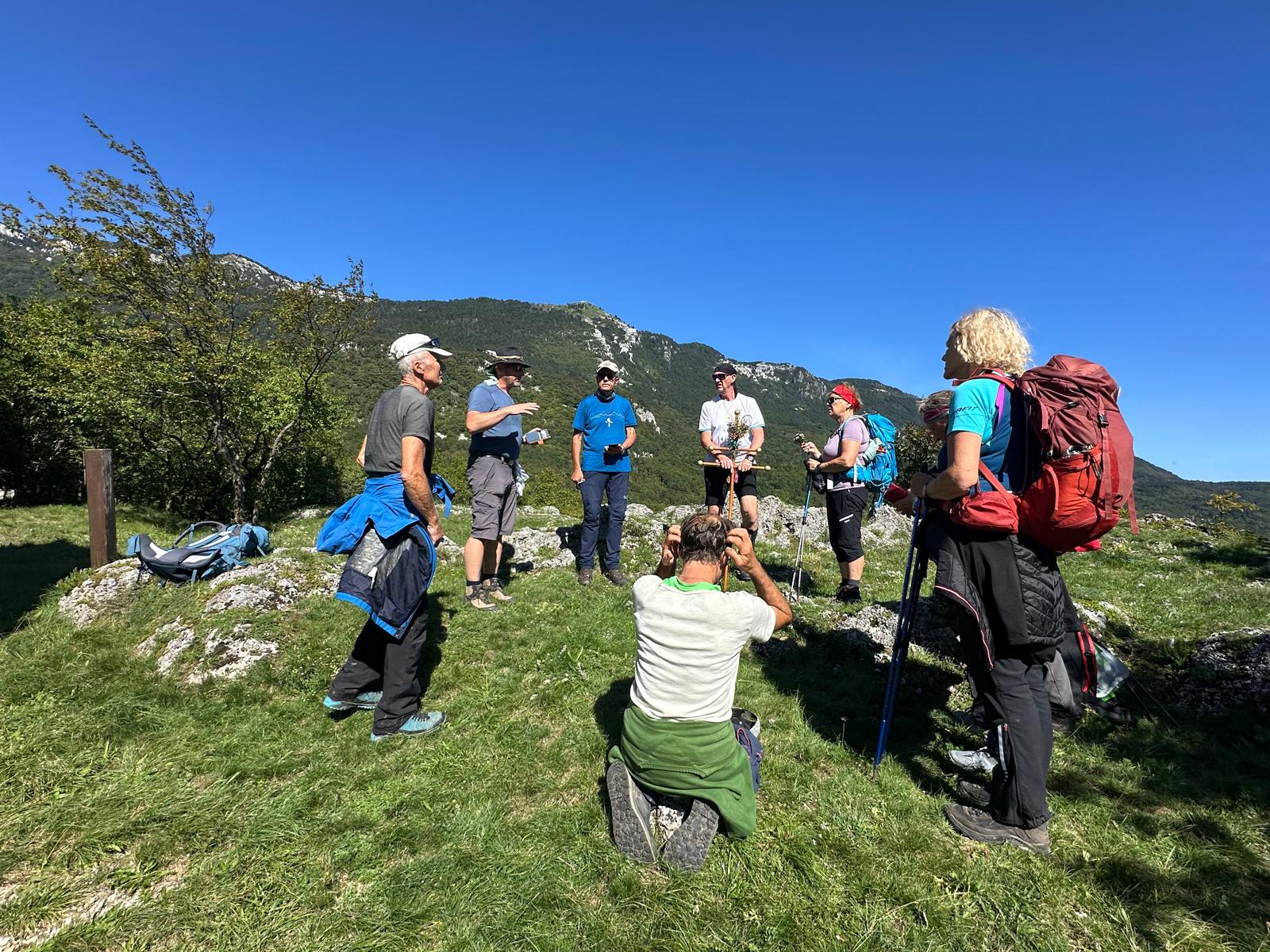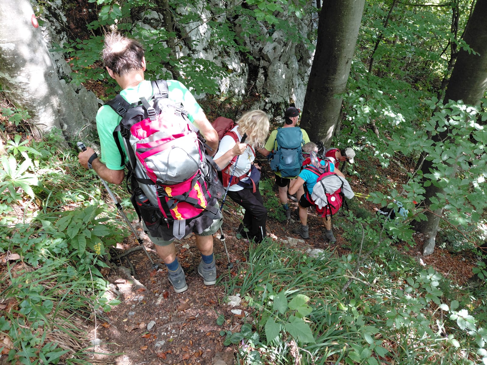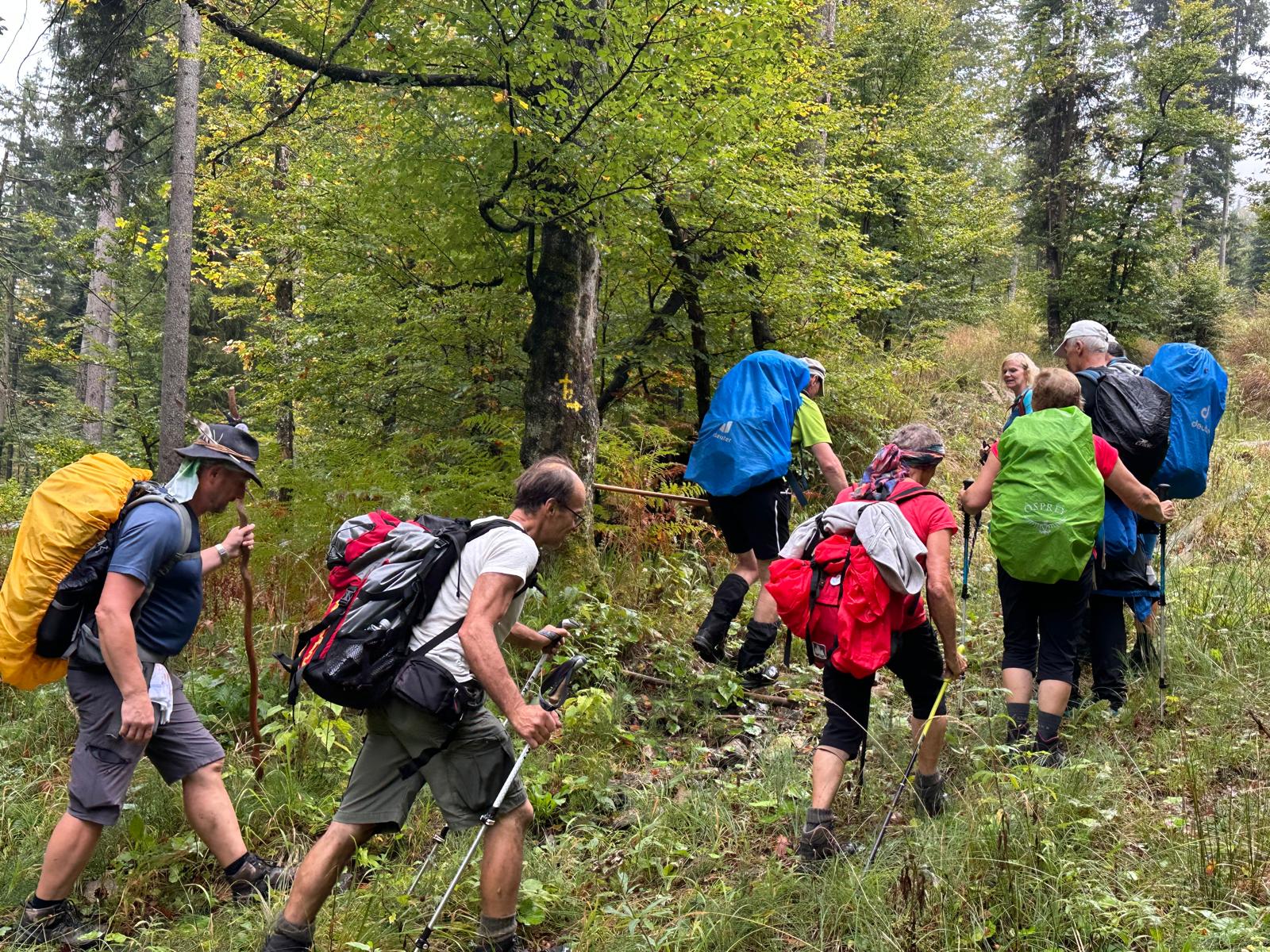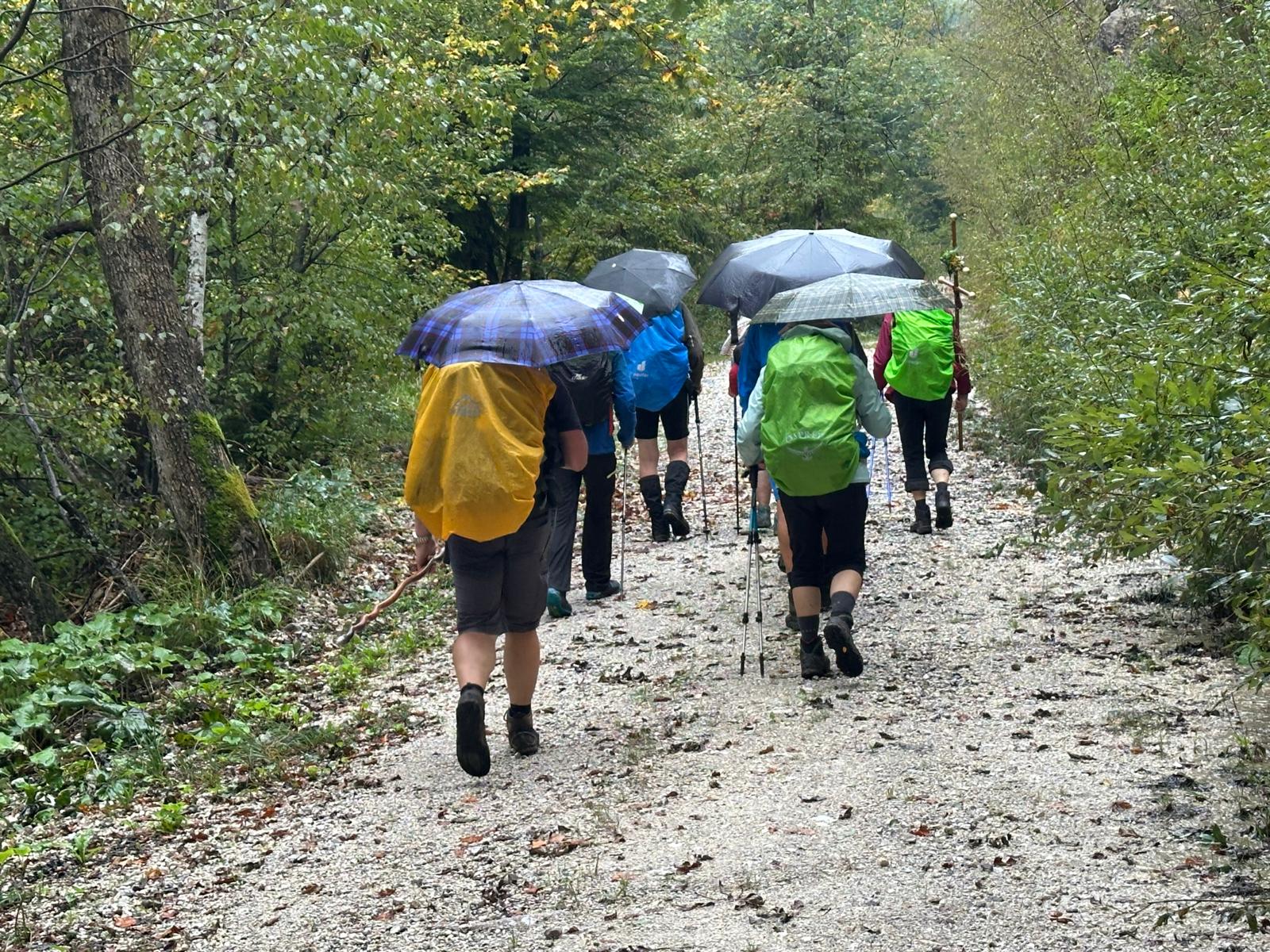 Am Dienstag, den 16. September, stand die Königsetappe am Programm. Auch diesmal versprach die Wetterprognose nichts Gutes. Beim ersten Aufstieg begleitete uns noch kurz die Sonne, beim zweiten mussten wir den Regenschutz auspacken. Auf der ersten Anhöhe mit dem ‚Schnapsomat‘ war der erste Regenguss wieder vorbei und wir konnten die weitere hügelige Wanderung gut fortsetzen. Glücklicherweise hat Silvio unseren alten Bekannten Danilo Mohoric gefragt und Unterstände organisiert, es begann nämlich heftig zu regnen. Es half nichts, wir mussten weiter, aber glücklicherweise hörte der Regen auf dem Weg in den Idrijca-Graben beim vlg. Trattnig auf, dort spendete die Bäuerin frische Birnen. Bis zur Klause Idrijca blieb es trocken. Dort angekommen begann es wieder zu regnen und wir konnten unsere Mittagsrast unter dem Dach der schönen Klause abhalten. Der weitere Pfad, teilweise direkt über kleine Inseln in der Idricija, führte uns über insgesamt 14 querende Bächlein und Furten. Andreas musste wieder einspringen und uns durch den stark wasserführende Idricija helfen. Von da ging es wieder steil bergauf, auch eine lange asphaltierte Straße, wo Ernst beinahe seinen Rucksack vergaß. Dann fiel Nebel ein, es wurde kälter und Hannes traf die Entscheidung, heute nicht auf den Gipfel des Mali Golak zu gehen. Wir hätten auch nichts gesehen und der Weg wäre über den steinigen Pfad sehr beschwerlich gewesen. Stattdessen folgten wir der nahezu ebenen Forststraße und gingen zur Gänze den Mali Golak, die höchste Erhebung nördlich des Vipava-Tales rund herum. Es nahte schon wieder ein Gewitter, die Schritte wurden immer flotter, so dass wir noch rechtzeitig die Almhütte Mali Golak trocken erreichten.