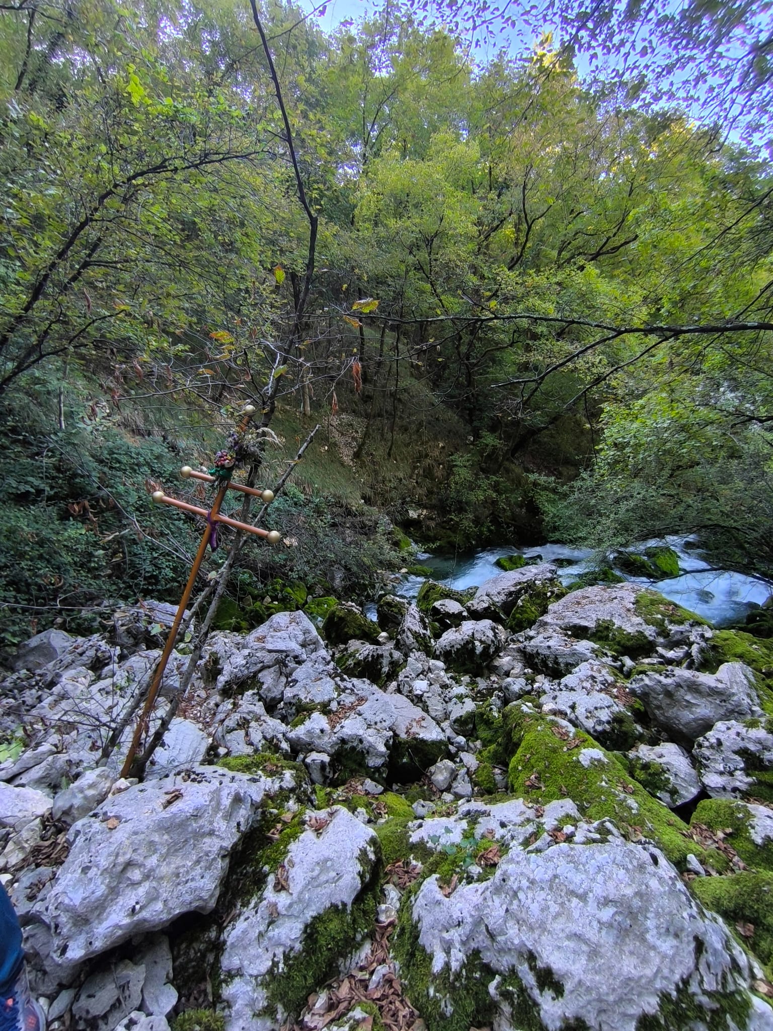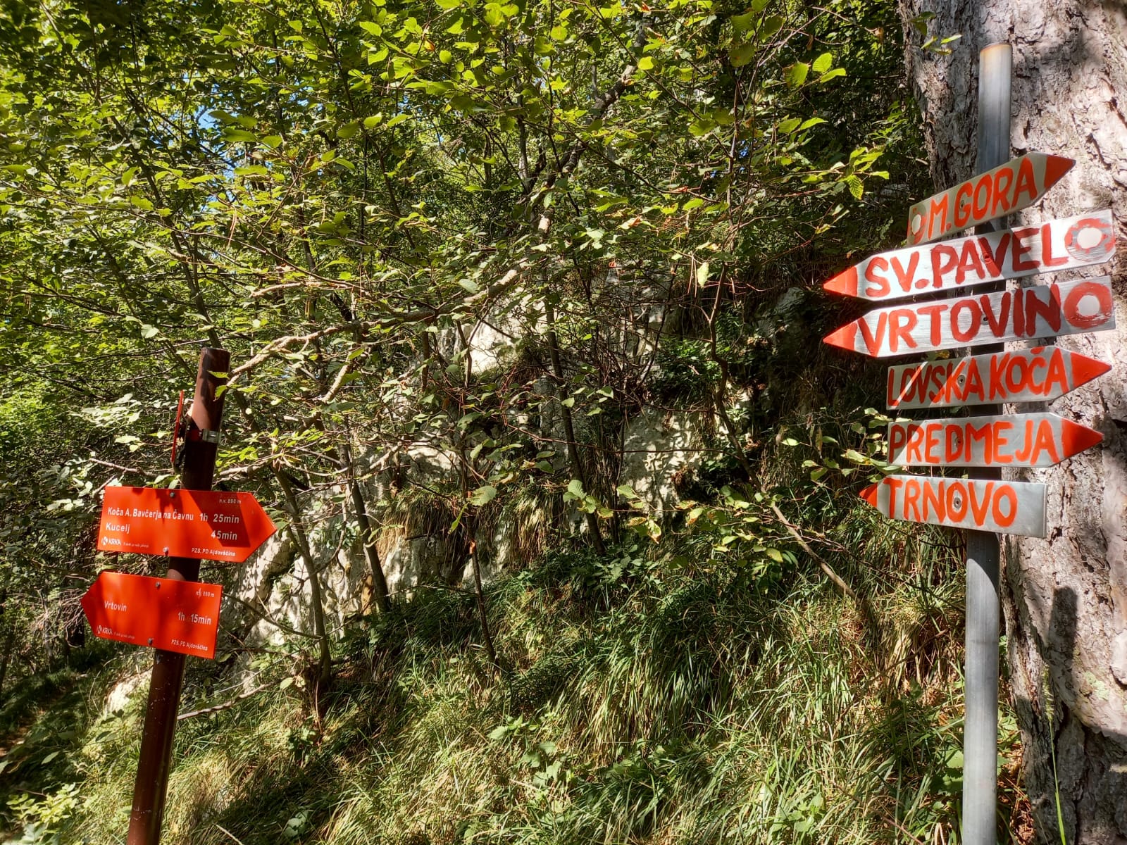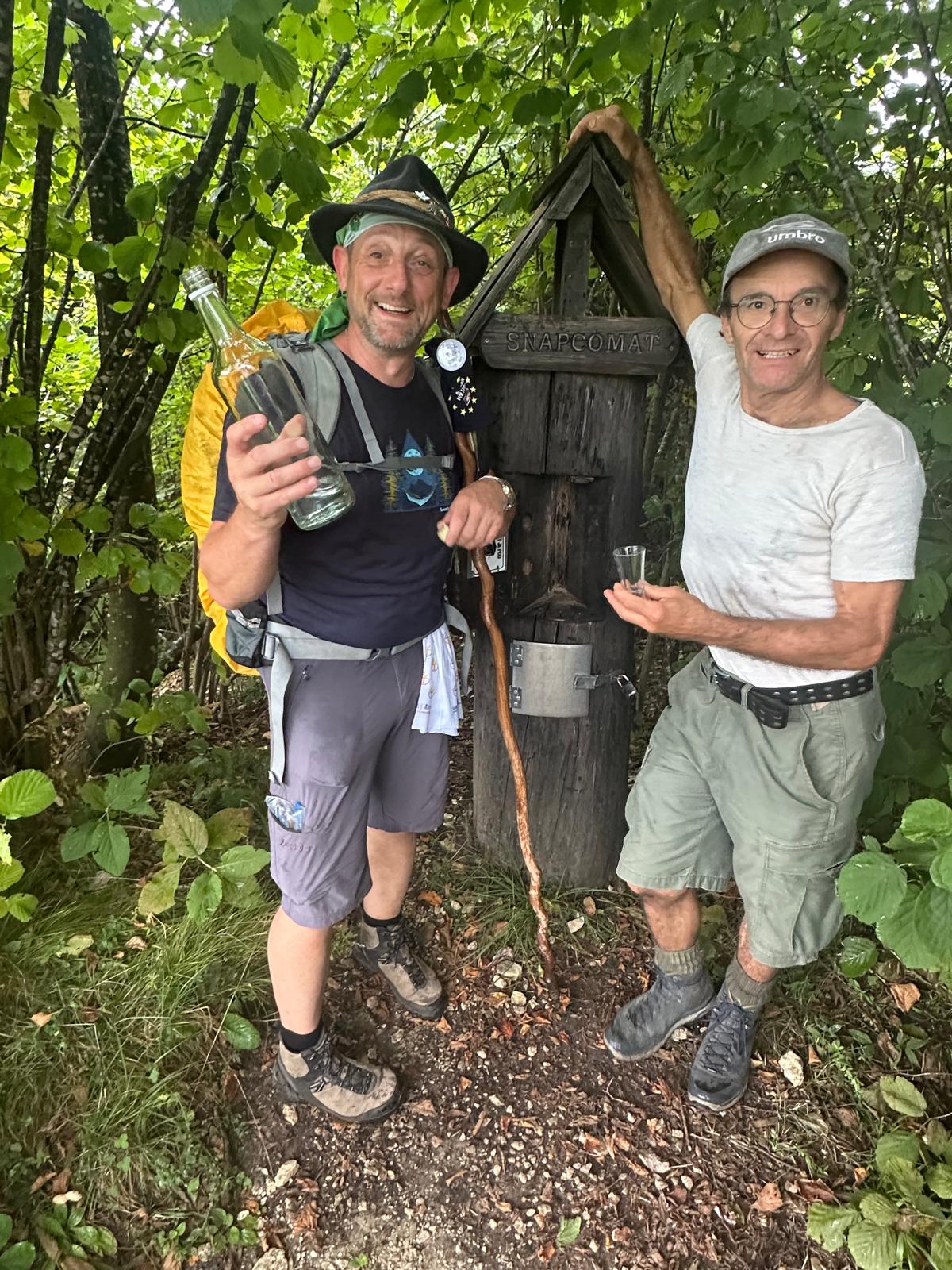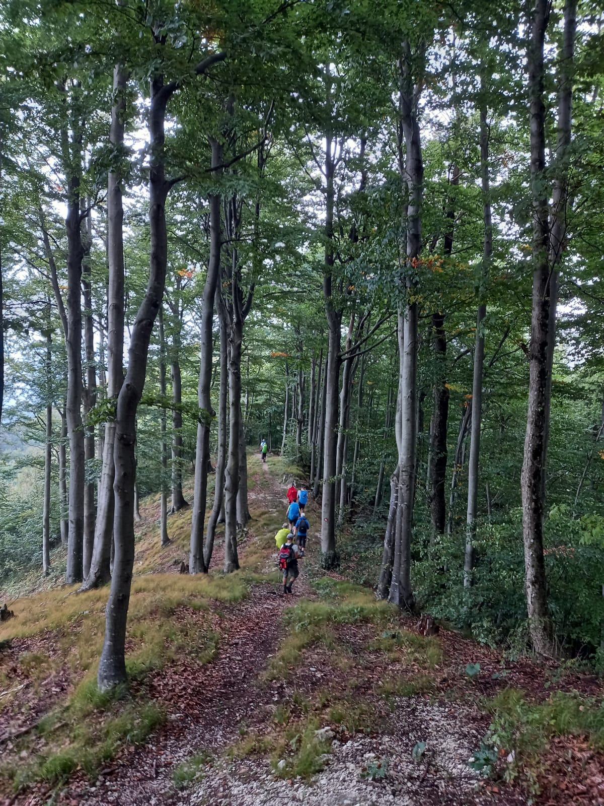 Am Dienstag, den 16. September, stand die Königsetappe am Programm. Auch diesmal versprach die Wetterprognose nichts Gutes. Beim ersten Aufstieg begleitete uns noch kurz die Sonne, beim zweiten mussten wir den Regenschutz auspacken. Auf der ersten Anhöhe mit dem ‚Schnapsomat‘ war der erste Regenguss wieder vorbei und wir konnten die weitere hügelige Wanderung gut fortsetzen. Glücklicherweise hat Silvio unseren alten Bekannten Danilo Mohoric gefragt und Unterstände organisiert, es begann nämlich heftig zu regnen. Es half nichts, wir mussten weiter, aber glücklicherweise hörte der Regen auf dem Weg in den Idrijca-Graben beim vlg. Trattnig auf, dort spendete die Bäuerin frische Birnen. Bis zur Klause Idrijca blieb es trocken. Dort angekommen begann es wieder zu regnen und wir konnten unsere Mittagsrast unter dem Dach der schönen Klause abhalten. Der weitere Pfad, teilweise direkt über kleine Inseln in der Idricija, führte uns über insgesamt 14 querende Bächlein und Furten. Andreas musste wieder einspringen und uns durch den stark wasserführende Idricija helfen. Von da ging es wieder steil bergauf, auch eine lange asphaltierte Straße, wo Ernst beinahe seinen Rucksack vergaß. Dann fiel Nebel ein, es wurde kälter und Hannes traf die Entscheidung, heute nicht auf den Gipfel des Mali Golak zu gehen. Wir hätten auch nichts gesehen und der Weg wäre über den steinigen Pfad sehr beschwerlich gewesen. Stattdessen folgten wir der nahezu ebenen Forststraße und gingen zur Gänze den Mali Golak, die höchste Erhebung nördlich des Vipava-Tales rund herum. Es nahte schon wieder ein Gewitter, die Schritte wurden immer flotter, so dass wir noch rechtzeitig die Almhütte Mali Golak trocken erreichten.