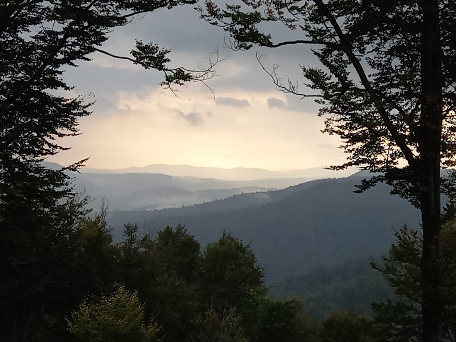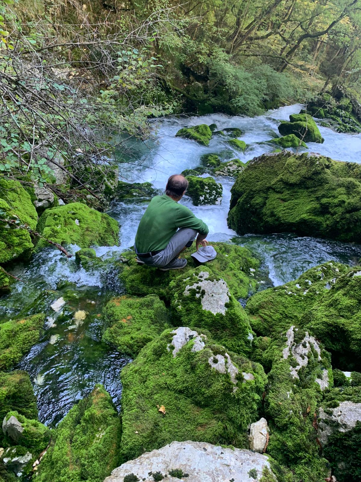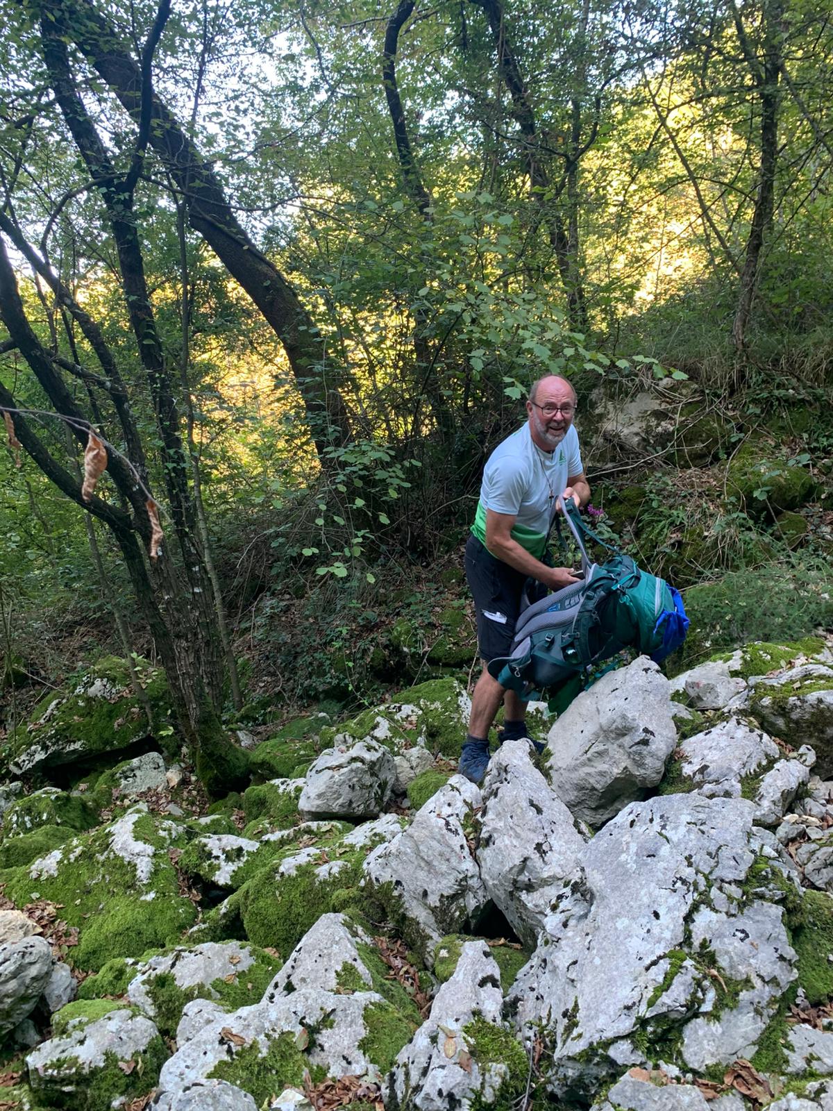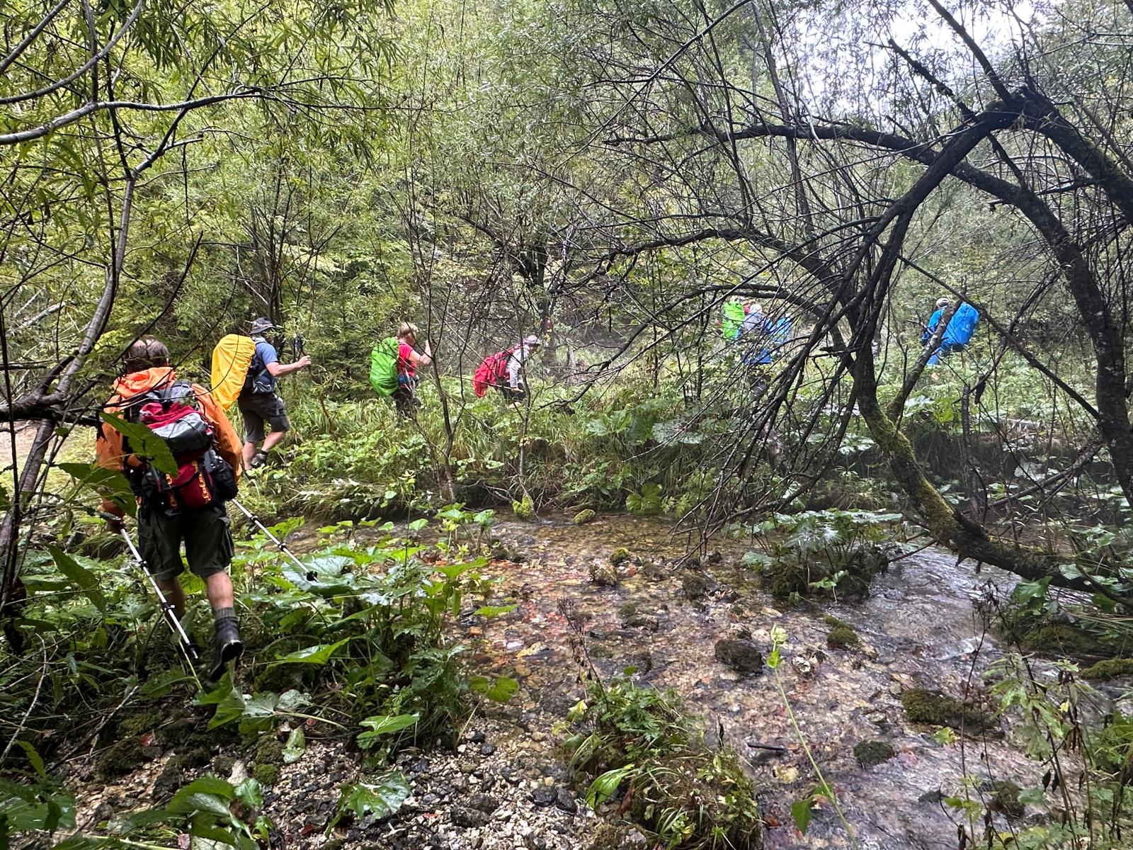 Am Dienstag, den 16. September, stand die Königsetappe am Programm. Auch diesmal versprach die Wetterprognose nichts Gutes. Beim ersten Aufstieg begleitete uns noch kurz die Sonne, beim zweiten mussten wir den Regenschutz auspacken. Auf der ersten Anhöhe mit dem ‚Schnapsomat‘ war der erste Regenguss wieder vorbei und wir konnten die weitere hügelige Wanderung gut fortsetzen. Glücklicherweise hat Silvio unseren alten Bekannten Danilo Mohoric gefragt und Unterstände organisiert, es begann nämlich heftig zu regnen. Es half nichts, wir mussten weiter, aber glücklicherweise hörte der Regen auf dem Weg in den Idrijca-Graben beim vlg. Trattnig auf, dort spendete die Bäuerin frische Birnen. Bis zur Klause Idrijca blieb es trocken. Dort angekommen begann es wieder zu regnen und wir konnten unsere Mittagsrast unter dem Dach der schönen Klause abhalten. Der weitere Pfad, teilweise direkt über kleine Inseln in der Idricija, führte uns über insgesamt 14 querende Bächlein und Furten. Andreas musste wieder einspringen und uns durch den stark wasserführende Idricija helfen. Von da ging es wieder steil bergauf, auch eine lange asphaltierte Straße, wo Ernst beinahe seinen Rucksack vergaß. Dann fiel Nebel ein, es wurde kälter und Hannes traf die Entscheidung, heute nicht auf den Gipfel des Mali Golak zu gehen. Wir hätten auch nichts gesehen und der Weg wäre über den steinigen Pfad sehr beschwerlich gewesen. Stattdessen folgten wir der nahezu ebenen Forststraße und gingen zur Gänze den Mali Golak, die höchste Erhebung nördlich des Vipava-Tales rund herum. Es nahte schon wieder ein Gewitter, die Schritte wurden immer flotter, so dass wir noch rechtzeitig die Almhütte Mali Golak trocken erreichten.