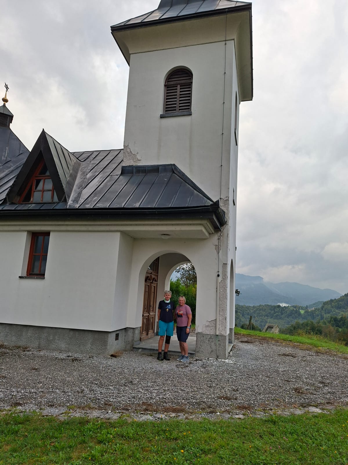 Am nächsten Morgen wurde das Franziskanerkloster in Kamnik besucht. Ein Franziskanerpater begrüßte die Gäste auf das herzlichste und zeigte ihnen gemeinsam mit einem Assistenten die berühmte Plečnik-Kapelle, wo der slowenische Architekt vor allem das Leid der Slowenen während beider Weltkriege künstlerisch zum Ausdruck brachte. Der Künstler verwendete verschiedene Marmorarten aus Slowenien und stellte auch die Verbindung des Leidens mit der Hoffnung der Auferstehung, der zentralen christlichen Botschaft, dar. Es ging dann über eine herrliche bewaldete Hügelkette an einen kleinen Teich und weiter durch die Orte Sv. Križ, Komenda und Repnje. Für eine Kaffeepause wurde eine alternative Wegroute erkundet. Zur Überraschung musste ein Bach, der nach dem Regen sehr viel Wasser führte, gequert werden. Andreas war zur Stelle mit einem Pfosten, mit denen wir das überraschende Hindernis und etwas nassen Schuhen bewältigten. Im Frauenkloster Repnje und der modernen Kapelle machten wir Halt, wo es wieder einen sehr schönen spirituellen Impuls gab. Jetzt ging es wieder bergauf über den Hügeln zur imposanten Burgruine Smlednik. Hier genossen wir bereits in der Abendsonne den Blick nach Ljubljana, nach Kranj und zu unserem nächsten Ziel, der Stadt Škofja Loka. Den berühmten Kreuzweg von Sveta Valburga gingen wir hinab, querten dann die Save und erreichten in wenigen Metern das Hotel. Am Abend wanderten wir noch zum Stausee Zbilje und aßen zu Abend mit Blick auf den See.