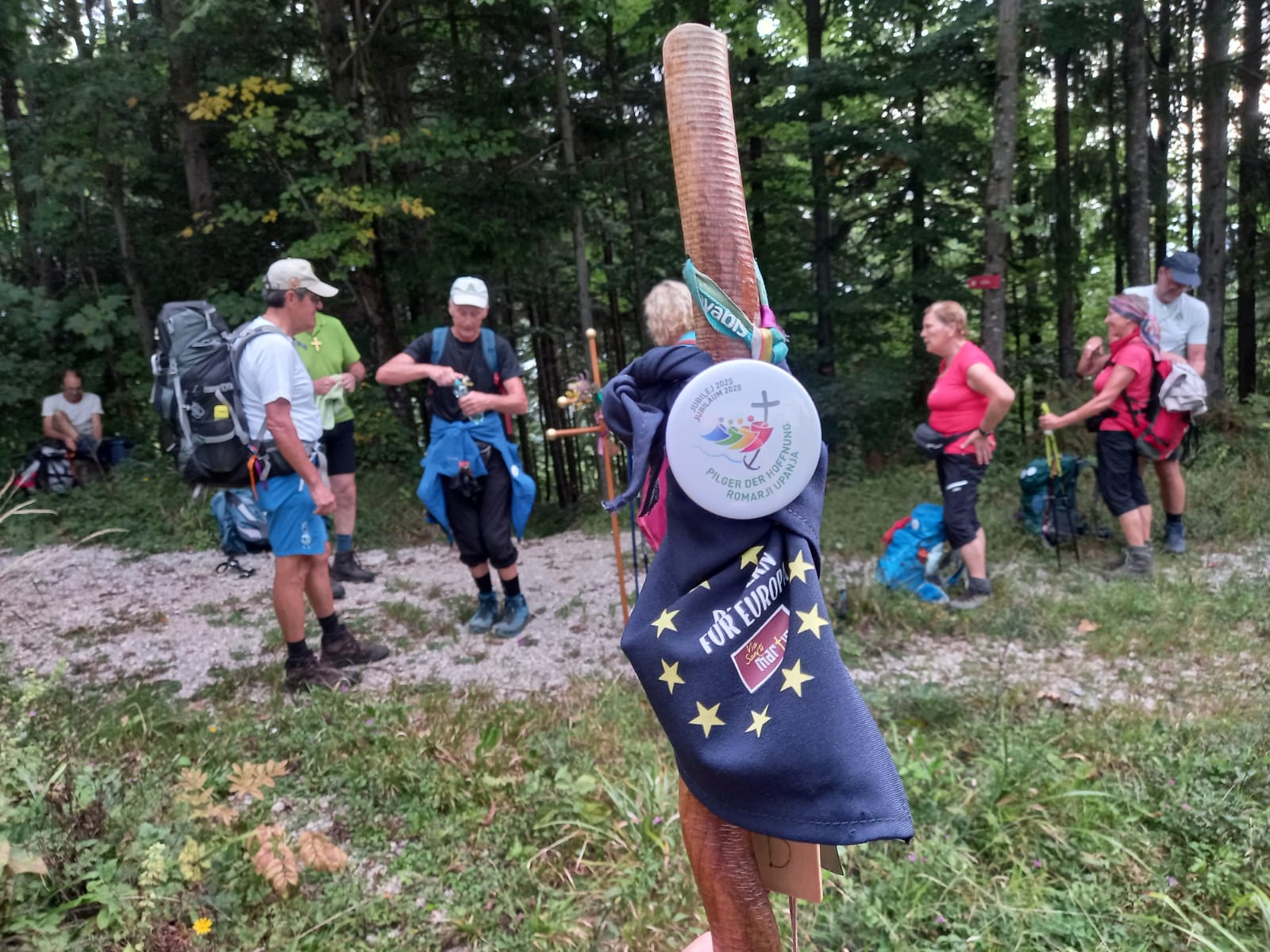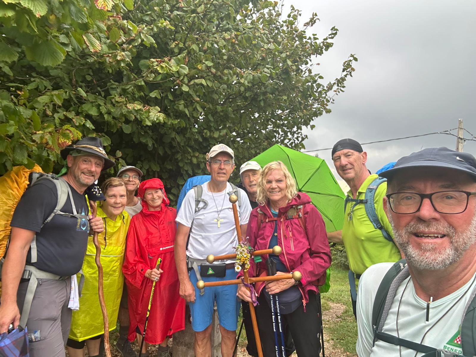 Am nächsten Tag ging es dann los, der Pfarrer von Gornji Grad, Ivan Hrastnik spendete den Segen und überreichte jedem Pilger und jeder Pilgerin ein Benedikt-Amulett. Sowohl Bürgermeister Anton Špeh als auch der Amtsleiter waren beim feierlichen Hissen der Benedikt-Fahne anwesend. Die erste Etappe führte dann hinauf an mehreren schönen Kirchen vorbei zunächst nach Nova Štifta und zum Bergrücken, wo man normalerweise bereits einen Blick auf die Steiner Alpen hätte. Allerdings verdichtete sich etwas der Himmel und auch leichter Regen setzte ein, sodass die Pilger den schönen Fernblick nicht genießen konnten. Über eine hügelige Wegstrecke mit mehreren Wegkreuzen führte der Weg dann hinunter nach Kamnik.