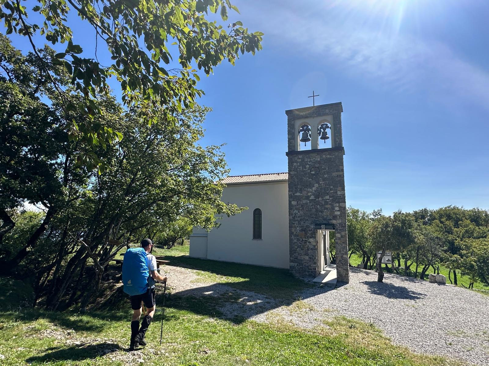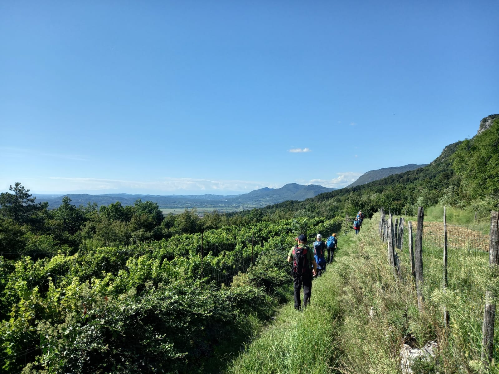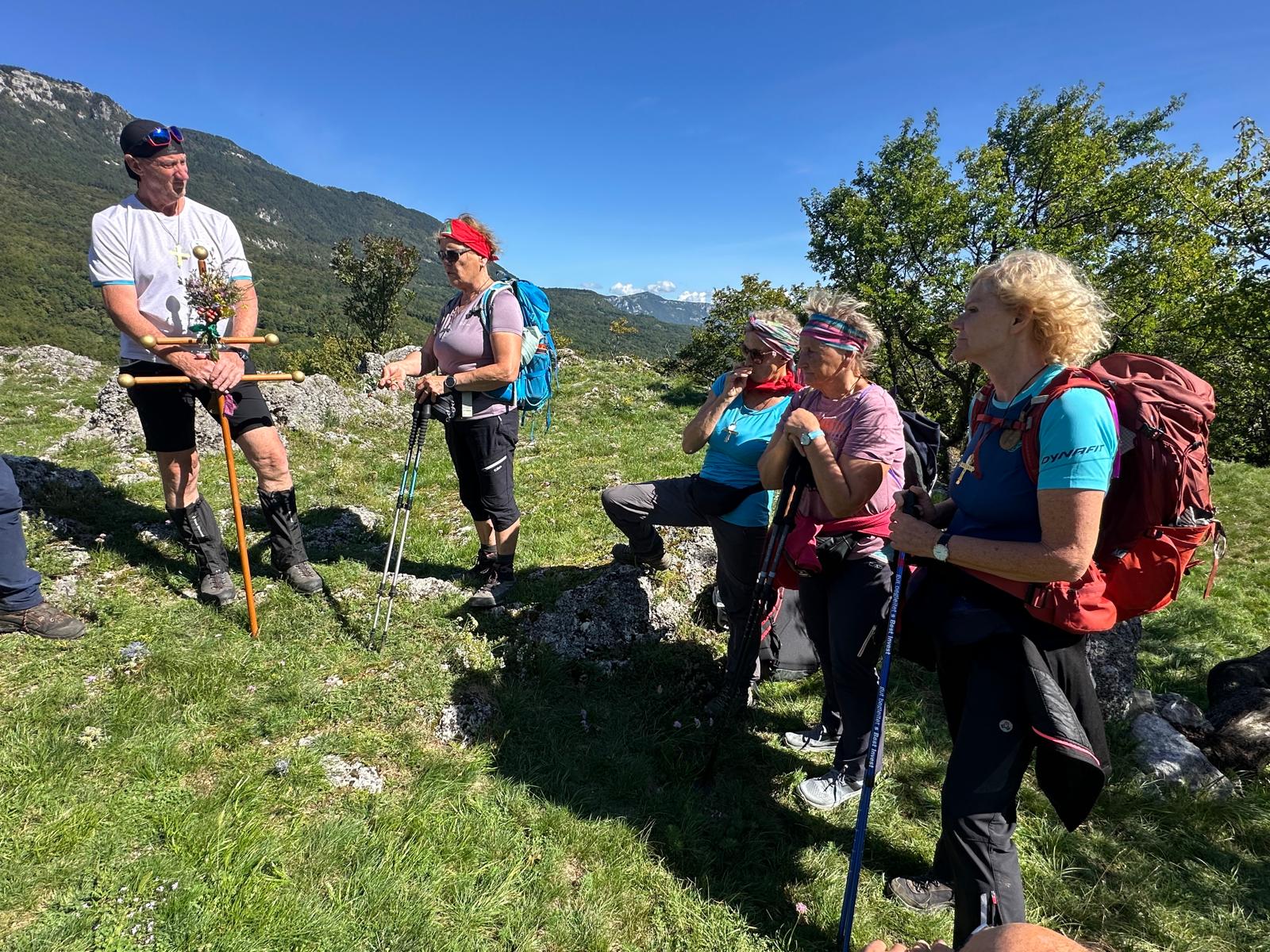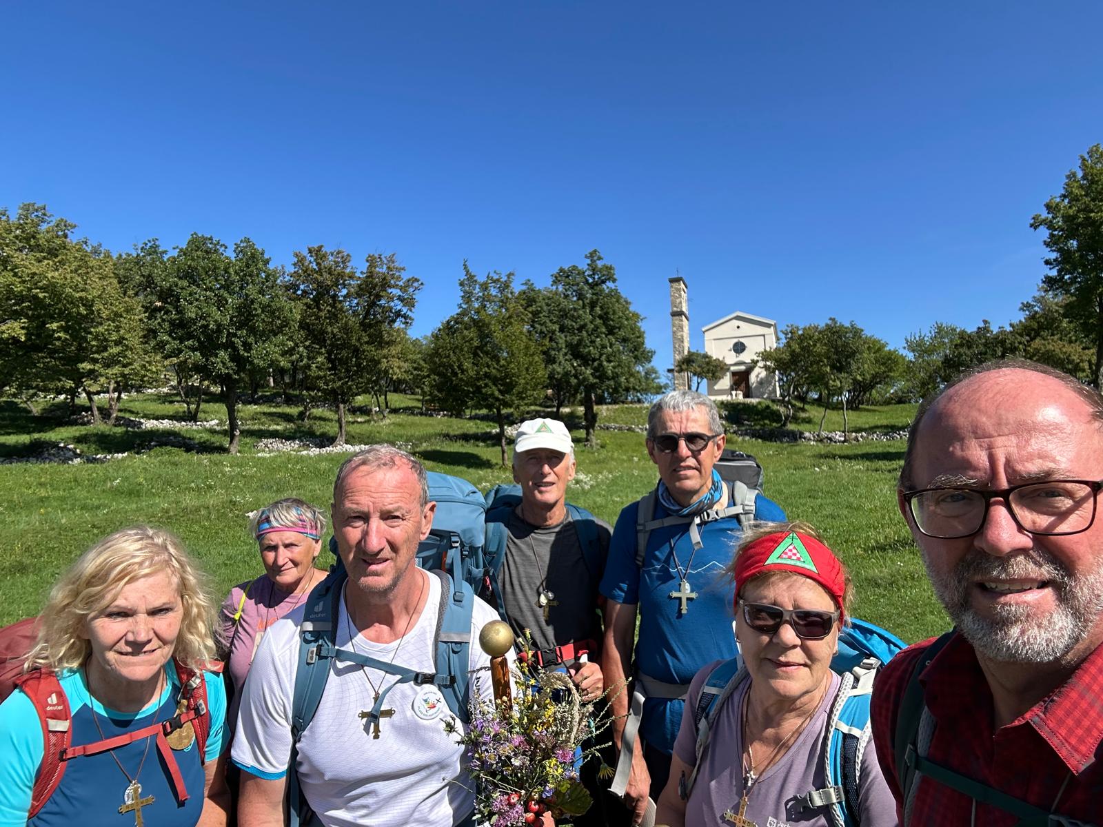 Herrliches klares Wetter und eine leichte Bora begleitete uns dann am nächsten Tag auf der siebenten Etappe vom Mali Golak hinunter in das Vipava-Tal. Erstmals konnten wir auch die obere Adria mit Schiffen und das malerische Piran erblicken. Mit verschiedenen Arten von Strudel und Kaffee gestärkt bei einer weiteren Hütte ging es dann hinunter zum Kraftort Sveti Pavel. Von diesem ‚wegzukommen‘ war nicht leicht aber wir mussten weitergehen, weil knapp unterhalb des schönen Aussichtplateaus vier weitere Pilger:innen warteten. Diese wurden mit einem Kärntner Lied begrüßt. Wieder über herrliche Wanderwege und Pfade durch die Orte Ravne und Osek, wobei wir durch ein kleines Stück Unterholz irren mussten, gelangten wir zum Tagesziel, Sveta Lucija und das herrliche Weingut von Malovščevo mit Agritourismus. Nach einer lieben Abendandacht mit viel Gesang, gestaltet von Christian und Gabi, in der lieblichen Kirche hatten wir wieder ein herrliches Essen auf einem großen Gemeinschaftstisch und italienischen Flair. Die Chefin des Hauses mit ihrer Tochter kochte und der Gatte beziehungsweise Papa war der gelernte Kellner.