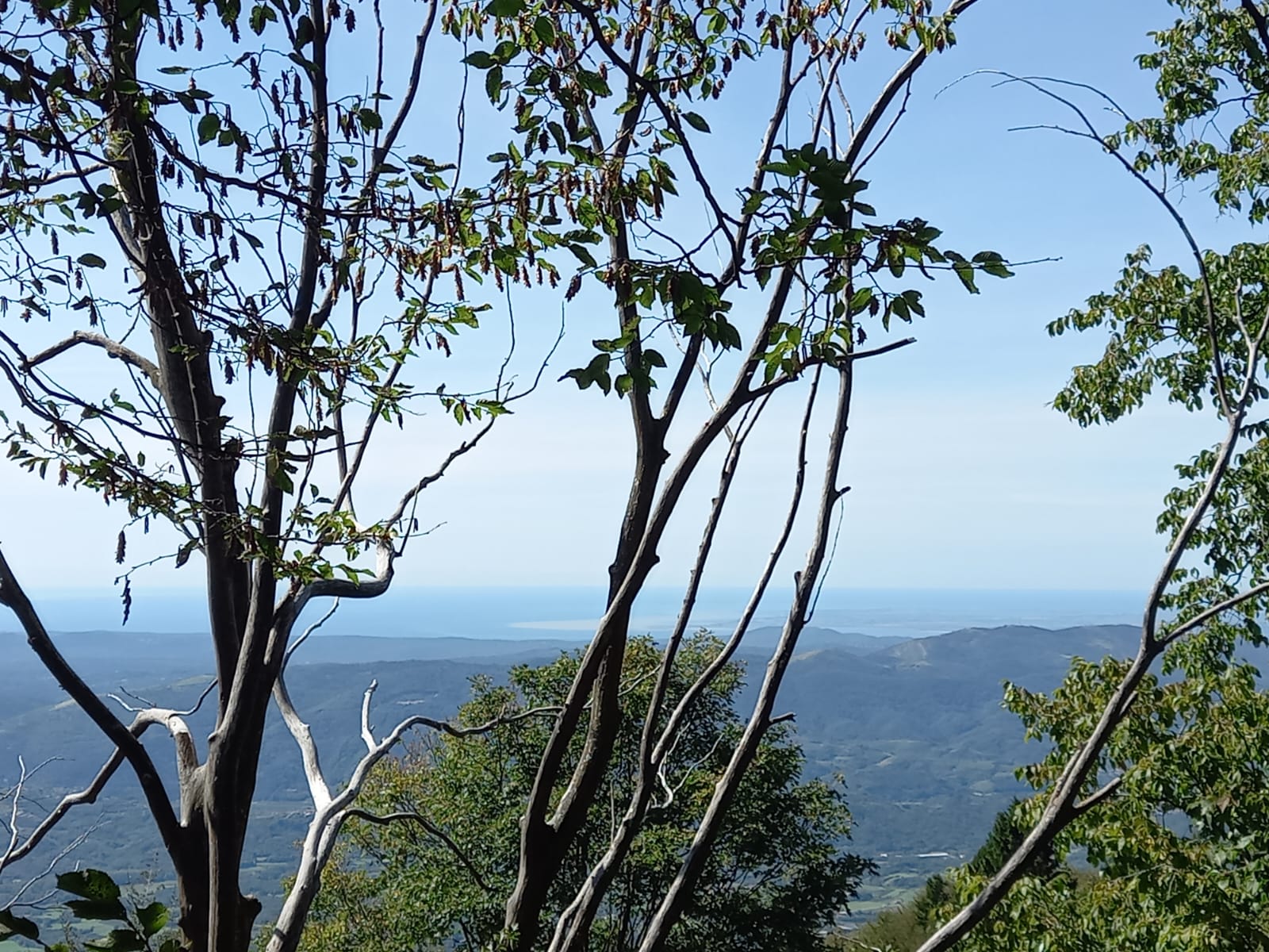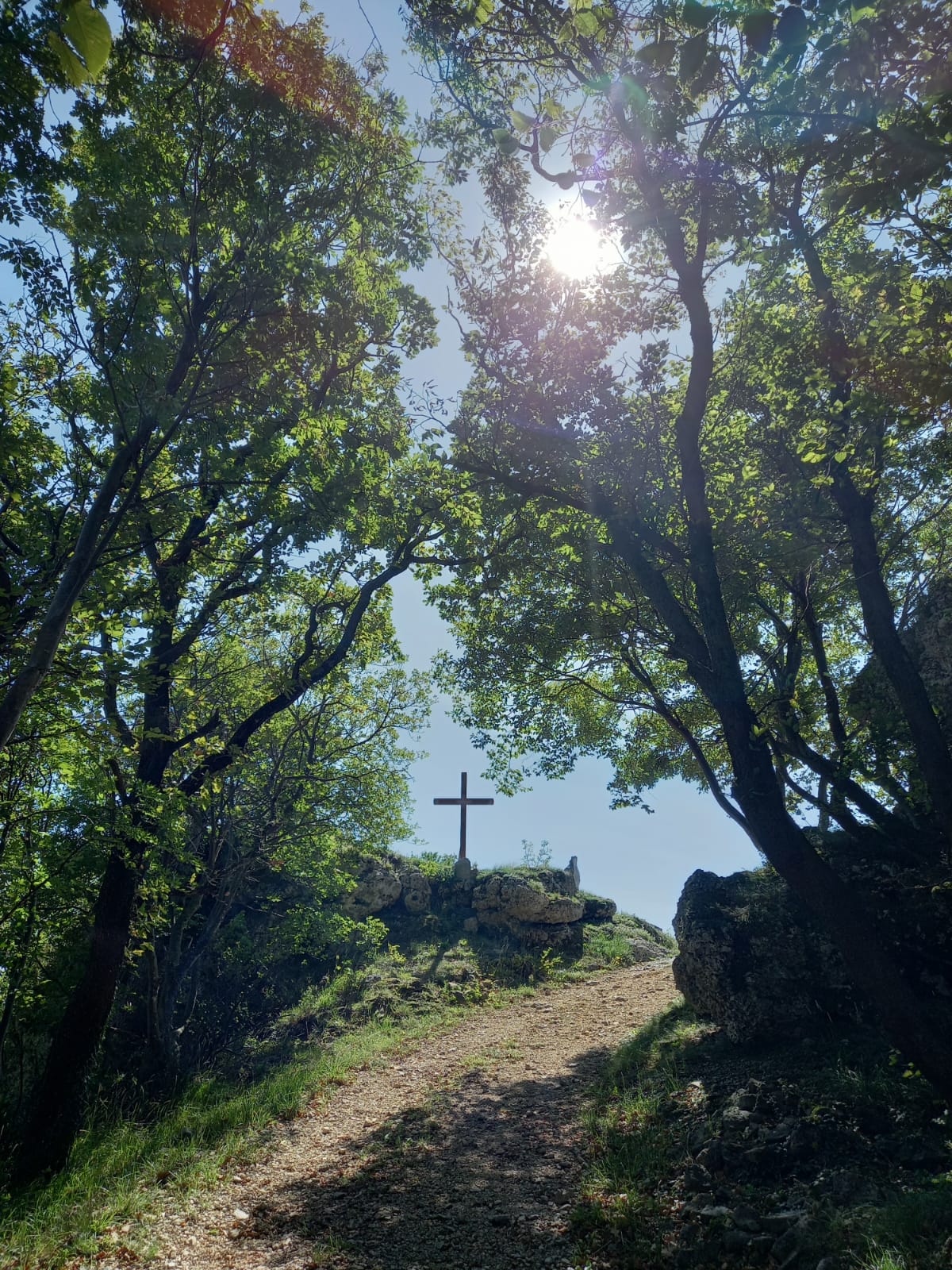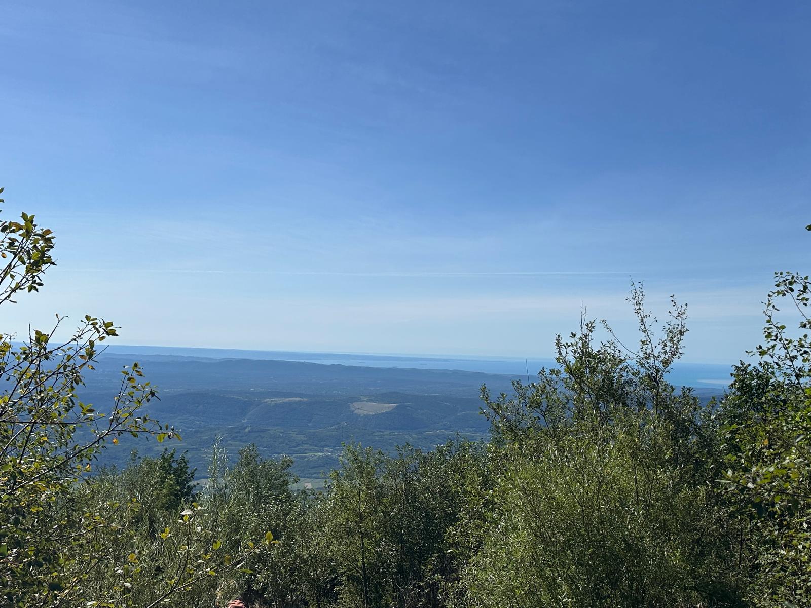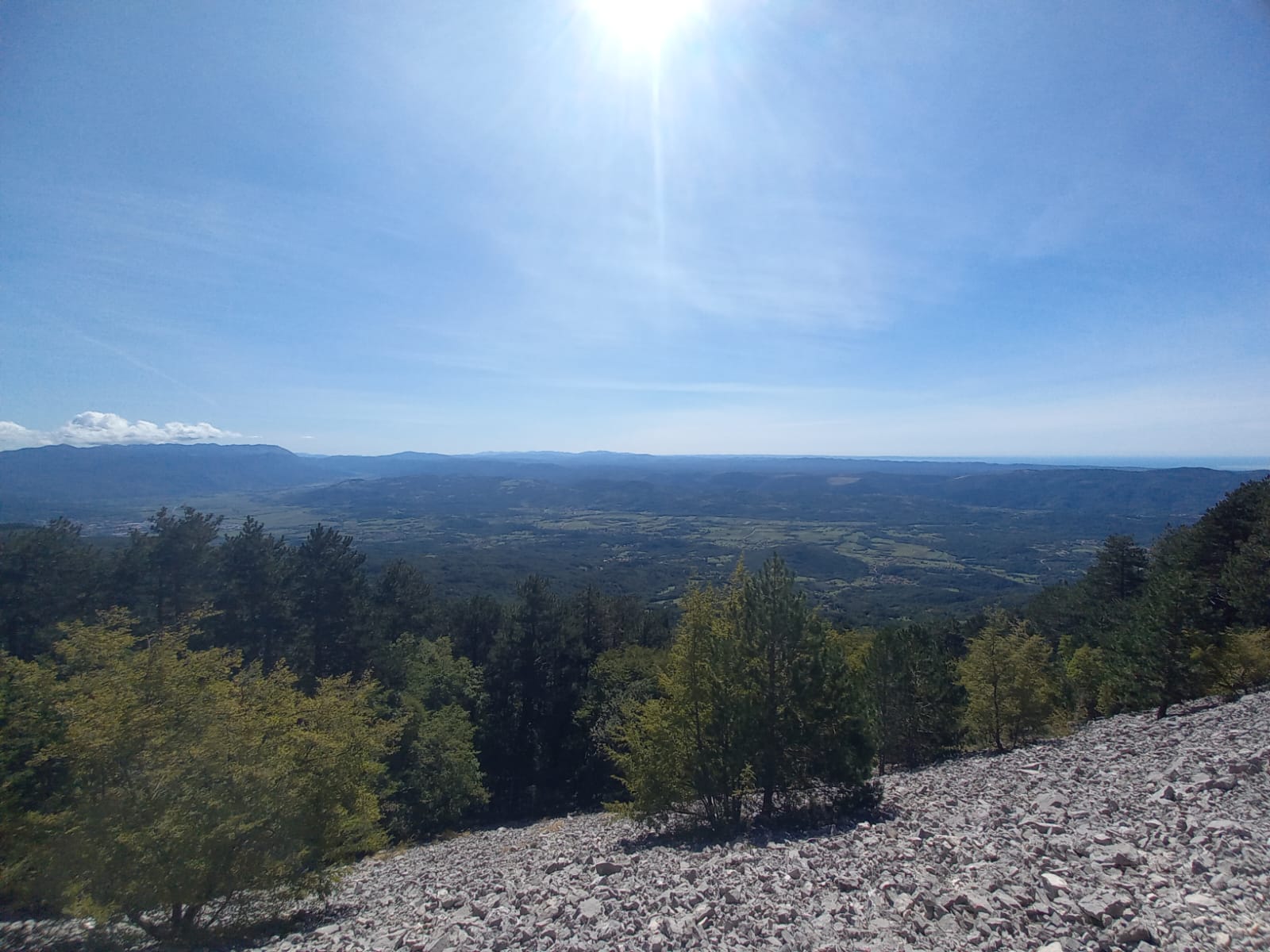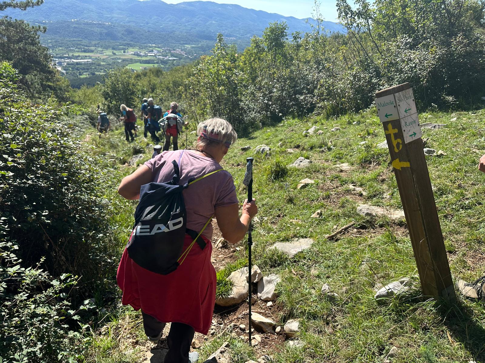 Herrliches klares Wetter und eine leichte Bora begleitete uns dann am nächsten Tag auf der siebenten Etappe vom Mali Golak hinunter in das Vipava-Tal. Erstmals konnten wir auch die obere Adria mit Schiffen und das malerische Piran erblicken. Mit verschiedenen Arten von Strudel und Kaffee gestärkt bei einer weiteren Hütte ging es dann hinunter zum Kraftort Sveti Pavel. Von diesem ‚wegzukommen‘ war nicht leicht aber wir mussten weitergehen, weil knapp unterhalb des schönen Aussichtplateaus vier weitere Pilger:innen warteten. Diese wurden mit einem Kärntner Lied begrüßt. Wieder über herrliche Wanderwege und Pfade durch die Orte Ravne und Osek, wobei wir durch ein kleines Stück Unterholz irren mussten, gelangten wir zum Tagesziel, Sveta Lucija und das herrliche Weingut von Malovščevo mit Agritourismus. Nach einer lieben Abendandacht mit viel Gesang, gestaltet von Christian und Gabi, in der lieblichen Kirche hatten wir wieder ein herrliches Essen auf einem großen Gemeinschaftstisch und italienischen Flair. Die Chefin des Hauses mit ihrer Tochter kochte und der Gatte beziehungsweise Papa war der gelernte Kellner.