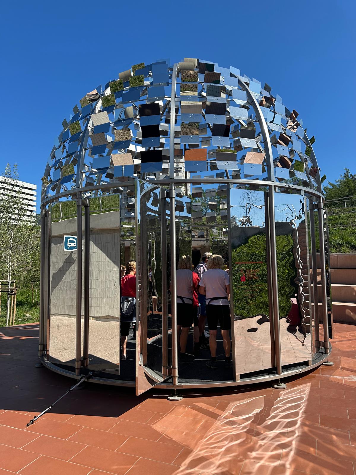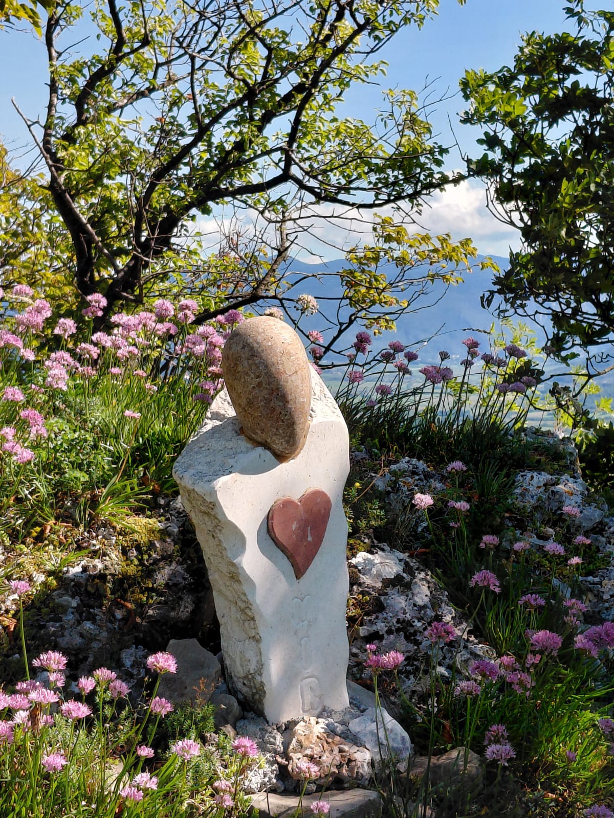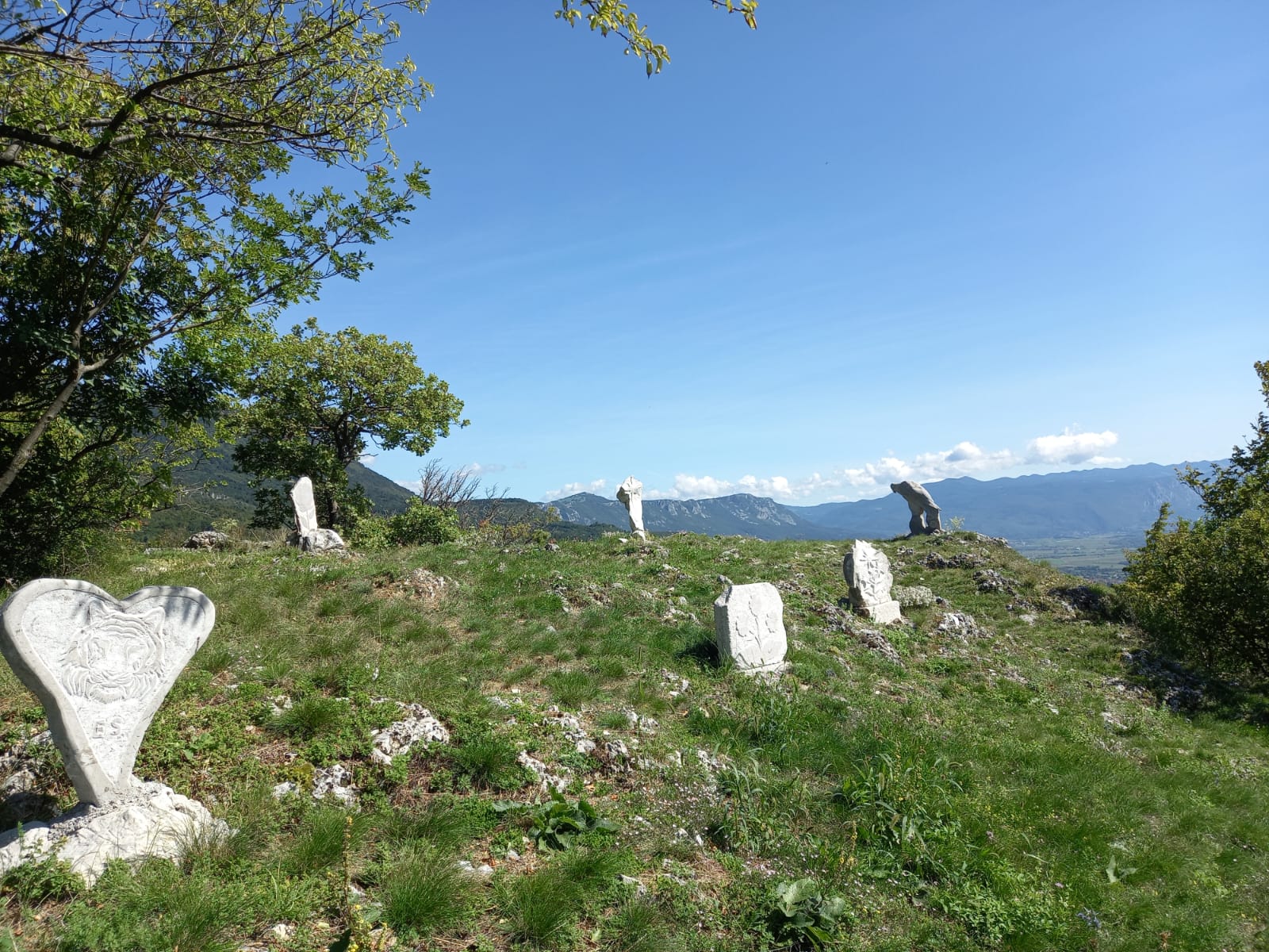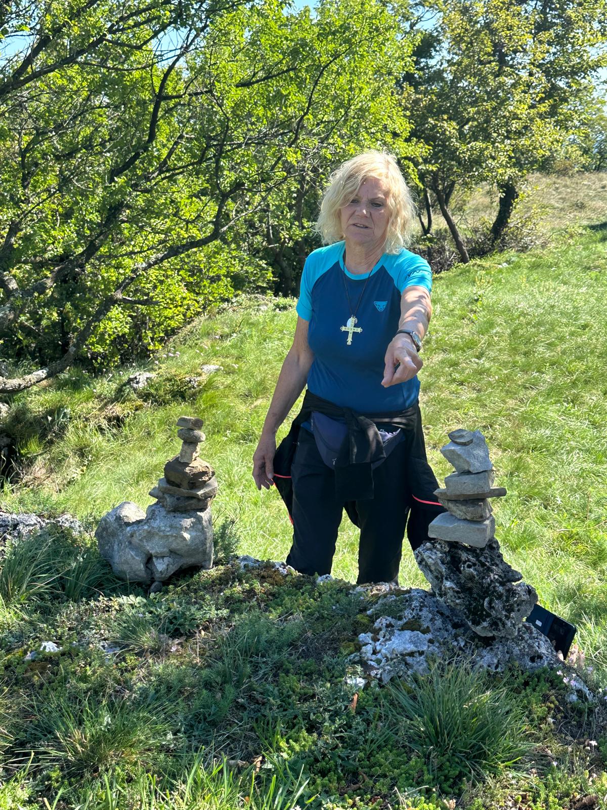 Ebenso herrlich war das kräftige Frühstück am nächsten Morgen und wir brachen zu unserer letzten Etappe und zum Ziel GO 2025 auf. Auch hier gab es wieder herrliche und fast ebene Wanderwege mitten hindurch von Weingärten und Siedlungen. Auch große Kiwi hingen von einer Laube herunter. Unterwegs machten wir einen Abstecher zur berühmten Karstquelle Lijak, ein weiterer Kraftort, an dem wir gerne länger verweilt wären. Ein guter Kilometer war es noch bis in die Stadt Nova Gorica. Nach der Mittagspause besuchten wir dort die erste Ausstellung „Kunst durch Berührung“, die uns sehr mit der Aufmachung und der Einladung zum aktiven Mitmachen begeisterte. Sie macht berühmte Bilder und Skulpturen für blinde zugänglich, andere Skulpturen wurden bewusst aus dem Blickwinkel von Blinden mit Künstlern gestaltet. Wir durften das nacherleben und empfinden.