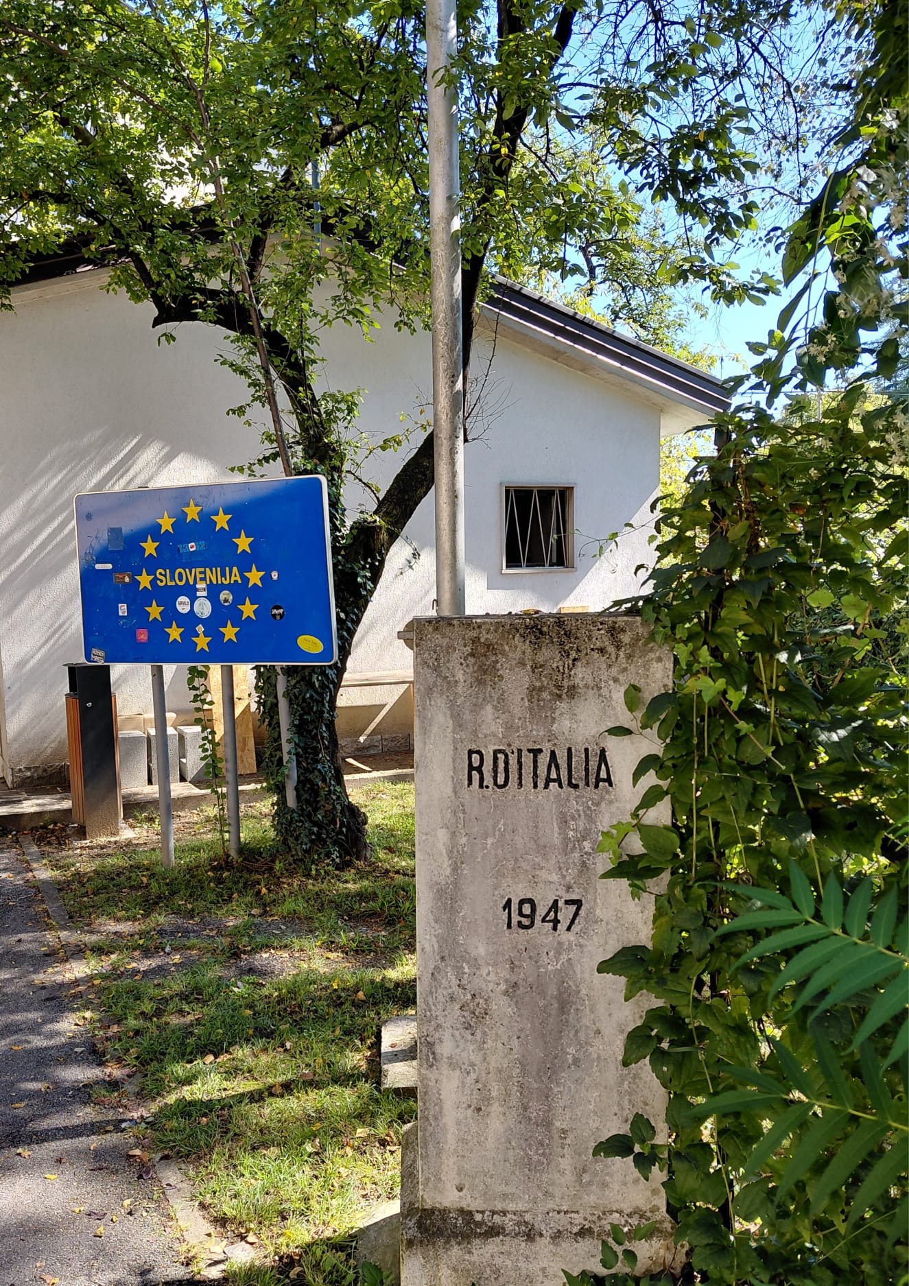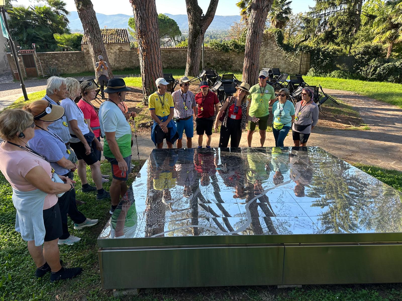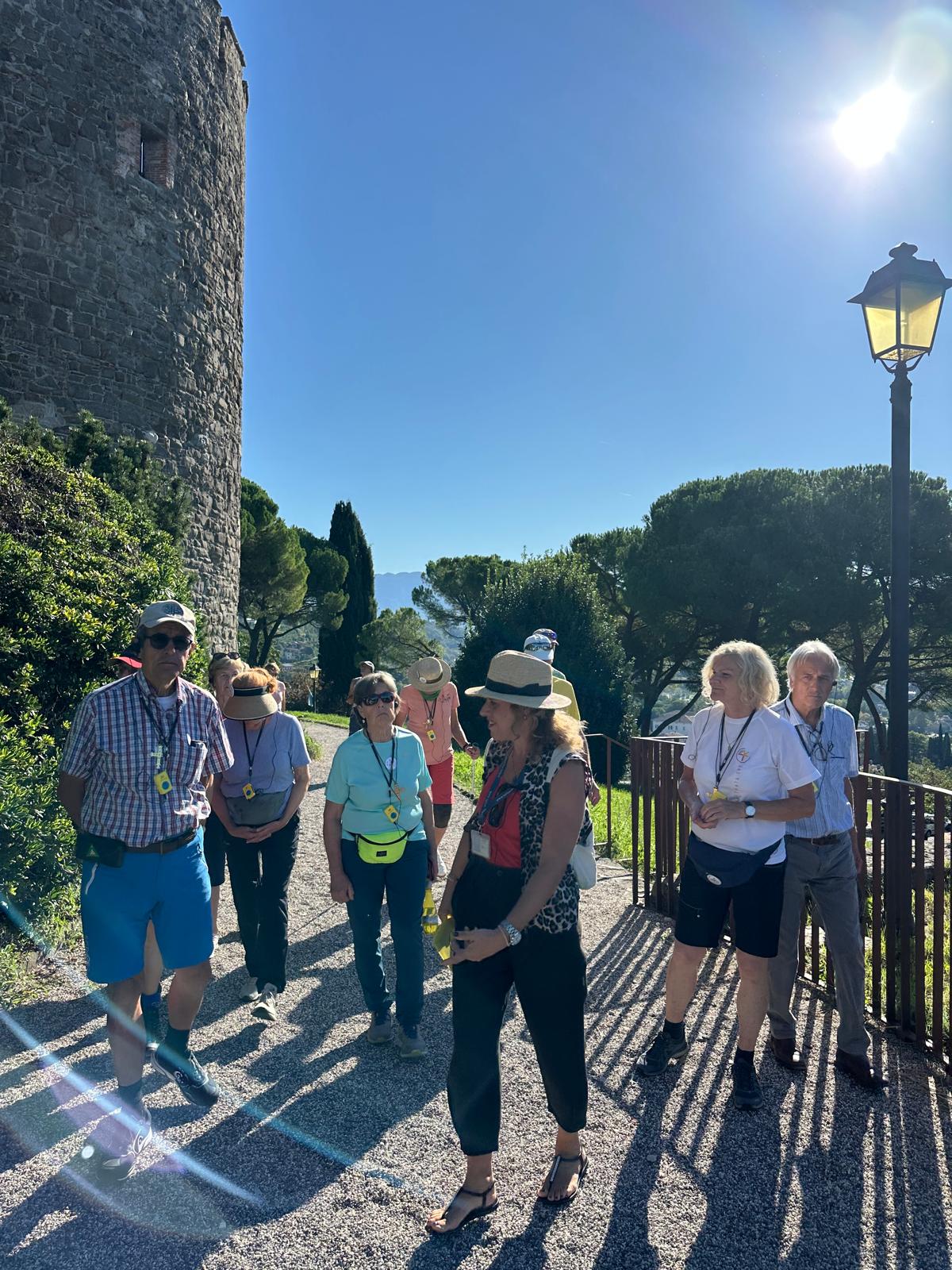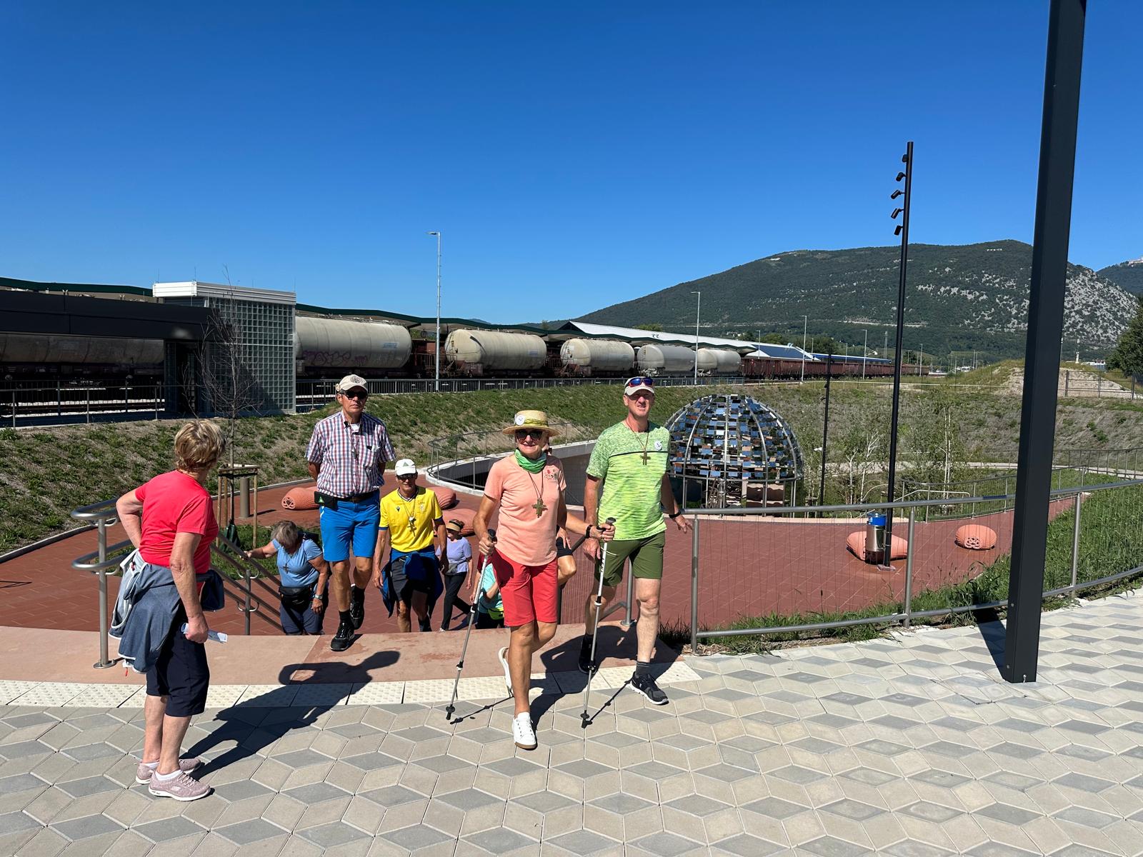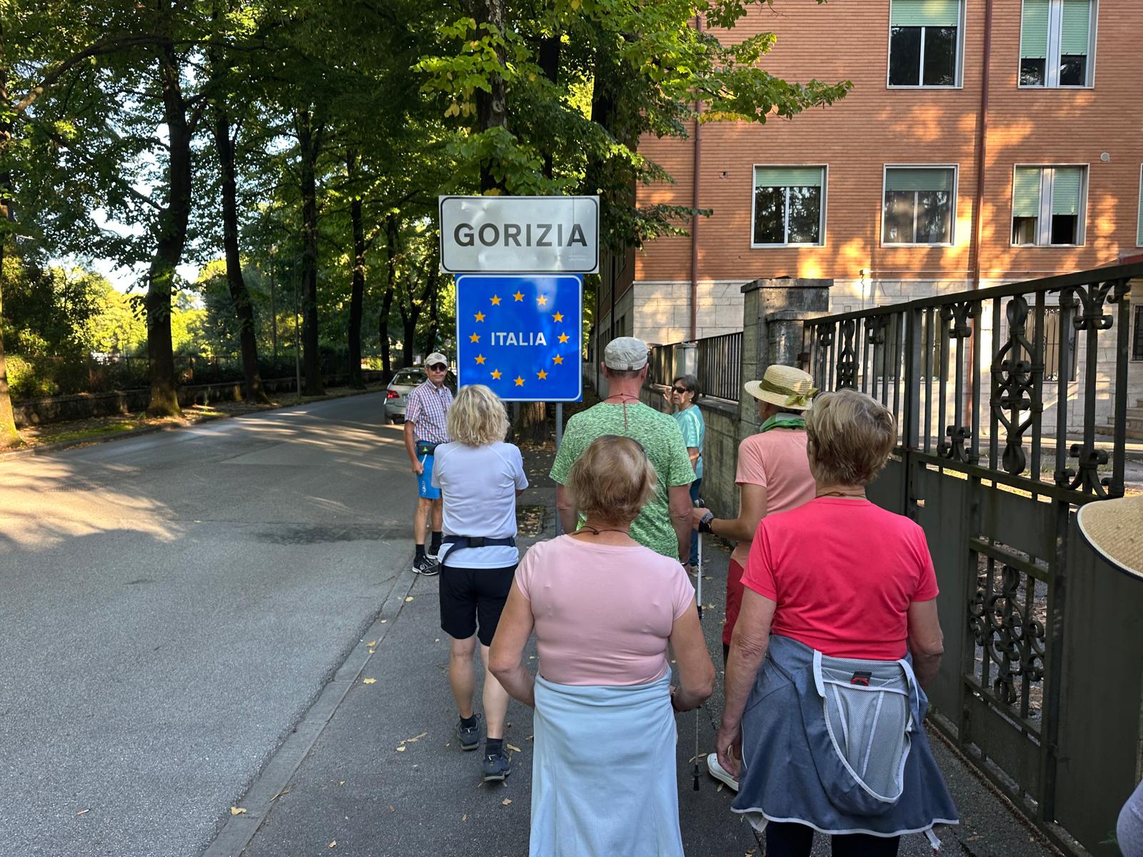 Diese Burg war dann am nächsten Tag der Ausgangspunkt für einen Stadtrundgang mit Stadtführerin Elbrich Bos. Sie erklärte uns die lange Geschichte der 1001 gegründeten Stadt, das Geschlecht der Grafen von Görz, die auch die Grafen von Tirol waren, und die blühende Entwicklung in der Zeit der Habsburger. Die Stadt erlebte im 20. Jahrhundert sehr schwere Zeiten und erst in jüngster Zeit konnte mit der Kulturhauptstadt GO 2025 ein starkes verbindendes Zeichen gesetzt werden. Am frühen Nachmittag wurde der alte Bahnhof Transalpina mit seinem Vorplatz besucht. Eine Bodenmarkierung zeigt die Grenze zwischen Italien und Slowenien. Viele nutzten den Platz, mit einem Bein in Italien und mit anderen in Slowenien zu stehen. Auf dem Weg zum Mittagessen fanden wir einen speziellen Pavillon mit Kärnten Bezug: akustisch konnte man Gedichte von Ingeborg Bachmann auf Italienisch und Deutsch anhören.
