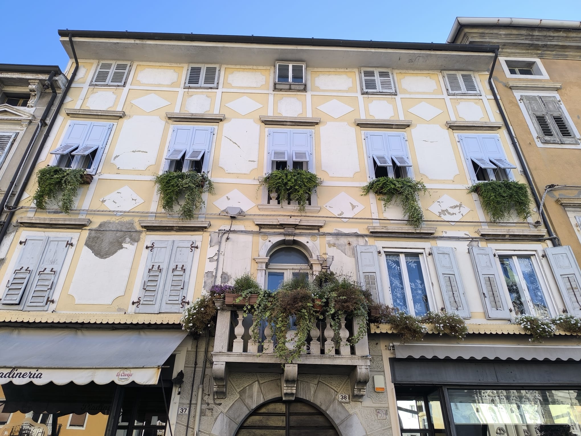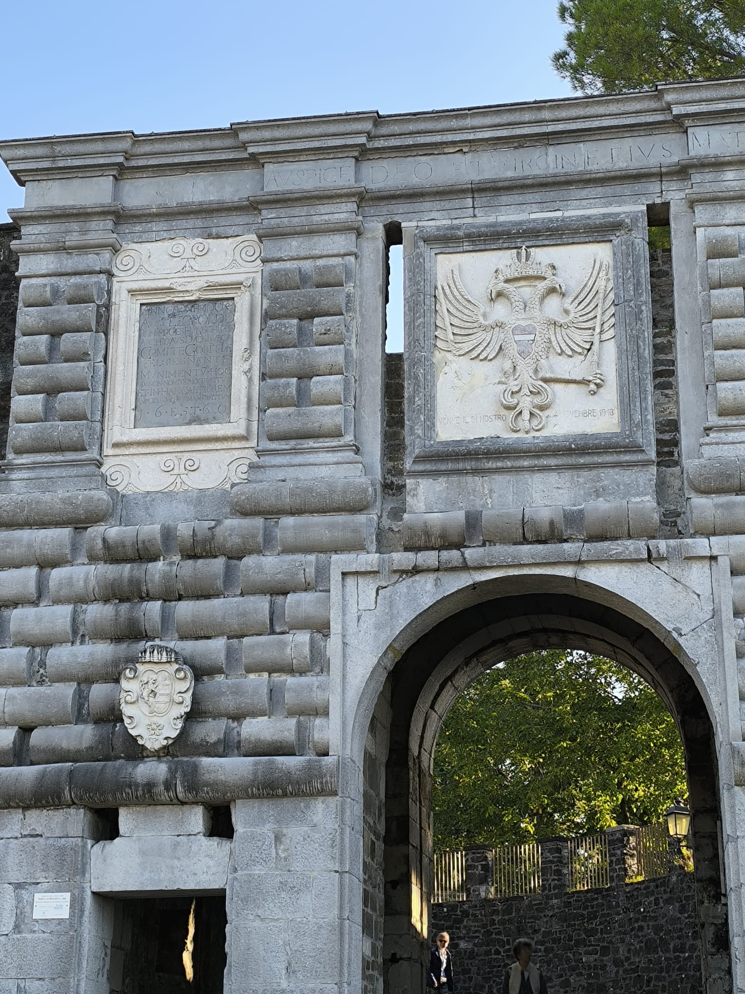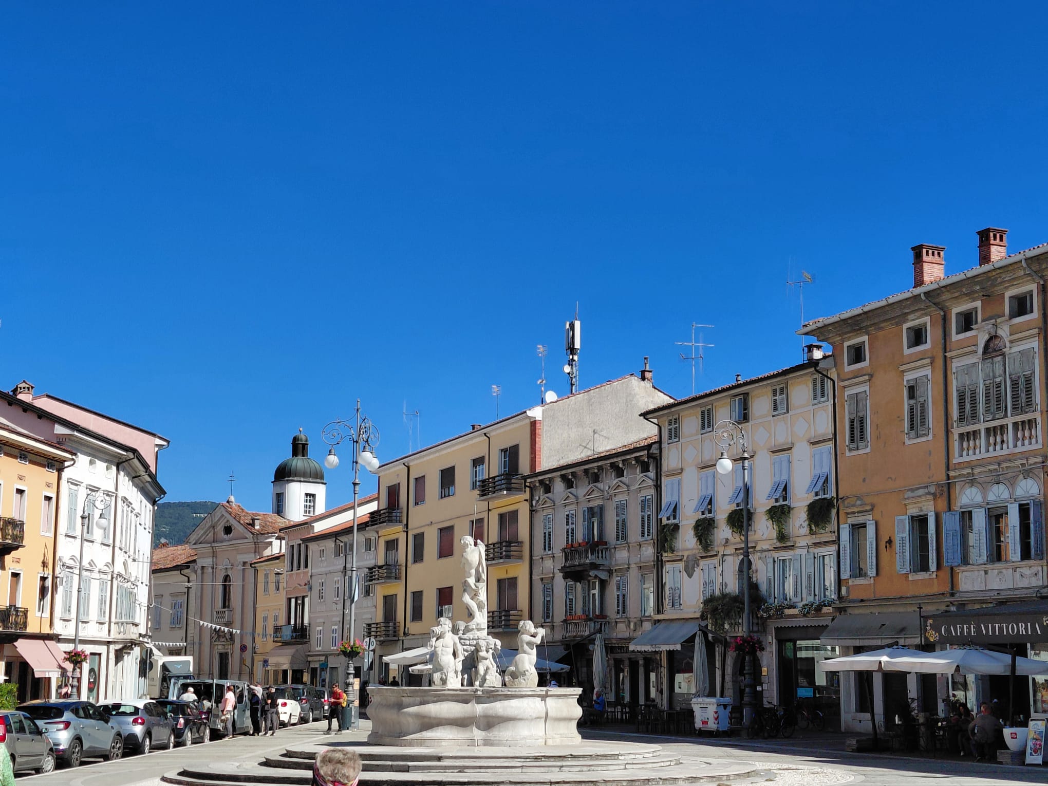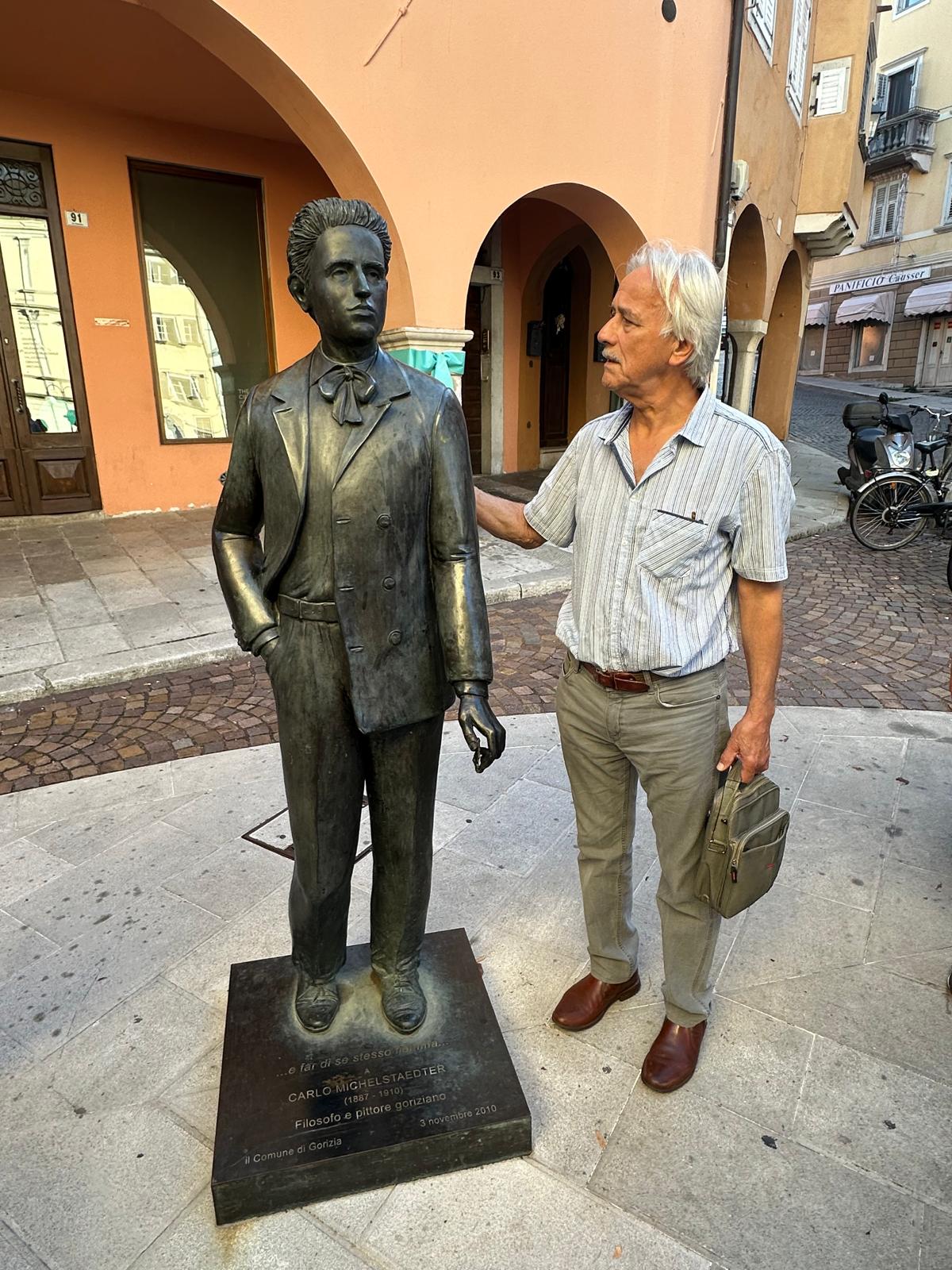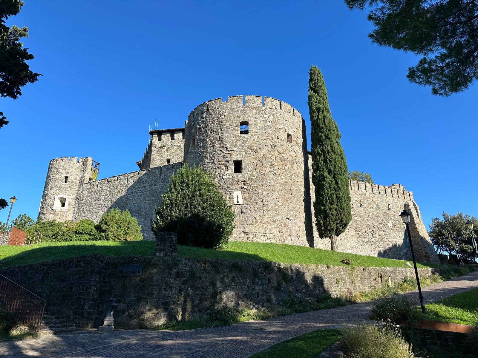Diese Burg war dann am nächsten Tag der Ausgangspunkt für einen Stadtrundgang mit Stadtführerin Elbrich Bos. Sie erklärte uns die lange Geschichte der 1001 gegründeten Stadt, das Geschlecht der Grafen von Görz, die auch die Grafen von Tirol waren, und die blühende Entwicklung in der Zeit der Habsburger. Die Stadt erlebte im 20. Jahrhundert sehr schwere Zeiten und erst in jüngster Zeit konnte mit der Kulturhauptstadt GO 2025 ein starkes verbindendes Zeichen gesetzt werden. Am frühen Nachmittag wurde der alte Bahnhof Transalpina mit seinem Vorplatz besucht. Eine Bodenmarkierung zeigt die Grenze zwischen Italien und Slowenien. Viele nutzten den Platz, mit einem Bein in Italien und mit anderen in Slowenien zu stehen. Auf dem Weg zum Mittagessen fanden wir einen speziellen Pavillon mit Kärnten Bezug: akustisch konnte man Gedichte von Ingeborg Bachmann auf Italienisch und Deutsch anhören.
