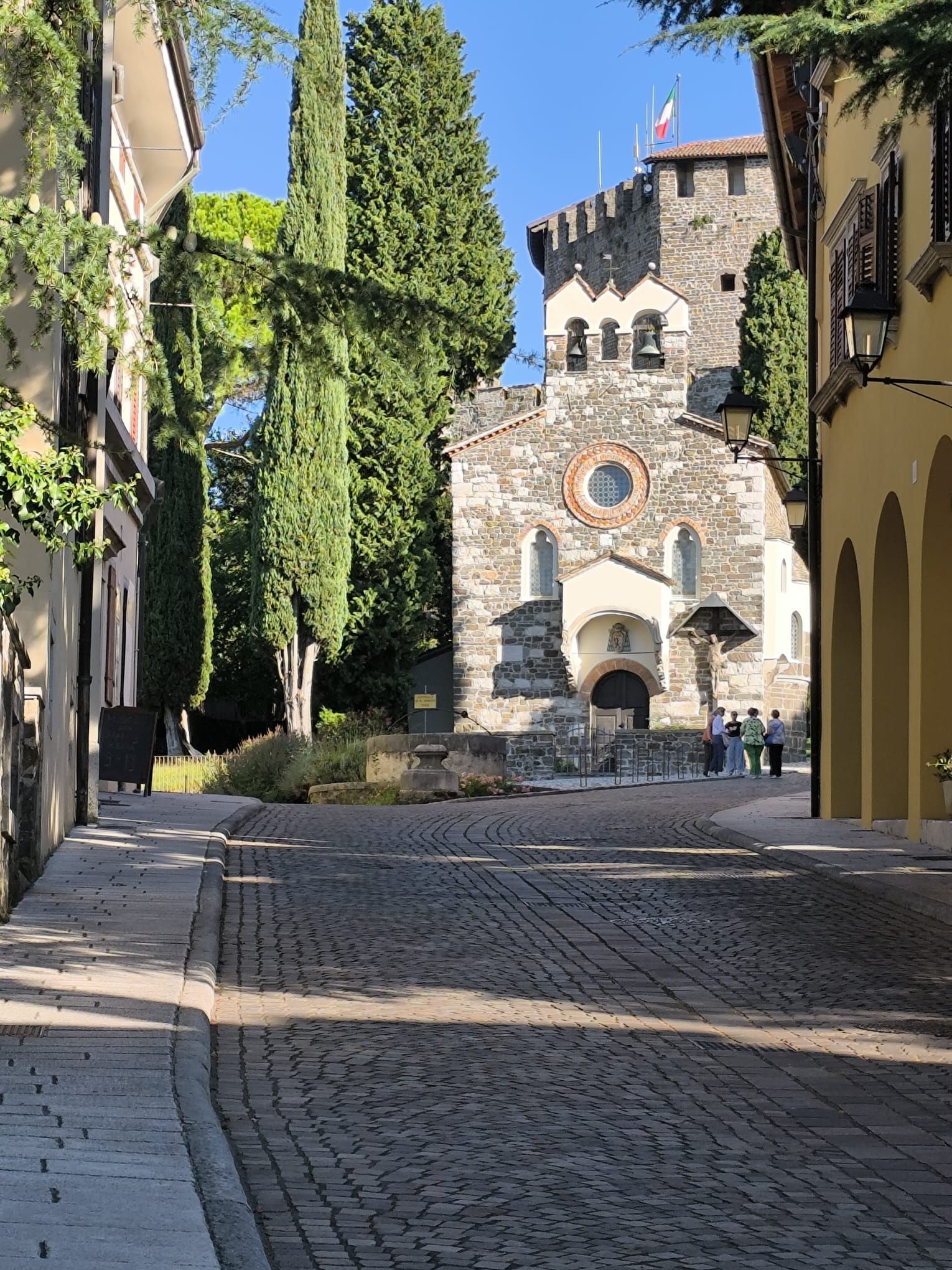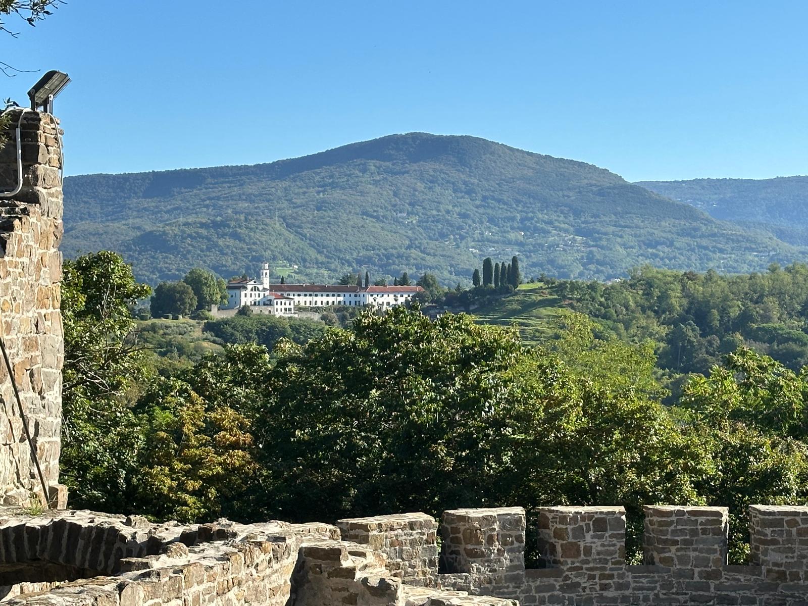 Unterwegs zu unserem Hotel in Šempeter erklommen wir noch den Hügel zum Franziskanerkloster Kostanjevica, wo wir im Abendlicht die Silhouette der Burg Görz erblickten.