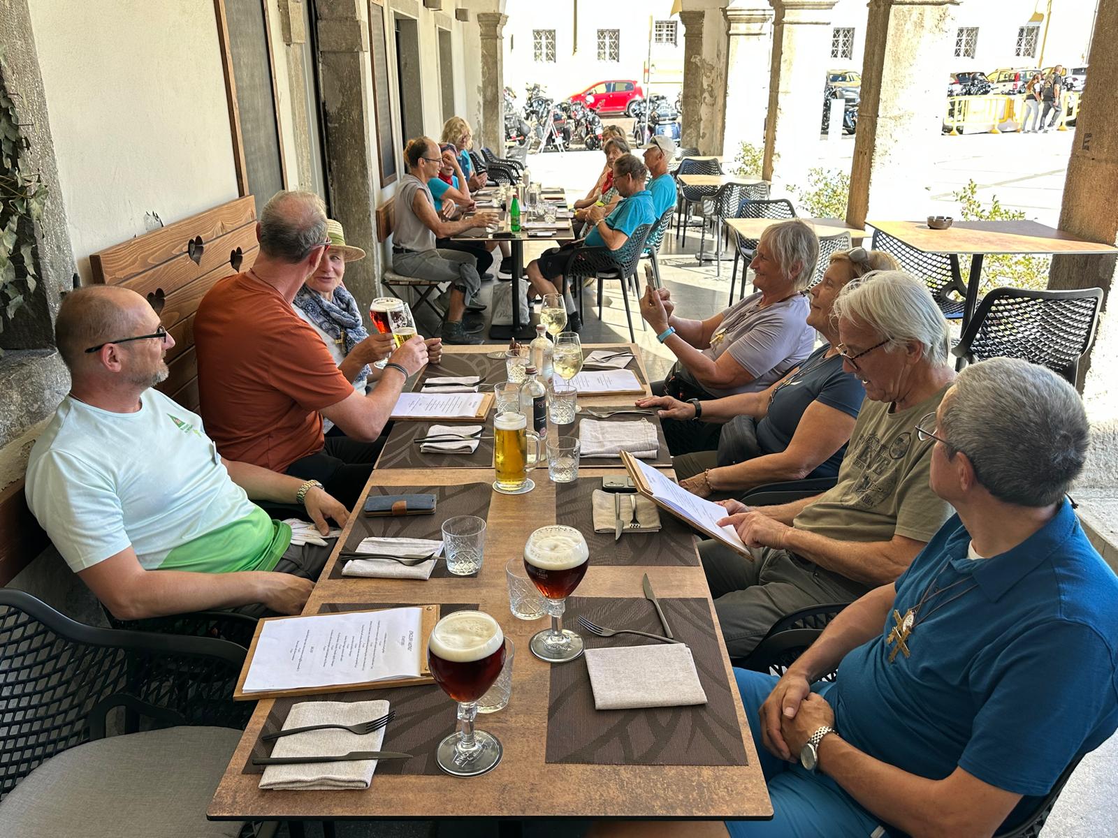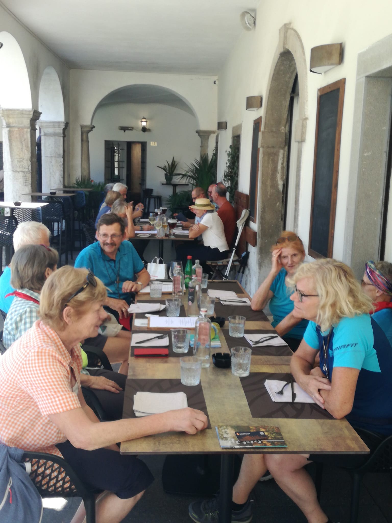 Ganz ruhig ließen wir den letzten Tag ausklingen. Gemütlich ging es durch die Stadt zum berühmten Palazzo Atems Petzenstein. Dort besichtigten wir die multikulturelle und regionale Ausstellung. Diese hatte viele Bezüge zu den Habsburgern und Österreich. Sehr beeindruckend ist die Ausstellung des in der Nähe von Görz geborenen Malers Zoran Music. Er studierte Kunst in Zagreb, verbrachte seine Jugendzeit an der dalmatinischen Küste und wurde kurz vor Kriegsende in Dachau interniert. Später lebte er in Venedig und Zürich und hatte in allen wichtigen Kunststätten, wie Paris und New York Ausstellungen. Es gibt unterschiedliche Werke aus seinen verschiedenen Schaffensperioden. Auffällig sind seine düsteren Bilder, die er in den achtziger Jahren geschaffen hatte und wohl seine Zeit im KZ aufarbeite. „Atmosfere La Stüa“ war nach einem kurzen Stadtbummel die letzte Station auf unserer Pilger-Wanderreise, wie abschließend Hannes diese Pilgerveranstaltung im heiligen Jahr neu benannte. Dort gab es zum Abschluss ein herrliches italienisches Essen.
