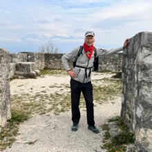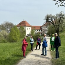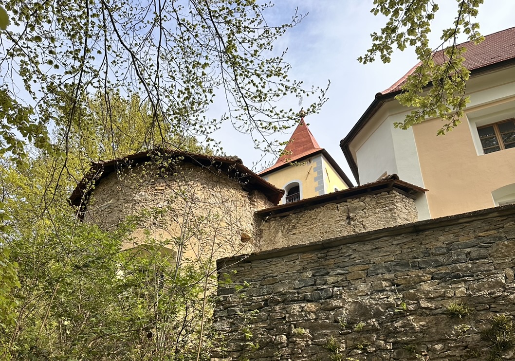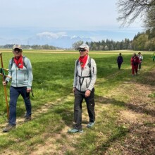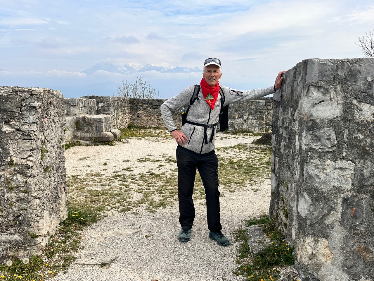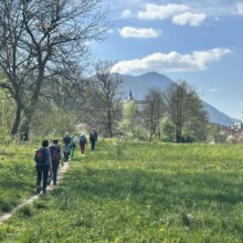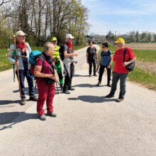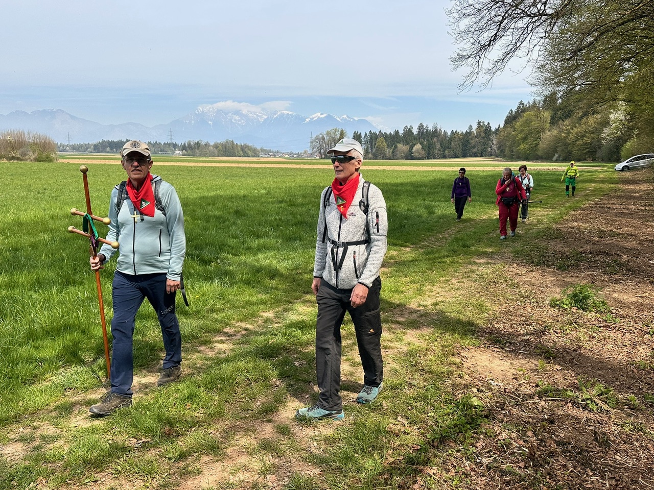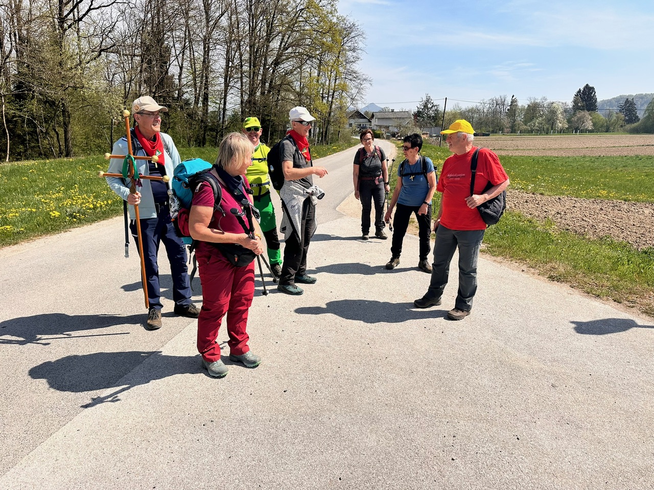 Nach einer kurzen Andacht in der modernen Kapelle des Klosters Repnje wanderten die Pilgerinnen und Pilger auf der Etappe S07 des Benedikt-Pilgerweges, zunächst zur Kirche Sv. Tilen, die gerade restauriert wird und einer kleinen befestigten Burg mit ihren beiden Türmen gleicht. Beschaulich ging es auf Waldwegen unter den frisch ‚ausschlagenden‘ Bäumen zu Burgruine (Stari Grad) Smlednik, diese bietet einen herrlichen Rundblick durch das Krainer Feld. Der Triglav – nicht aber die Steiner Alpen- zeigte sich wenn auch etwas verhangen.