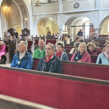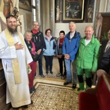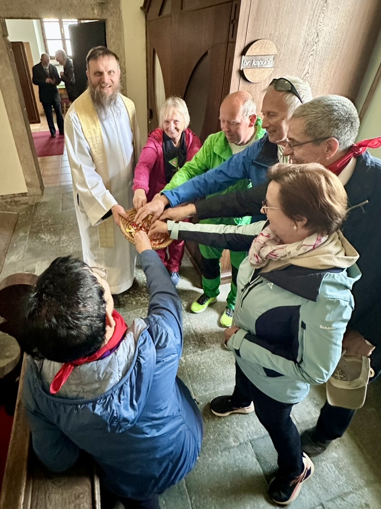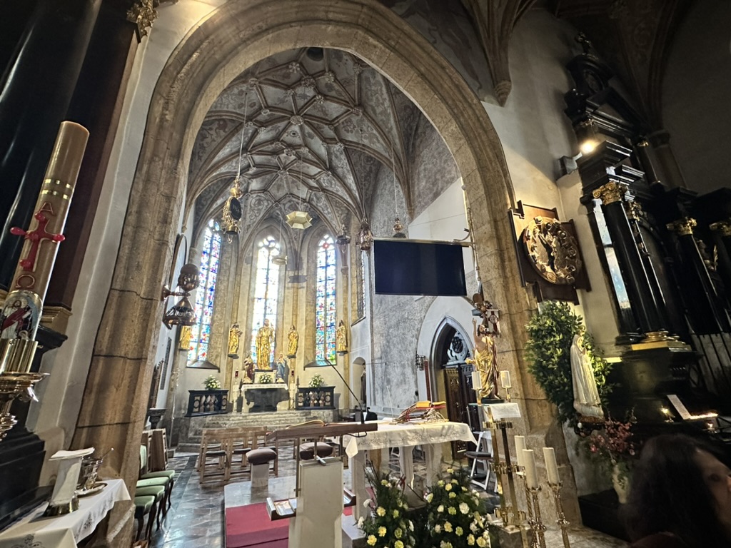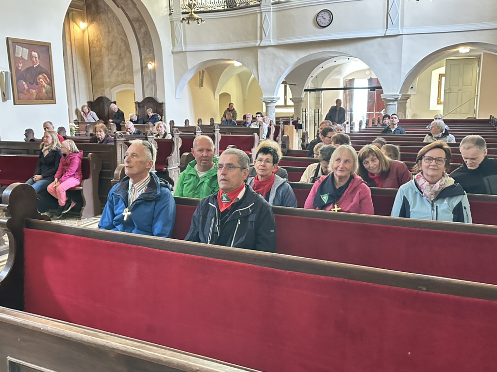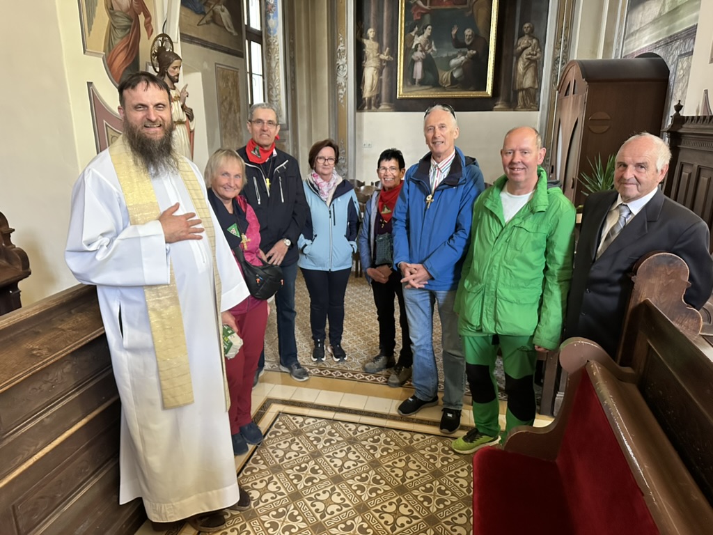 Im Kapuzinerkloster, in deren Bibliothek heute noch eine Kopie des Passionsspiels aufbewahrt wird, besichtigten die Pilgerinnen und Pilger zunächst die P. Pius Kapelle und nahmen in der vollbesetzten Kirche an der Hl. Messe teil. Dort wurden sie von Br. Jurij Štravs herzlich begrüßt. Br. Jurij feierte an diesem Tag mit der Kirchengemeinde auch seinen 50-igsten Geburtstag. Unsere Pilgergruppe fand sich nach der feierlichen Messe ebenfalls mit einem spontanen Ständchen ein.