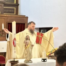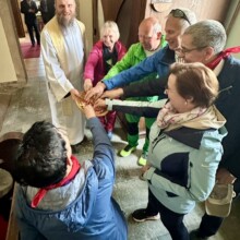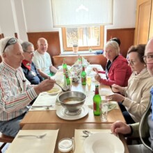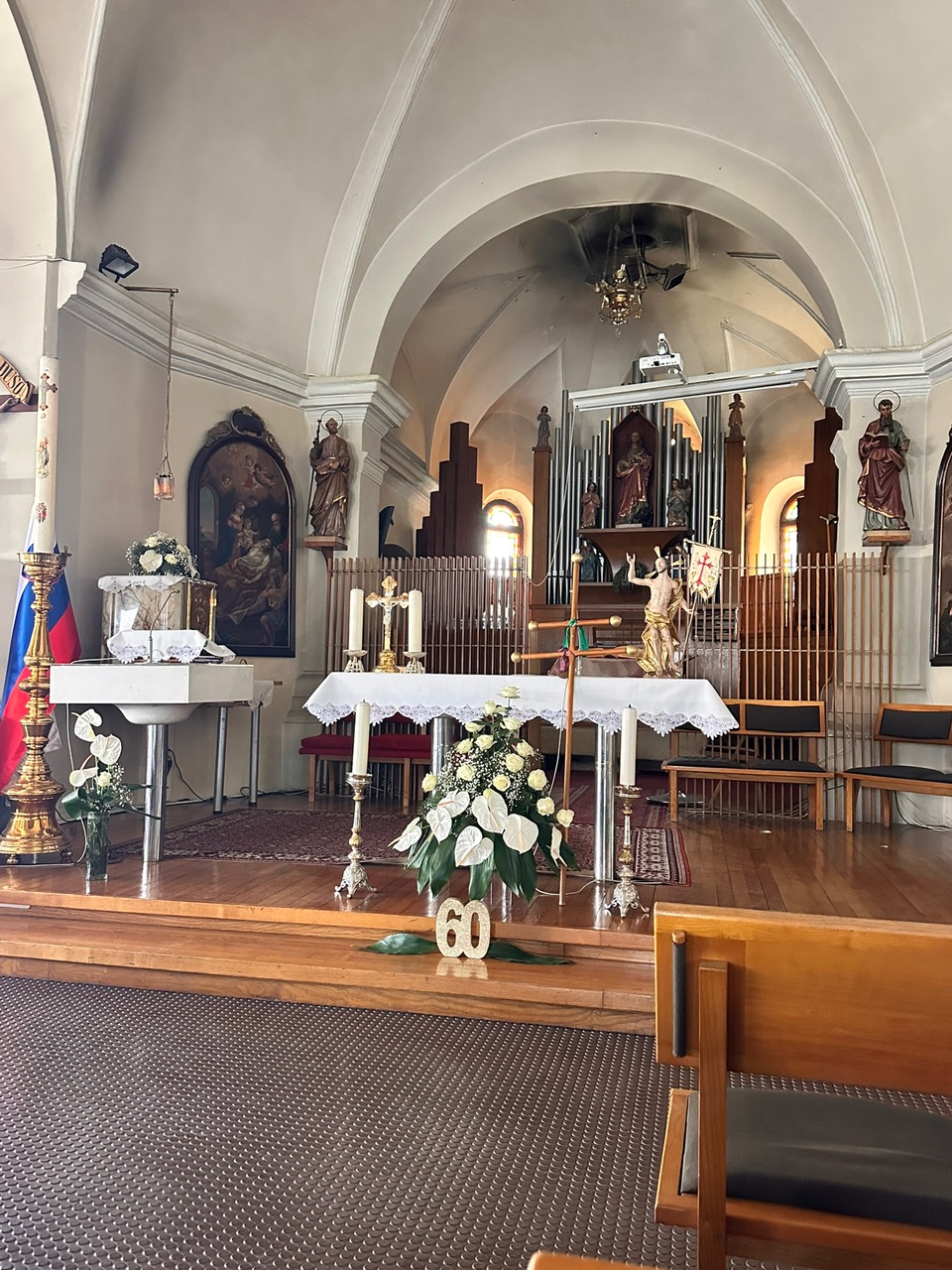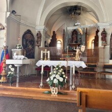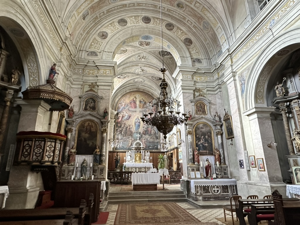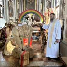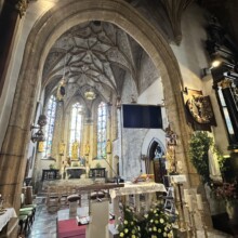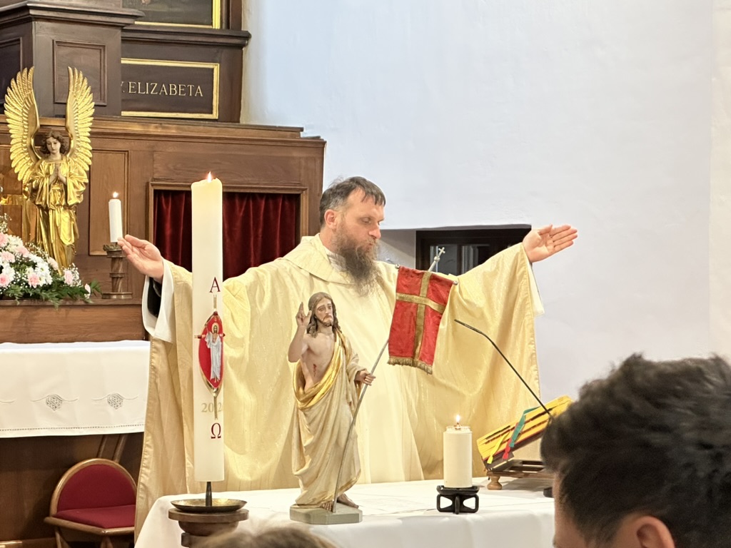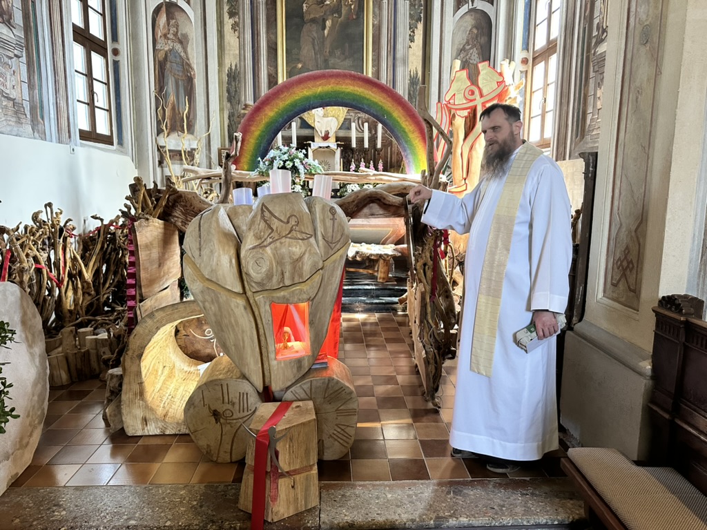 Im Kapuzinerkloster, in deren Bibliothek heute noch eine Kopie des Passionsspiels aufbewahrt wird, besichtigten die Pilgerinnen und Pilger zunächst die P. Pius Kapelle und nahmen in der vollbesetzten Kirche an der Hl. Messe teil. Dort wurden sie von Br. Jurij Štravs herzlich begrüßt. Br. Jurij feierte an diesem Tag mit der Kirchengemeinde auch seinen 50-igsten Geburtstag. Unsere Pilgergruppe fand sich nach der feierlichen Messe ebenfalls mit einem spontanen Ständchen ein.