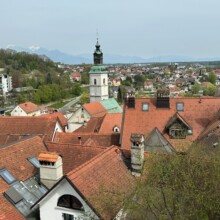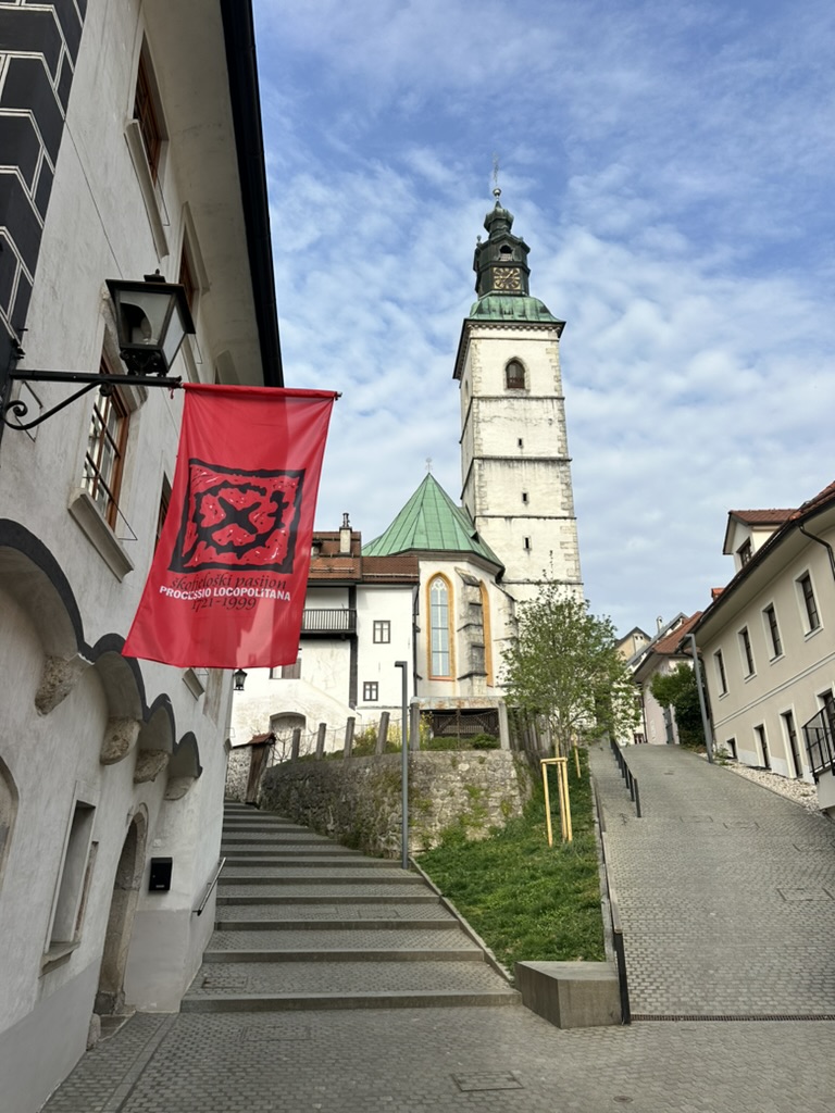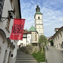 Nach rd. 19km – verwendete ‚Schrittmesser‘ der TeilnehmerInnen zeigten unterschiedliche Längen – erreichte die kleine Pilgergruppe die historische Stadt Škofja Loka (Bischofslack), eine Gründung der Bischöfe von Freising, deren Regentschaft hier bis 1803 dauerte und die Entwicklung der Stadt auf das Engste prägte.