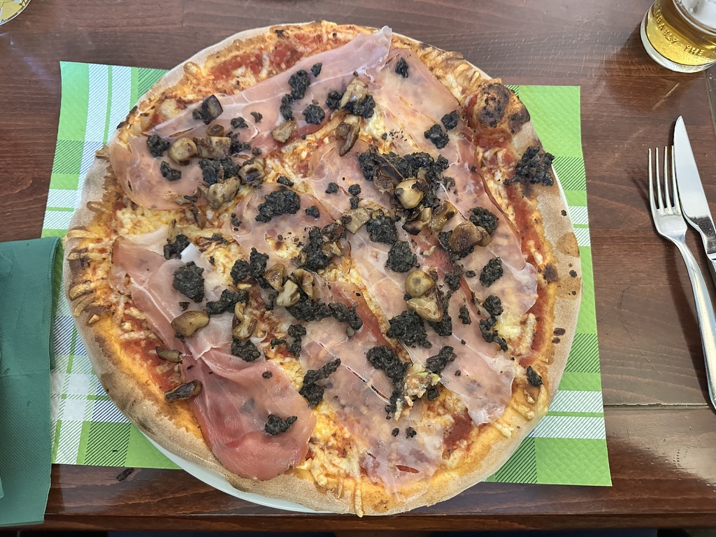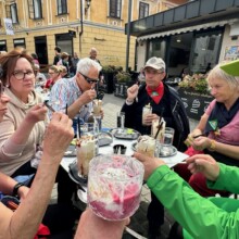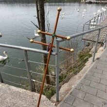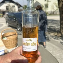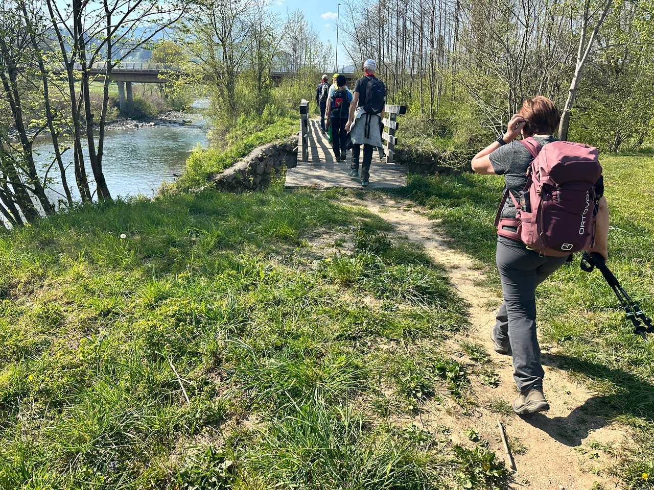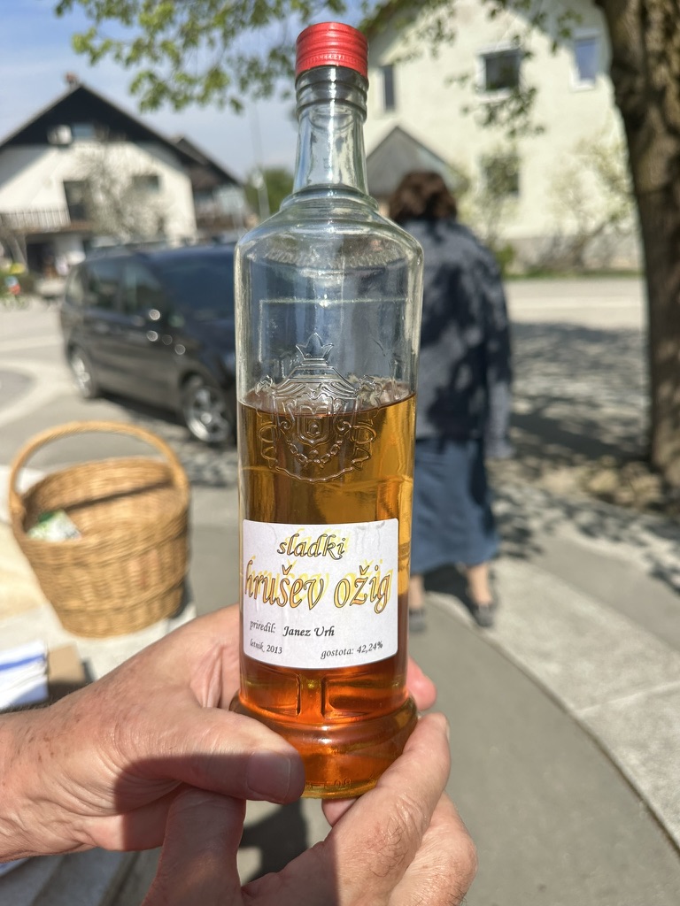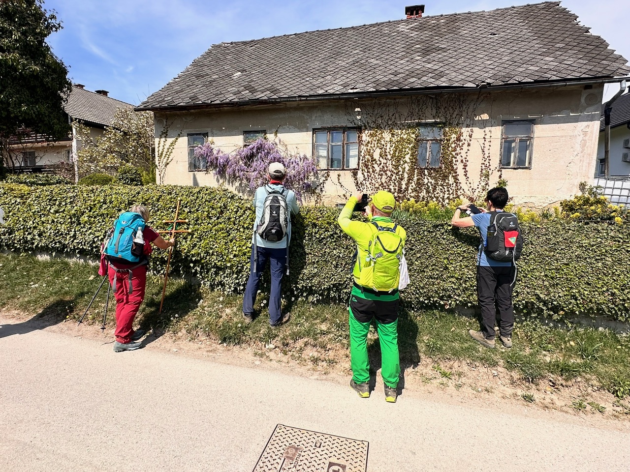 Steil geht es von der Burg hinunter und entlang der Kreuzwegstationen von Sv. Valburga. Alsbald querten wir die Save und bestaunten bei einem Eis die vielen Schwäne am Stausee Zbilje. Nahezu eben ist der weitere Weg, zunächst ein herrlicher Waldpfad, dann Wiesen- und Ortschaftswege entlang der Dörfer auf dem oberen Plateau des Sora-Tales. In Reteče begrüßte uns Janez Urch Izvir, unser ‚Amici‘ von Škofja Loka, der uns mit seiner Gattin herzlich bewirtete. Er schenkte uns auch einen selbstgemachten Schnaps mit Pfirsichlikör ein. Janez zeigte sich auch um unser Wohlbefinden und die weiteren Reisepunkte in Škofja Loka sehr besorgt und erledigte alles zur besten Zufriedenheit, vielen Dank dafür.