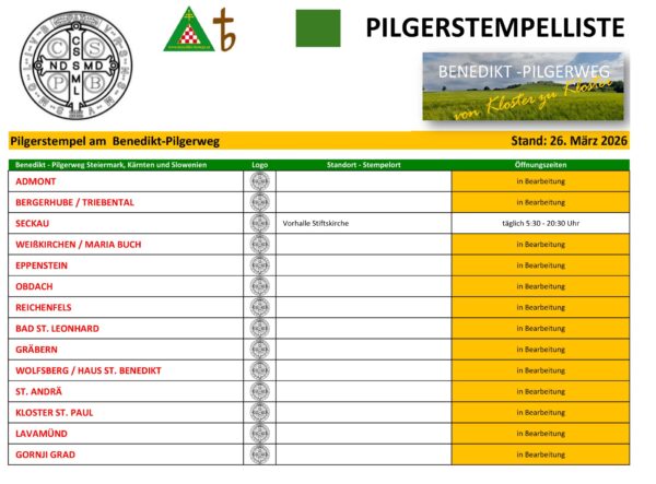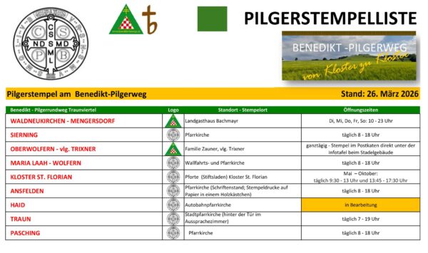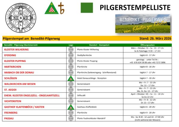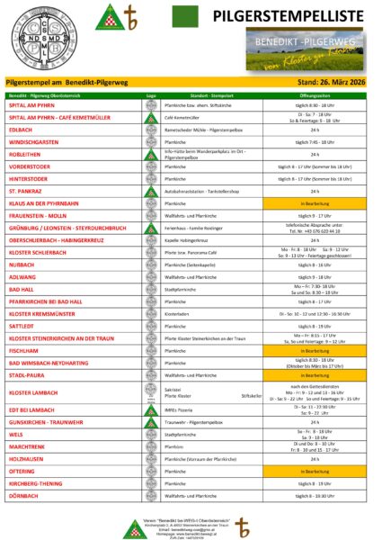 Untenstehend finden Sie für den Benedikt-Pilgerweg in Oberösterreich eine „Stempelliste“ , d.h. eine Übersicht, wo und zu welchen Uhrzeiten persönlich ein Stempel gemacht werden kann.